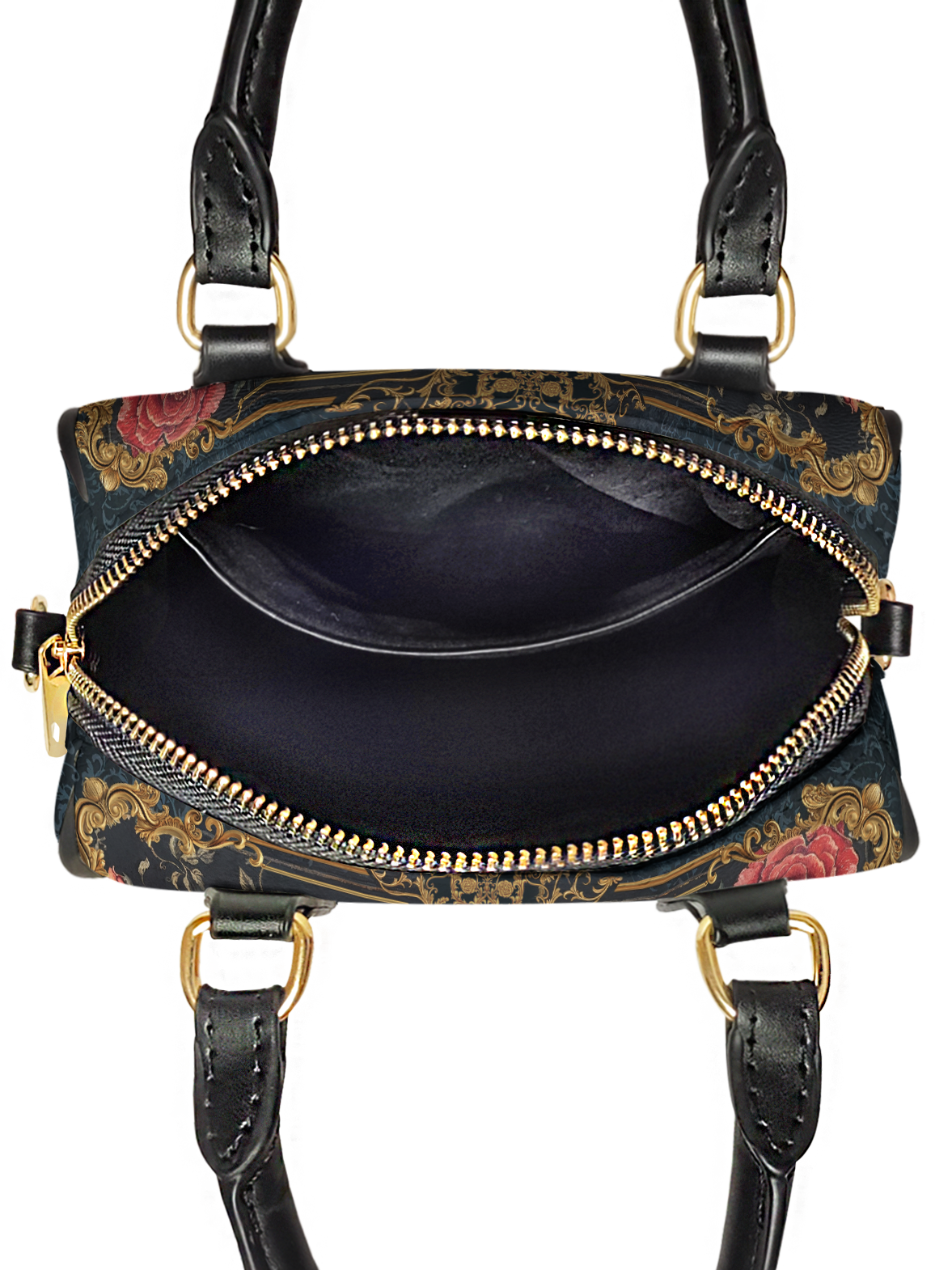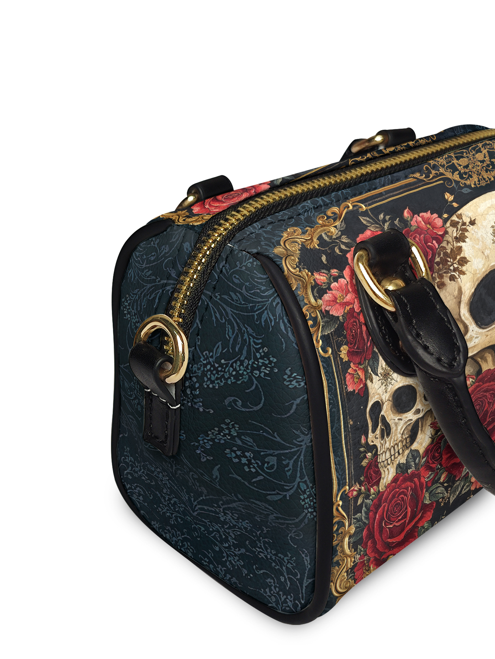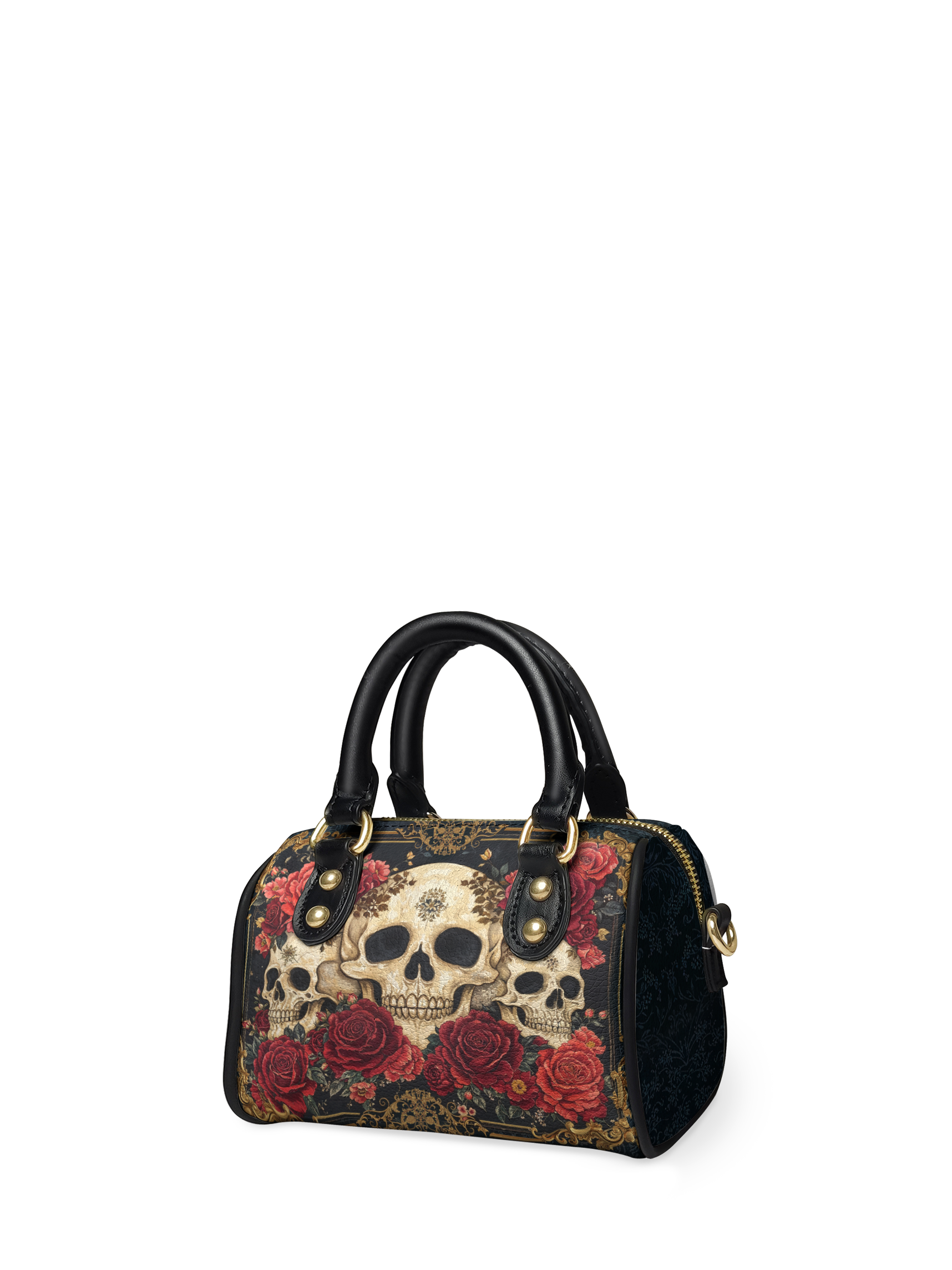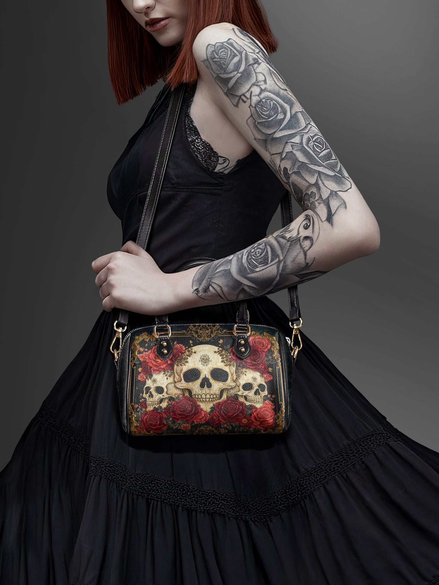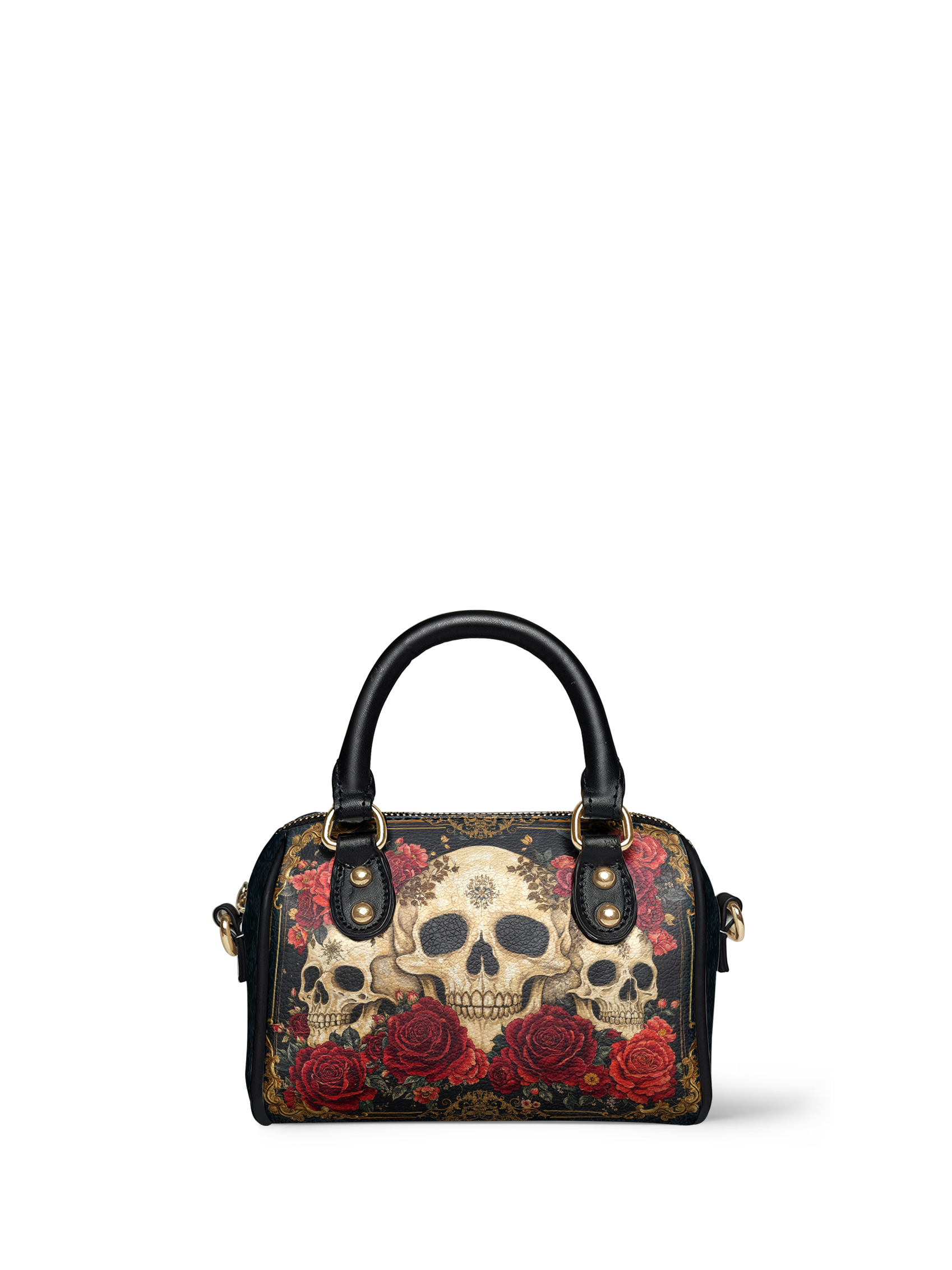The Bloodrose mini satchel is fierce, floral, and flawlessly gothic. Featuring a richly detailed design of three weathered skulls resting atop a bed of blood-red roses and golden filigree, this compact bag makes a bold statement without saying a word. With structured handles, a detachable strap, and luxe vegan leather, it’s perfect for nights out or adding an edge to your daily look. For the ones who carry beauty and darkness hand in hand—this one’s yours.