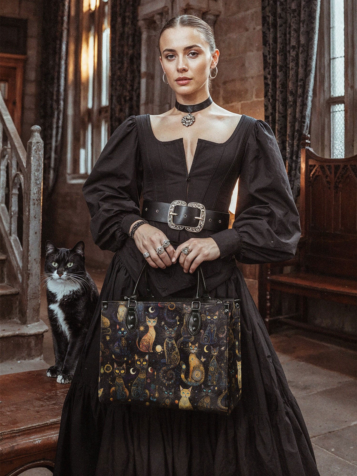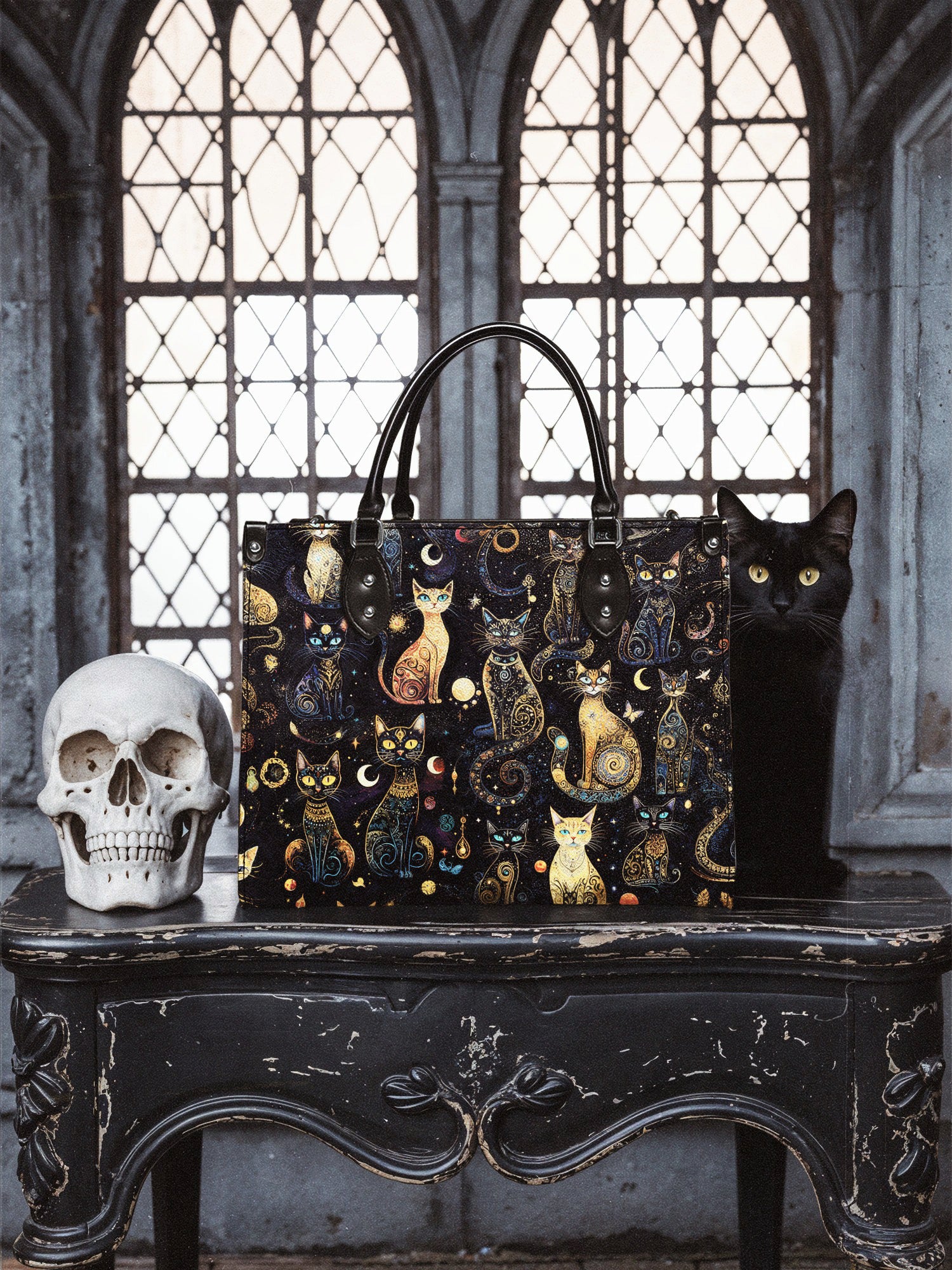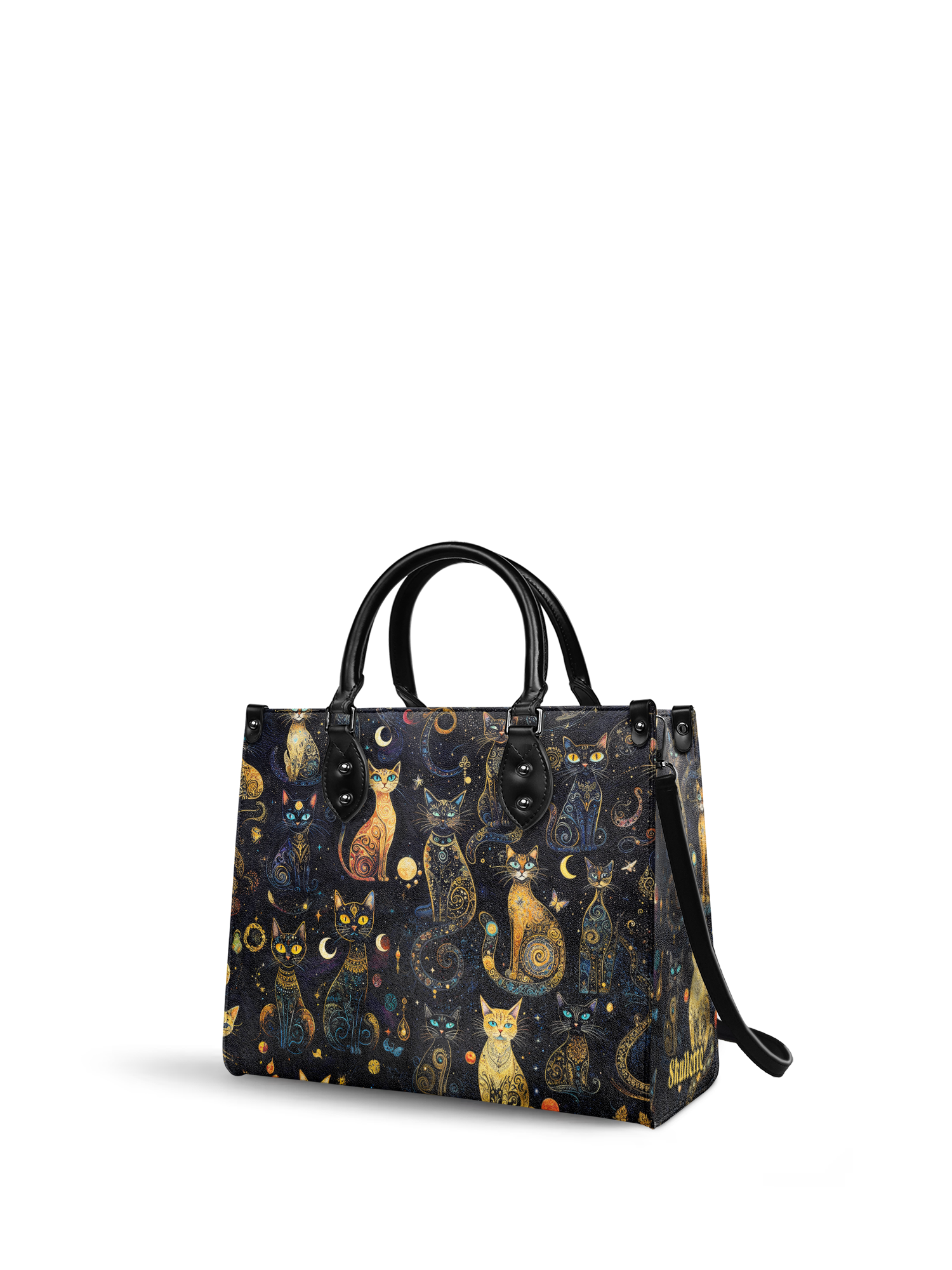 The Lunacat leather handbag is a spellbinding blend of feline grace and celestial mystery. Wrapped in a tapestry of moonlit cats—each adorned with cosmic swirls, stars, and lunar motifs—this bag turns every glance into a second look. Set against a deep midnight background, the gold and sapphire accents shimmer like stardust. With structured handles, sleek silhouette, and rich leather texture, it’s perfect for the cat lover with a cosmic soul. Whether you’re prowling through the city or moon-gazing in silence, Lunacat keeps your style aligned with the stars.