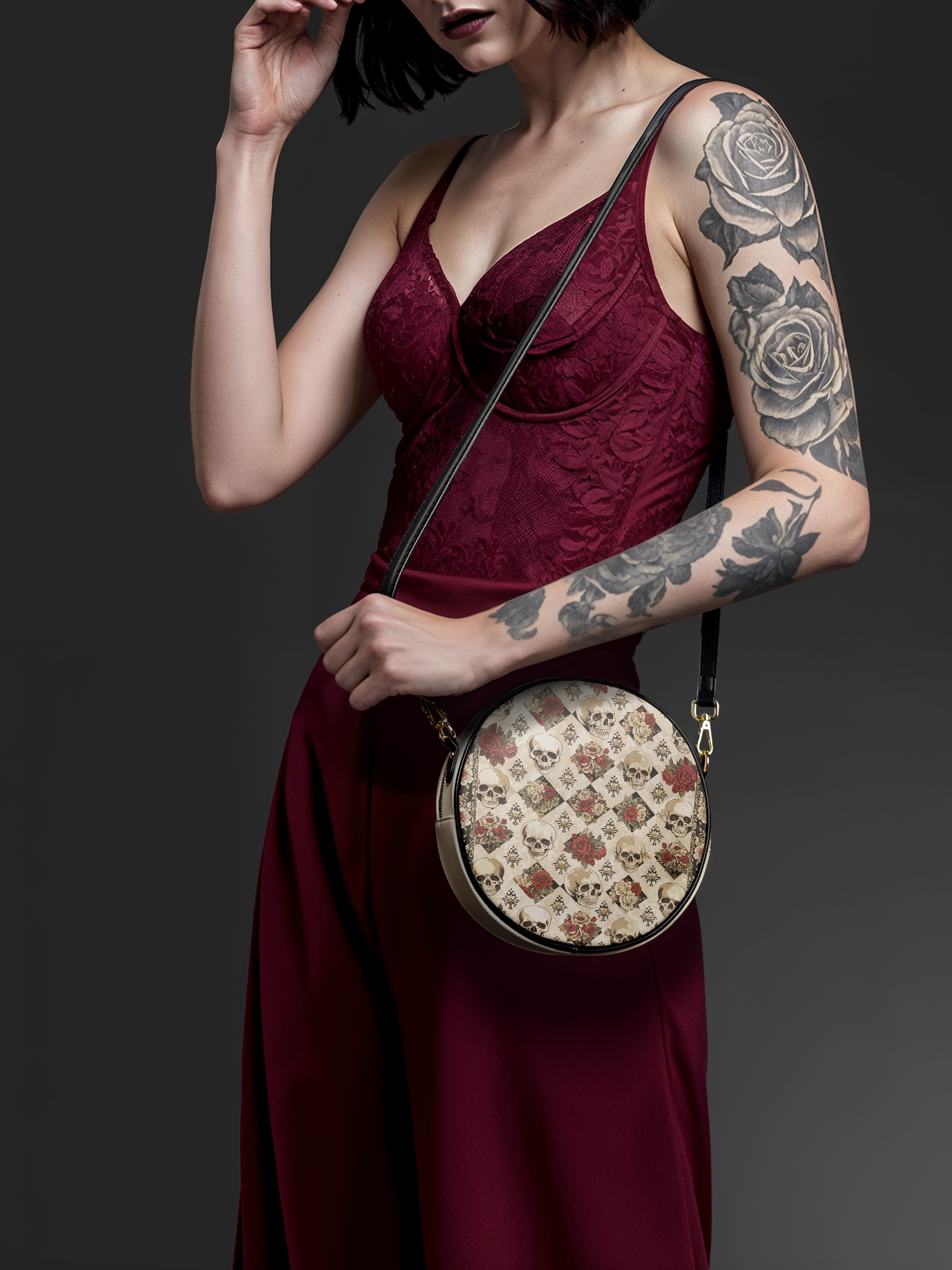 The Mournaire circle crossbody is a hauntingly elegant nod to Victorian mourning and vintage romance. A patchwork of skulls, roses, and antique florals weaves across the surface like a gothic quilt—each tile a whisper from the past. With its warm sepia tones and ornate detail, this bag carries the beauty of decay and the grace of memory. For lovers of old souls, dark florals, and stories stitched in shadow.