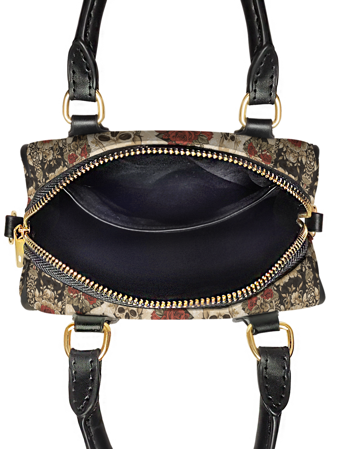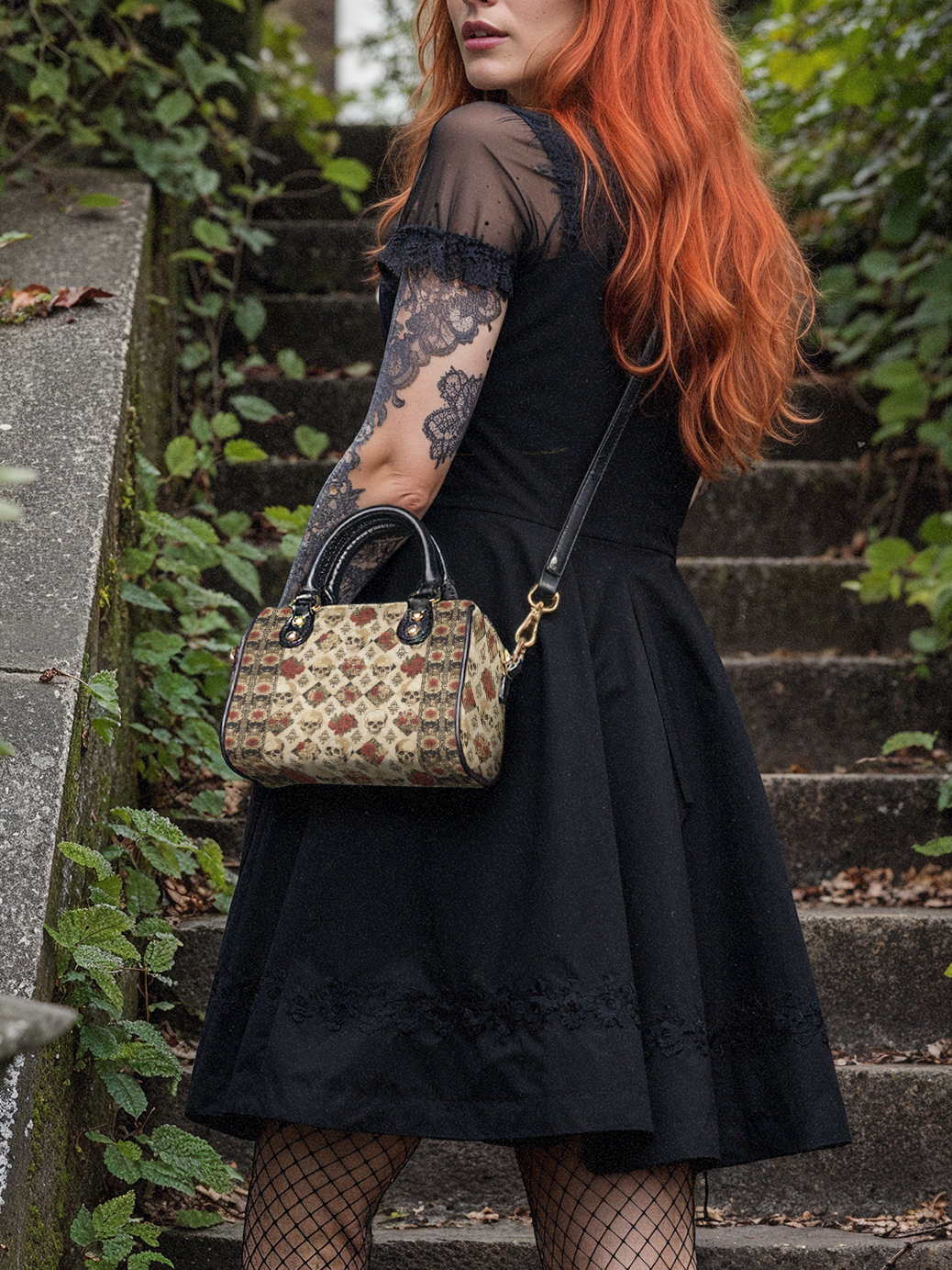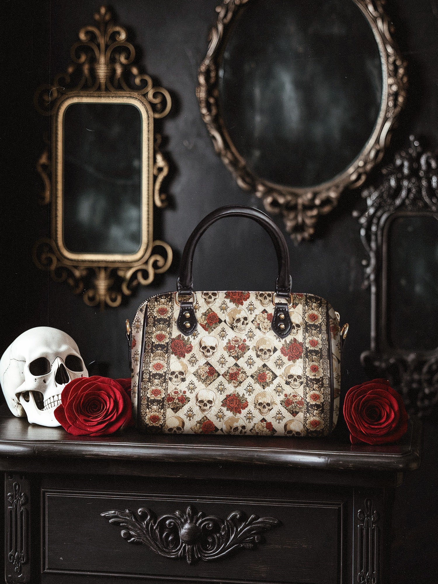 The Mournaire mini satchel is a love letter to the beautifully morbid. With its quilt-like layout of skulls and faded florals, it feels like something unearthed from an old gothic attic—delicate, poetic, and deliciously eerie. Soft ivory, dusty rose, and shadowed black tones give it a vintage charm with a dark heartbeat. It’s for the romantics who mourn with grace and carry a piece of the past wherever they go.