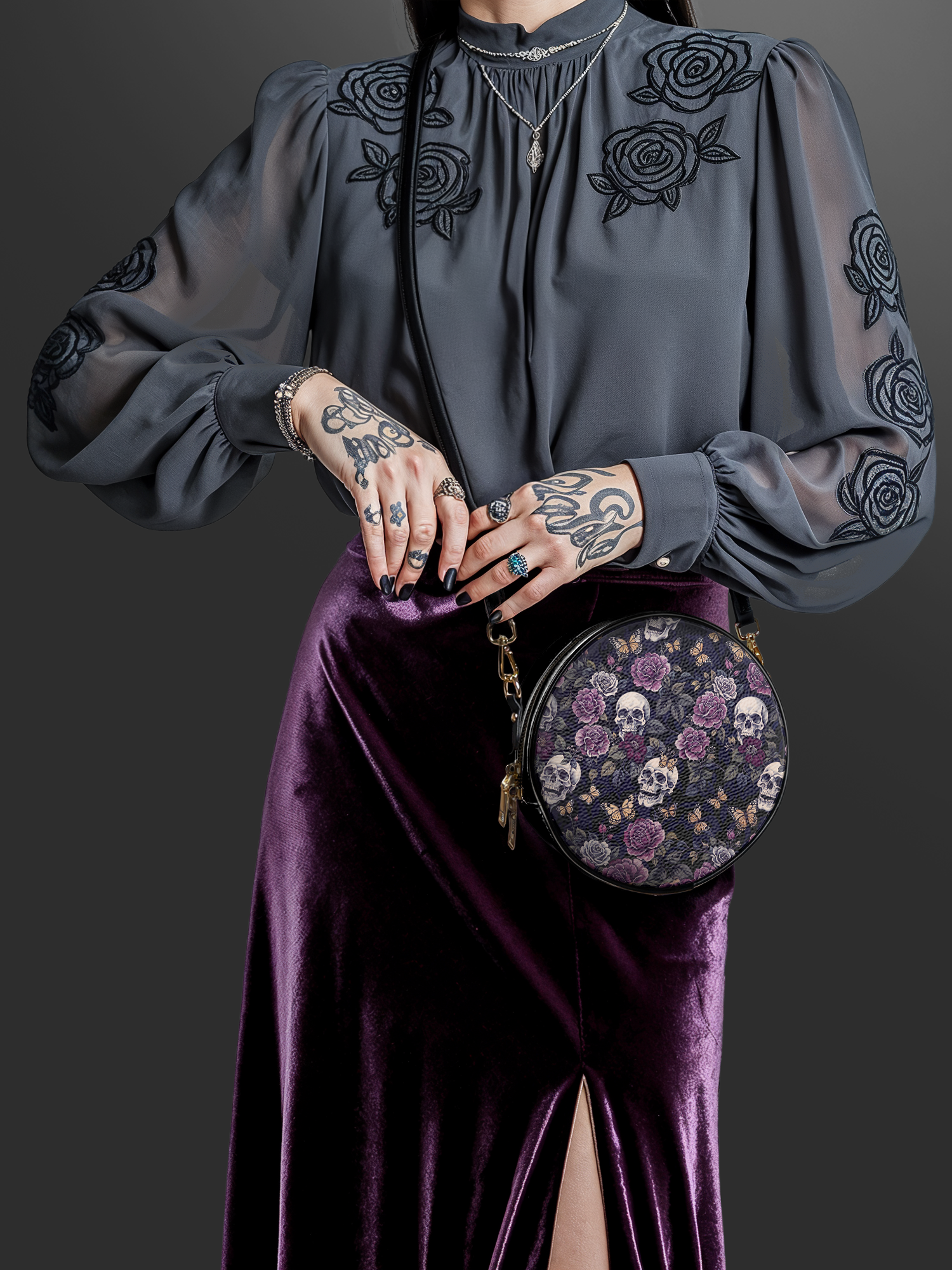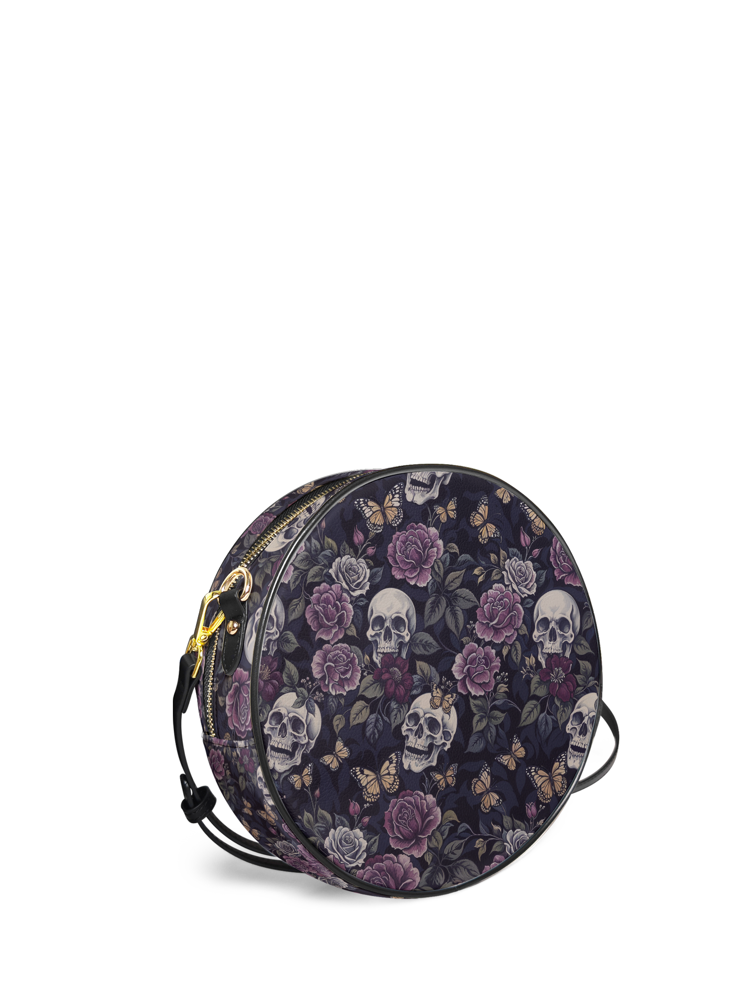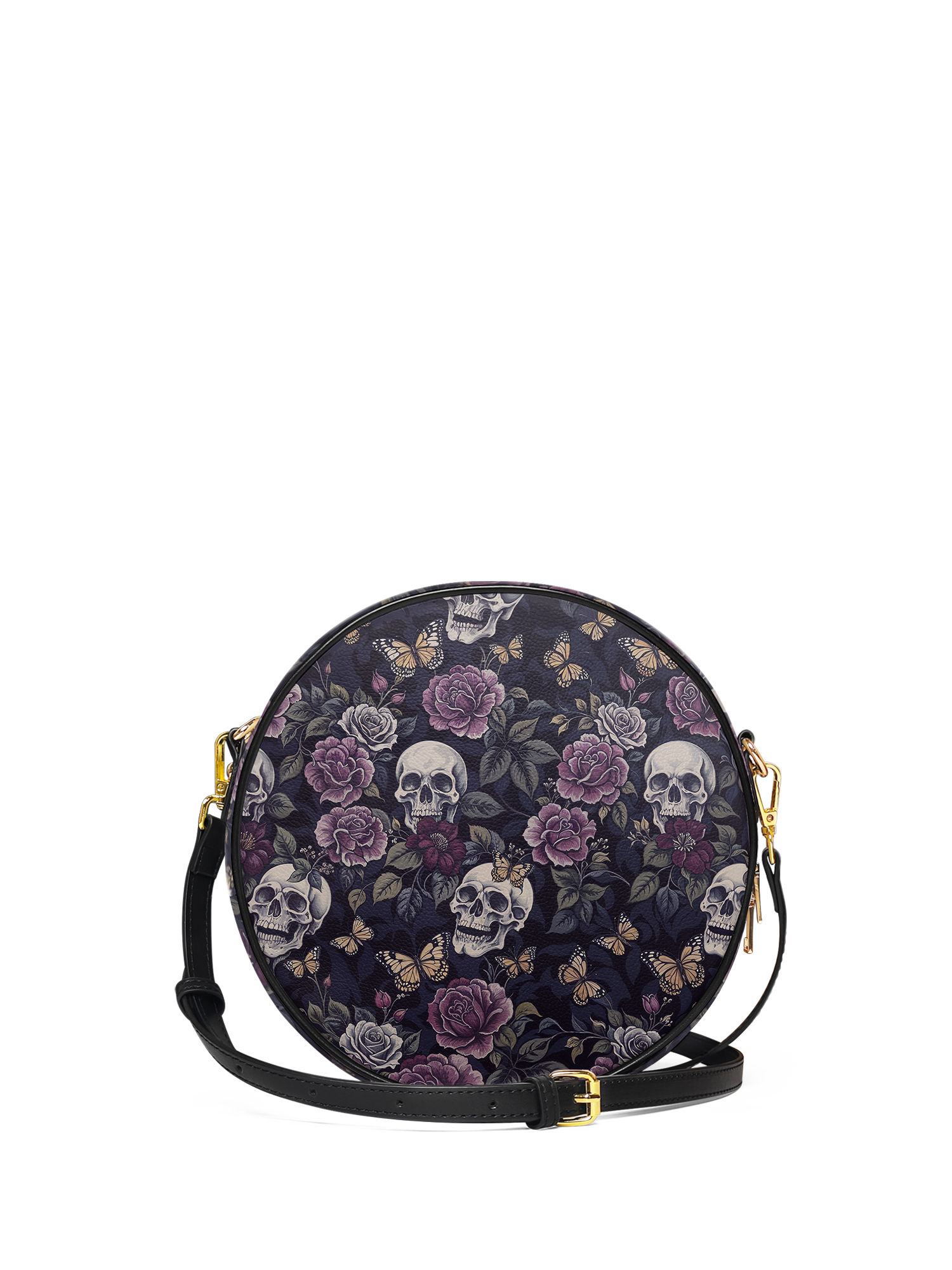 Named Noctaflora—from nocta (night) and flora (flowers)—this circle crossbody captures the dark poetry of nature after dusk. The design is a moody tapestry of violet roses, delicate butterflies, and ivory skulls—each element whispering beauty, decay, and transformation. Set against a deep twilight background, it’s a gothic bloom that never wilts. Perfect for those who find elegance in the eerie, and romance in the shadows.