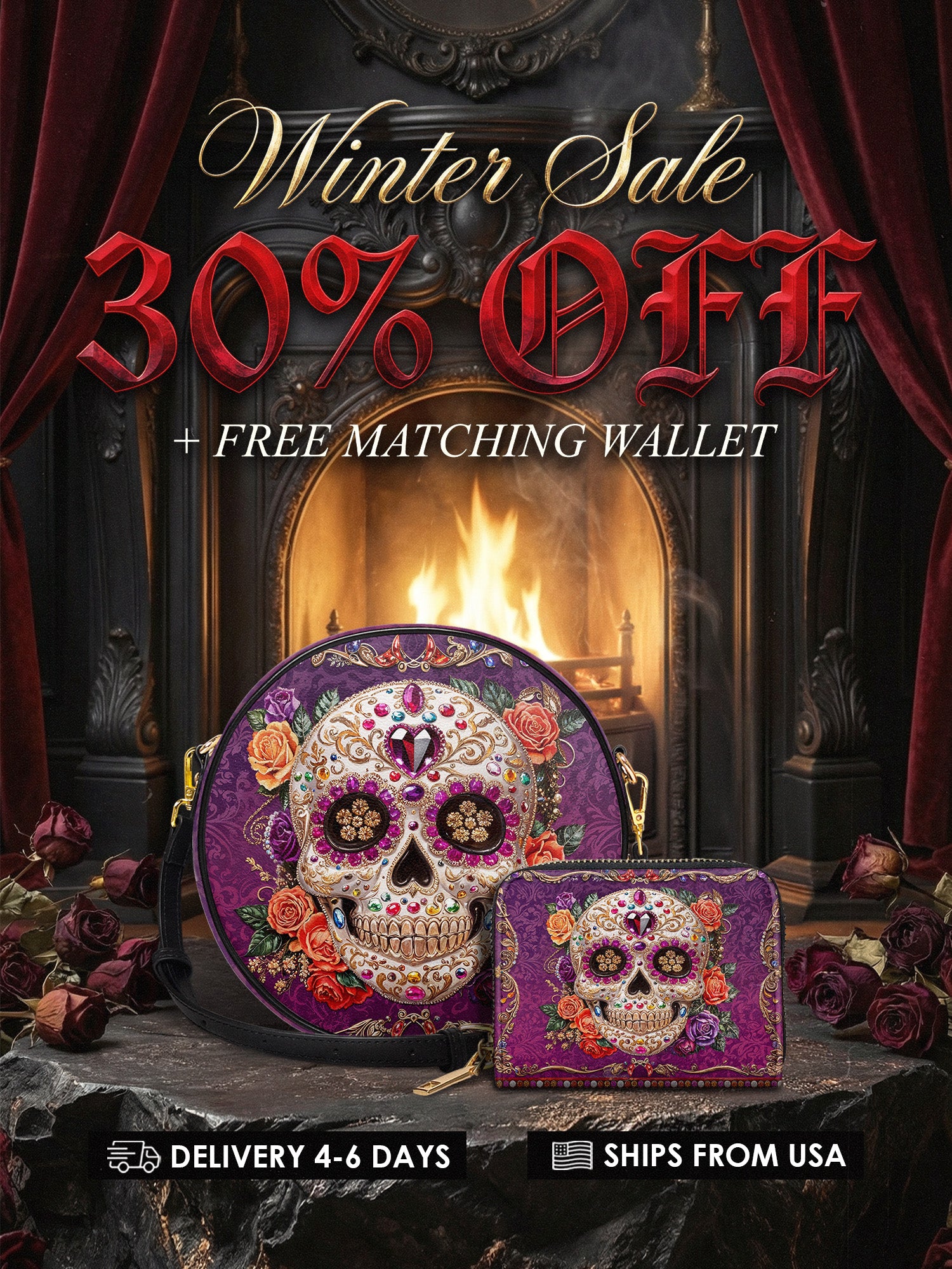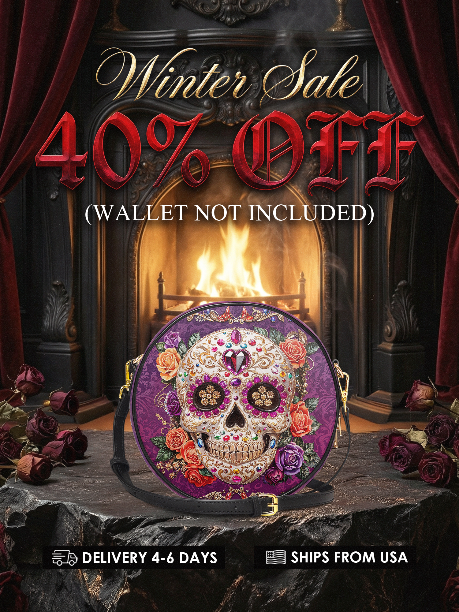 Regal. Radiant. Reverent. The Catrinelle circle crossbody is named in homage to La Catrina—the elegant icon of Día de los Muertos—and reimagined with lavish detail. At its heart, a jeweled sugar skull gleams with gold swirls, sparkling gems, and floral accents in lush purples, oranges, and crimson. Set against a rich baroque backdrop, this bag is a tribute to beauty that transcends life and death. For those who live boldly, honor deeply, and sparkle unapologetically.