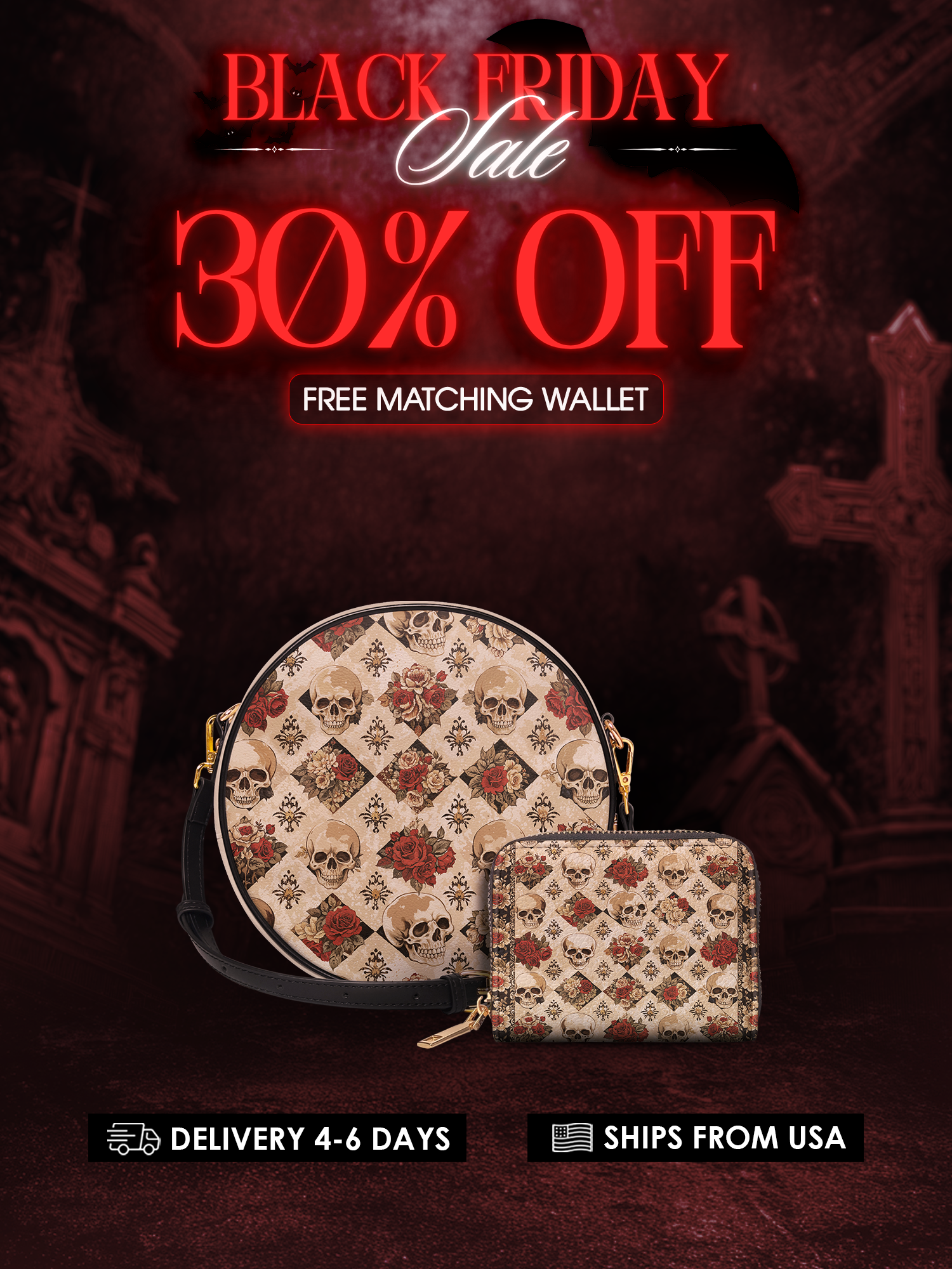 The Mournaire circle crossbody is a hauntingly elegant nod to Victorian mourning and vintage romance. A patchwork of skulls, roses, and antique florals weaves across the surface like a gothic quilt—each tile a whisper from the past. With its warm sepia tones and ornate detail, this bag carries the beauty of decay and the grace of memory. For lovers of old souls, dark florals, and stories stitched in shadow.