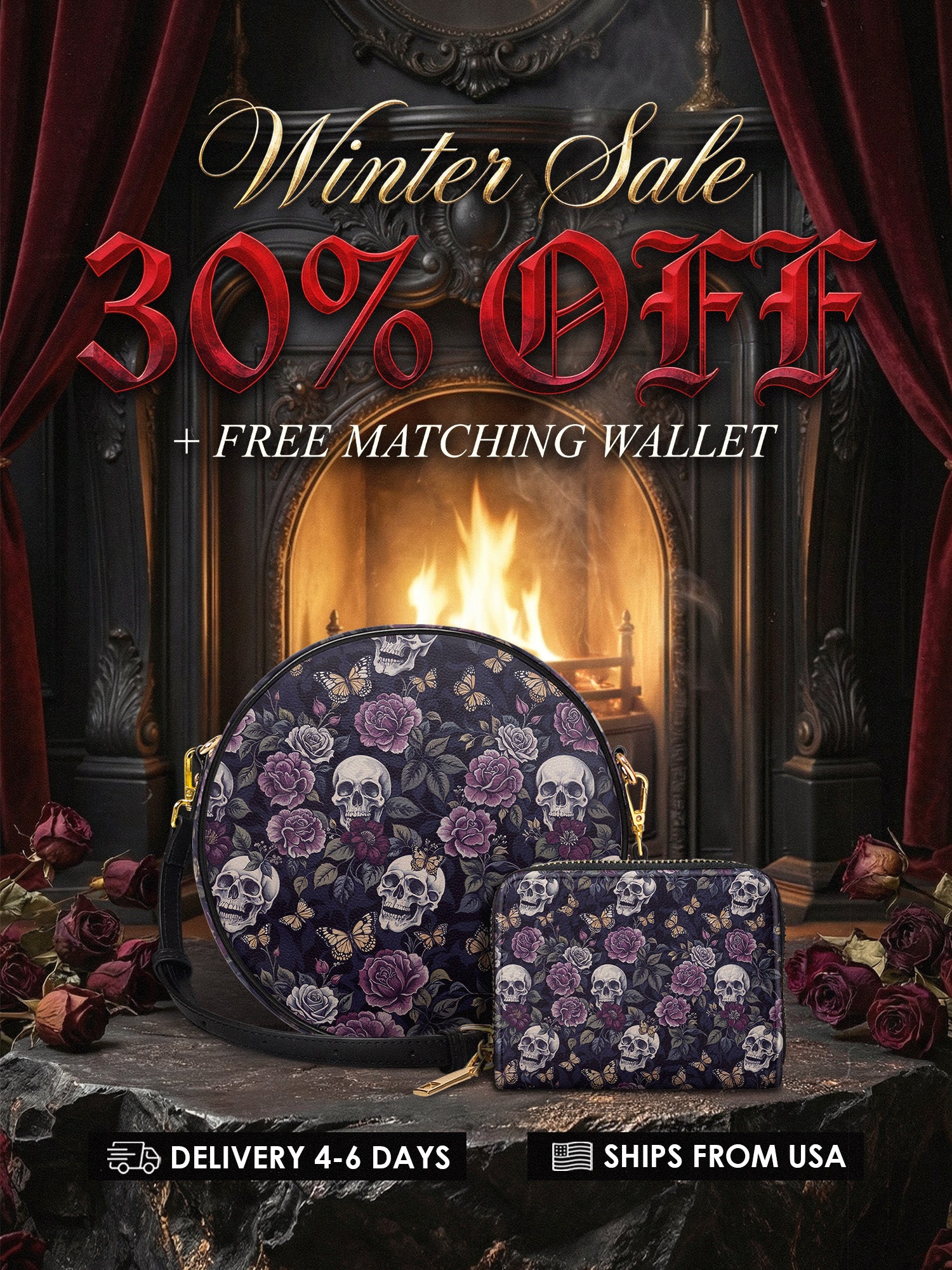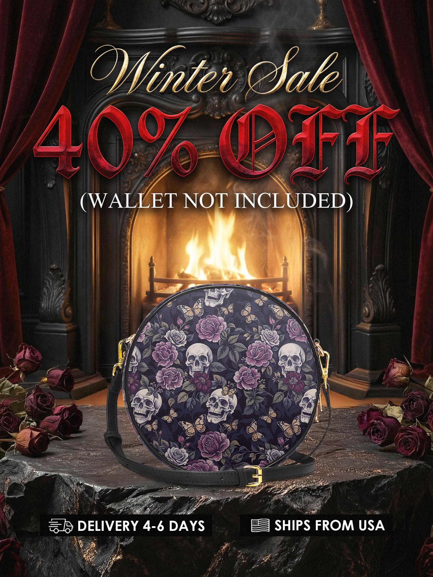 Named Noctaflora—from nocta (night) and flora (flowers)—this circle crossbody captures the dark poetry of nature after dusk. The design is a moody tapestry of violet roses, delicate butterflies, and ivory skulls—each element whispering beauty, decay, and transformation. Set against a deep twilight background, it’s a gothic bloom that never wilts. Perfect for those who find elegance in the eerie, and romance in the shadows.