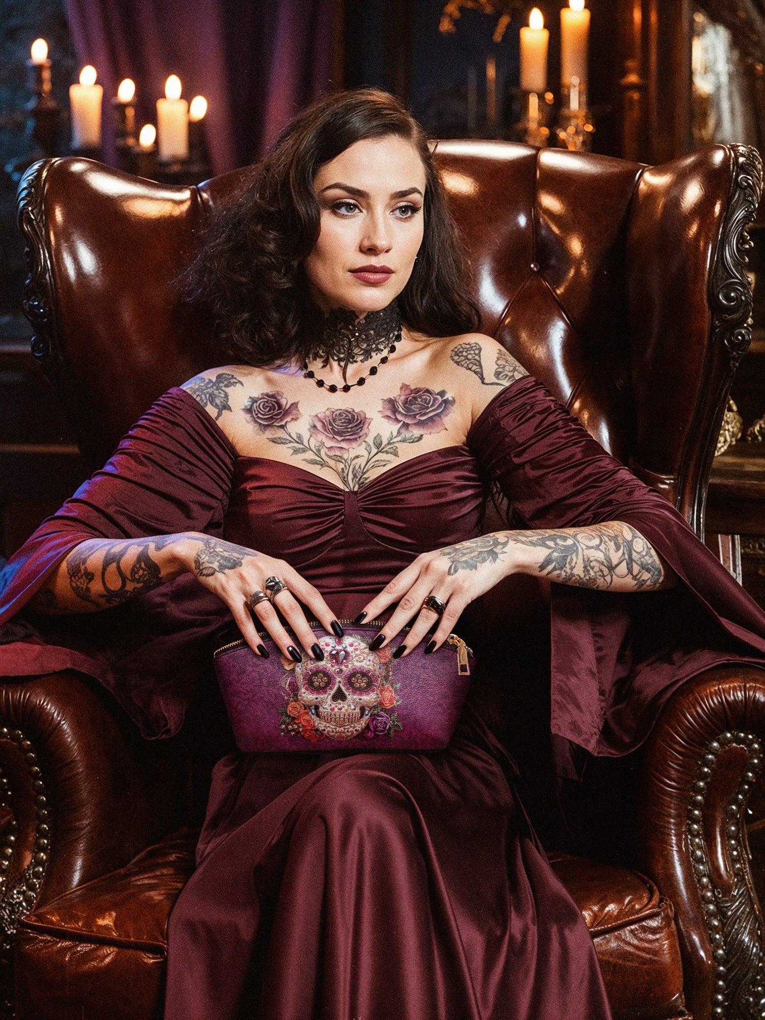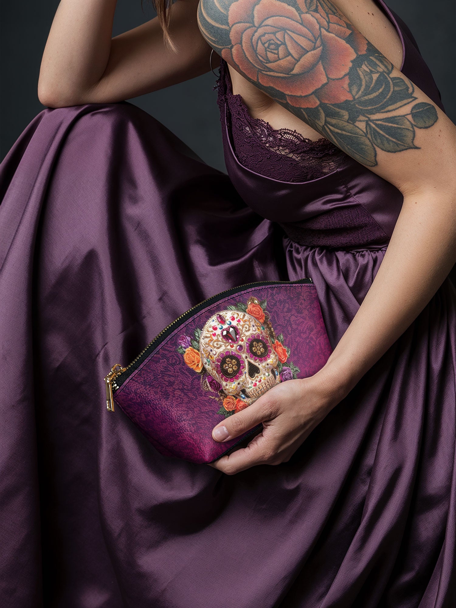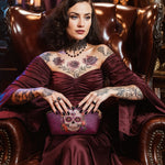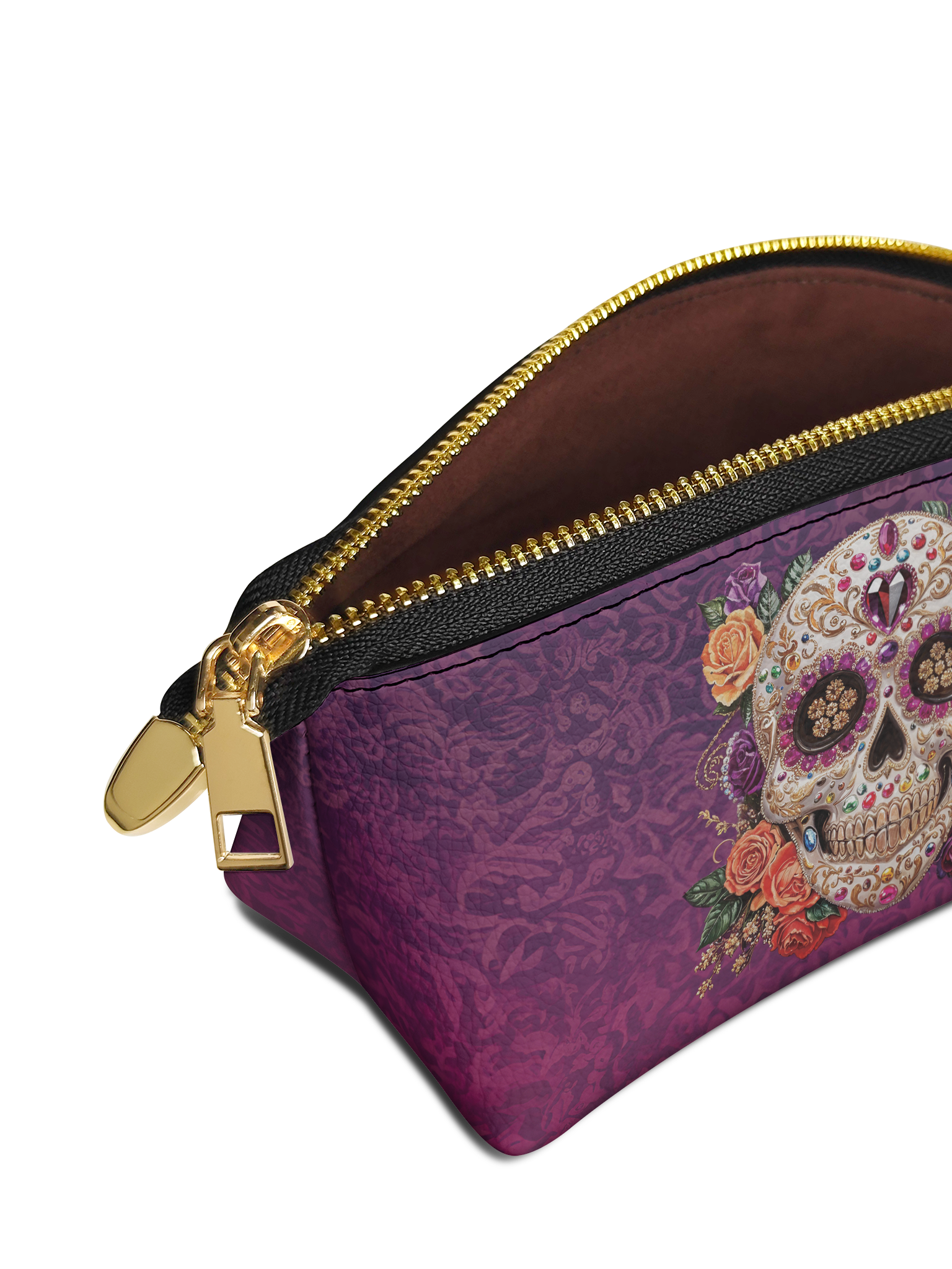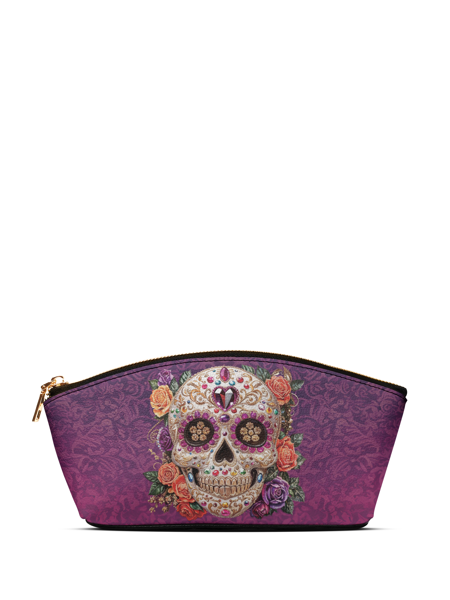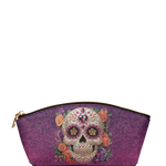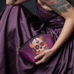 The Catrinelle makeup bag is where artistry meets ancestry. Featuring a radiant sugar skull adorned with sparkling jewels and framed by blooming roses, it pays tribute to the elegance of La Catrina and the spirit of Día de los Muertos. Set against a deep violet damask background, this bag adds a burst of beauty and boldness to your daily ritual. A keepsake for those who celebrate life—colorfully, fiercely, and without apology.