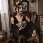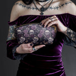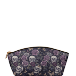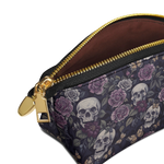 The Noctaflora makeup bag brings twilight drama to your daily rituals. Named for its crescent-like silhouette and its midnight-blooming print, this bag features a haunting arrangement of skulls, dusky roses, and soft golden butterflies. It’s a dark garden under a fading moon—perfect for storing beauty essentials with a touch of the macabre. Elegant, eerie, unforgettable.