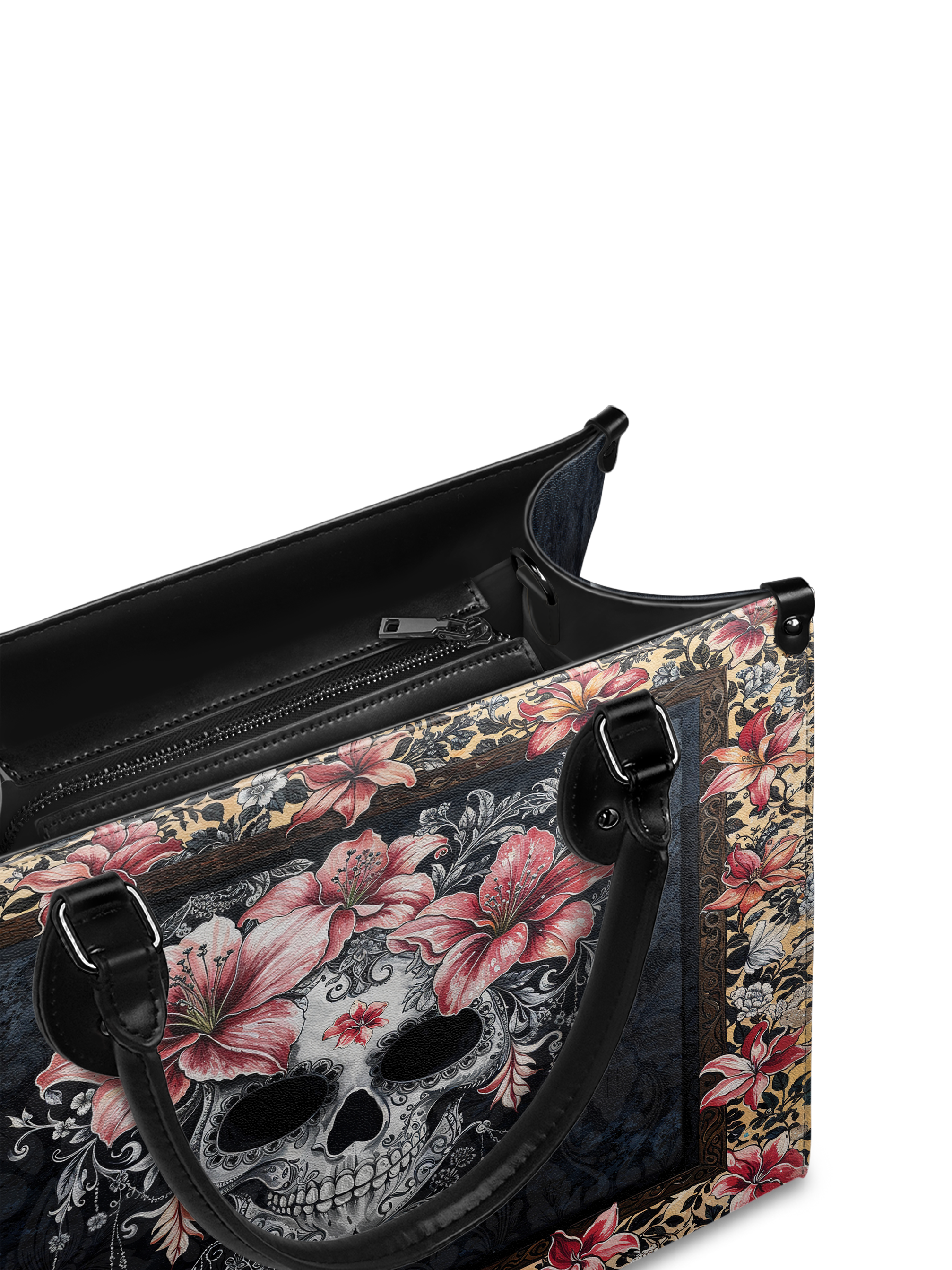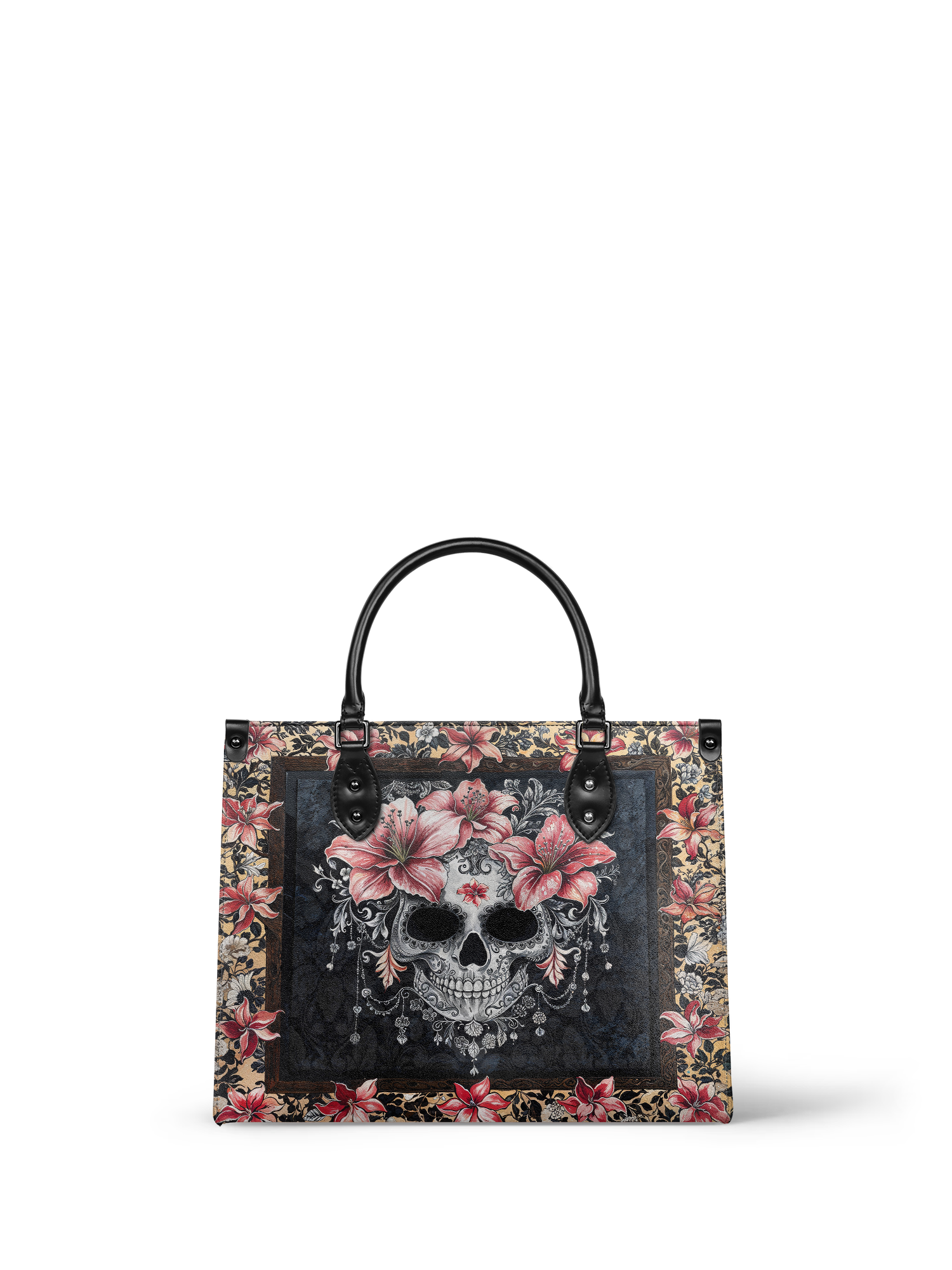 Meet the "Roselace" leather handbag — where gothic romance meets timeless luxury. Featuring a delicate skull adorned with blooming lilies, this bold statement piece turns every glance into a double take. Crafted from premium leather with sleek black handles, it’s the perfect blend of dark beauty and everyday elegance.