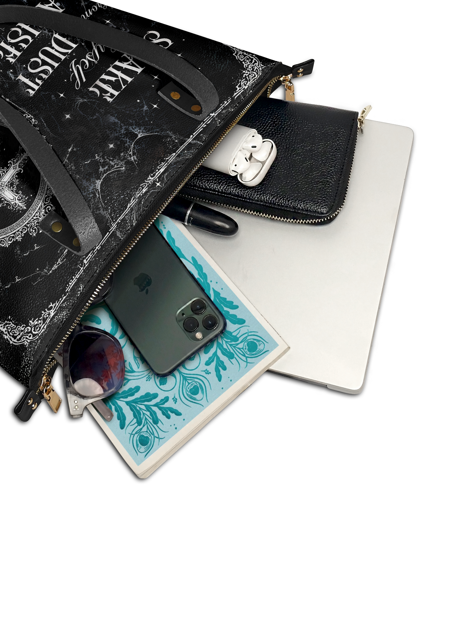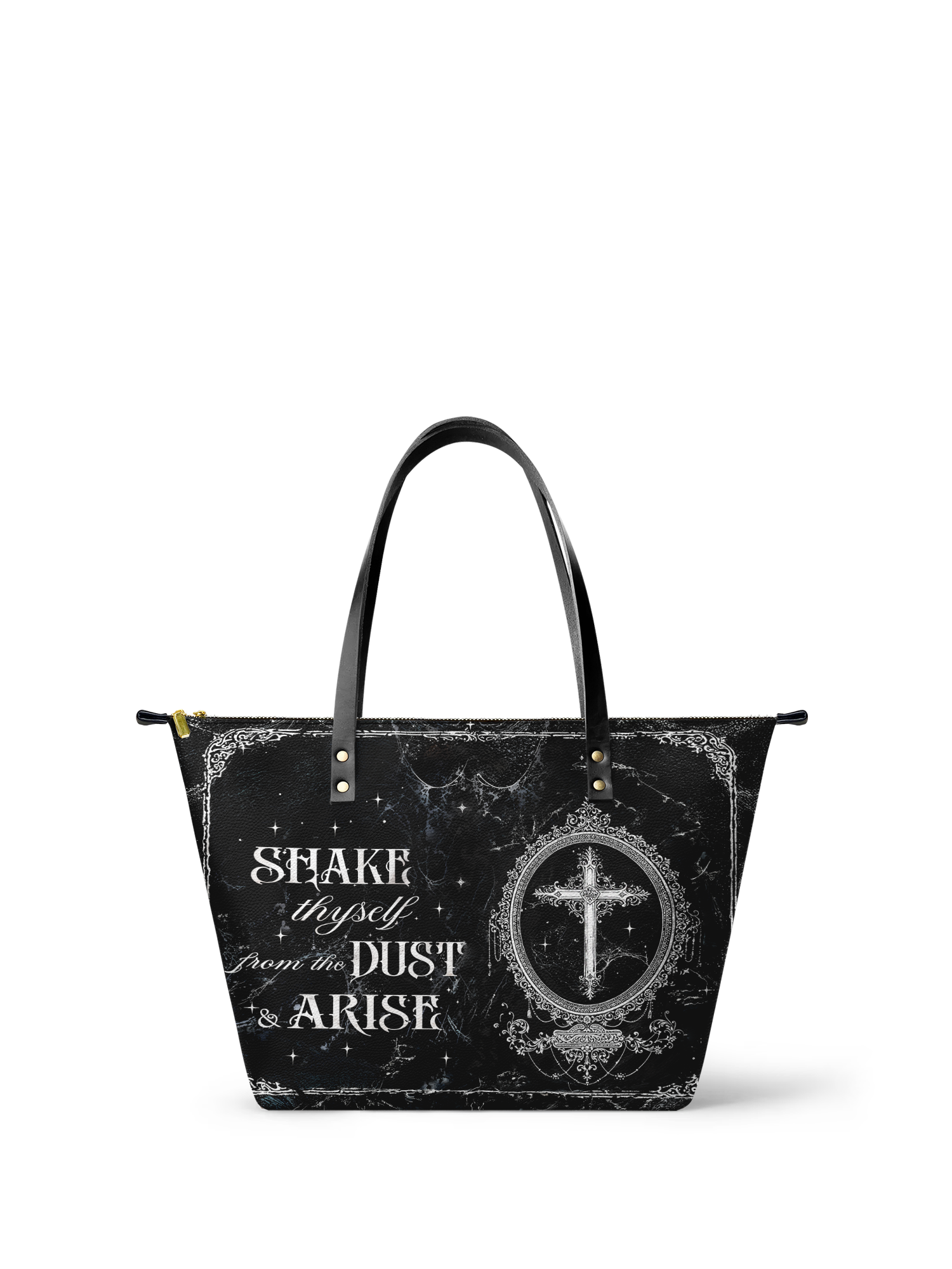 The Dustveil leather tote bag is a bold anthem of resurrection—equal parts gothic, graceful, and unshakably fierce. With distressed textures like weathered stone and vintage script that reads “Shake thyself from the dust & arise,” this design feels like a message from the heavens after the battle. The central cross, enclosed in a delicate filigree frame, radiates a quiet defiance. Spacious, structured, and spiritually charged—this is the tote you carry when you're done shrinking and ready to rise.