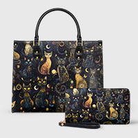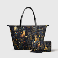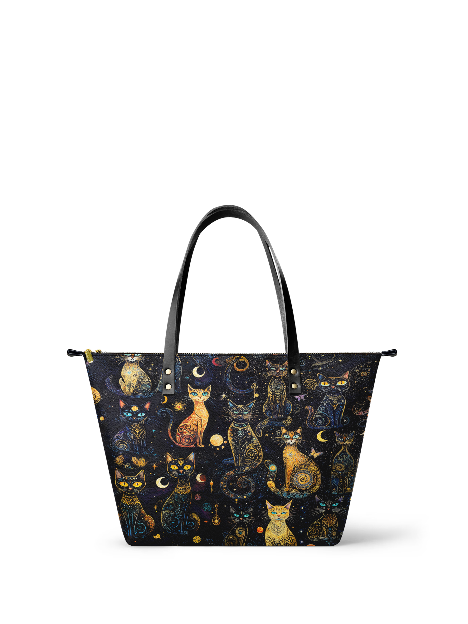 The Lunacat leather tote bag is a cosmic celebration of feline elegance and lunar magic. Drenched in a starlit navy sky, this roomy tote features an enchanting lineup of celestial cats—each swirling with golden moons, constellations, and mystical charm. The tall silhouette and sturdy handles make it the perfect carry-all for dreamers, stargazers, and cat lovers alike. Whether you're heading to the bookstore, the market, or a moonlit stroll, this bag adds a touch of mystery and magic to every step. Let your style orbit in its own galaxy with Lunacat.