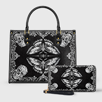 The Morthwing leather tote bag is where dark elegance takes flight. With its striking moth-and-skull motif framed in intricate gothic flourishes, this design evokes the mystique of transformation, mortality, and rebellion. The symmetrical black-and-white artwork commands attention while remaining effortlessly wearable. Crafted from premium vegan leather, this spacious tote offers room for all your essentials—whether you're headed to a bookshop, a concert, or a midnight stroll. It’s more than a bag—it’s a gothic spell wrapped in leather.