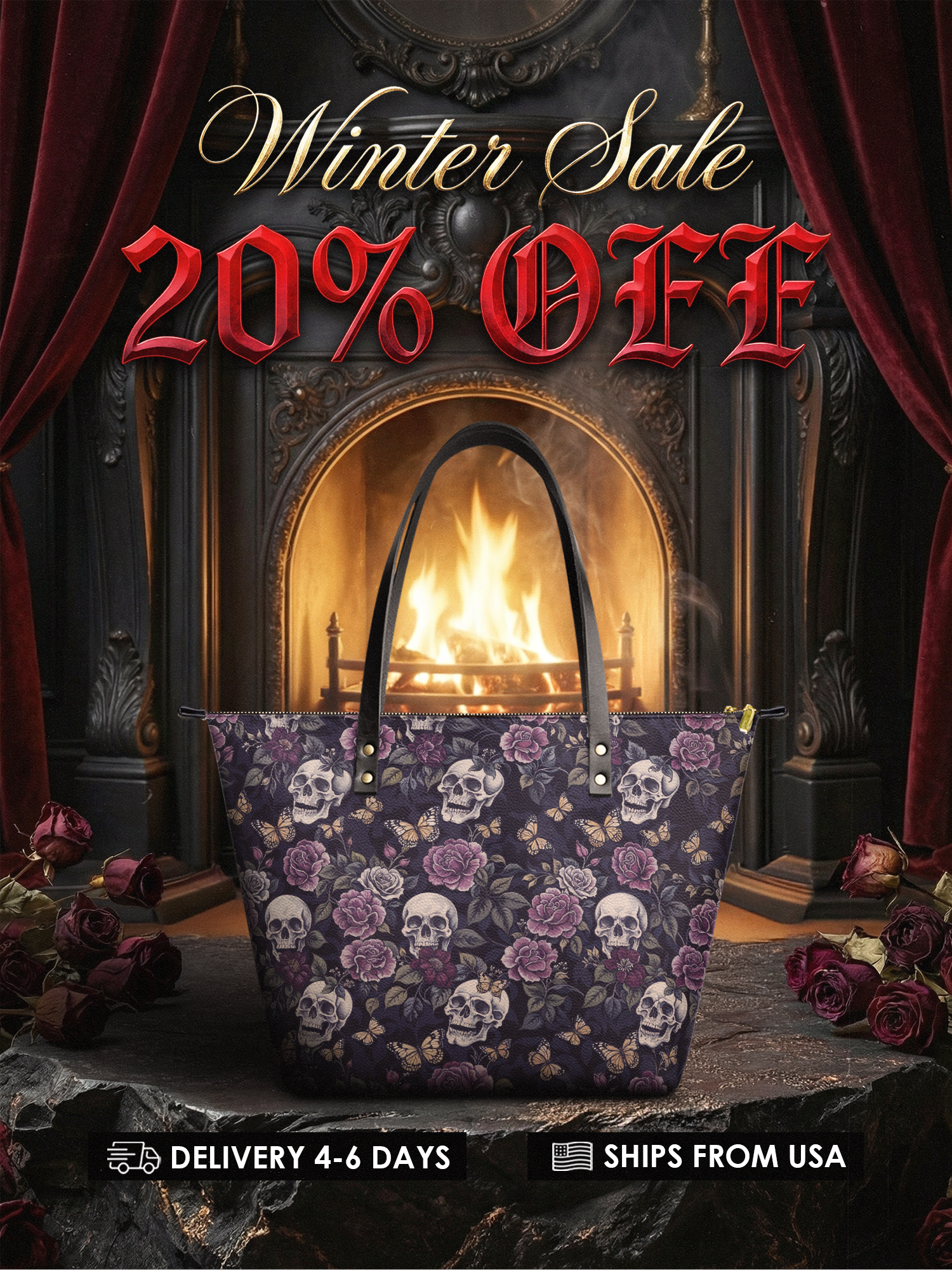 The "Noctaflora" leather tote is a moody masterpiece—skulls, roses, and butterflies all over a deep, dark backdrop. It’s big enough to carry your whole day and bold enough to carry your vibe.