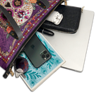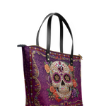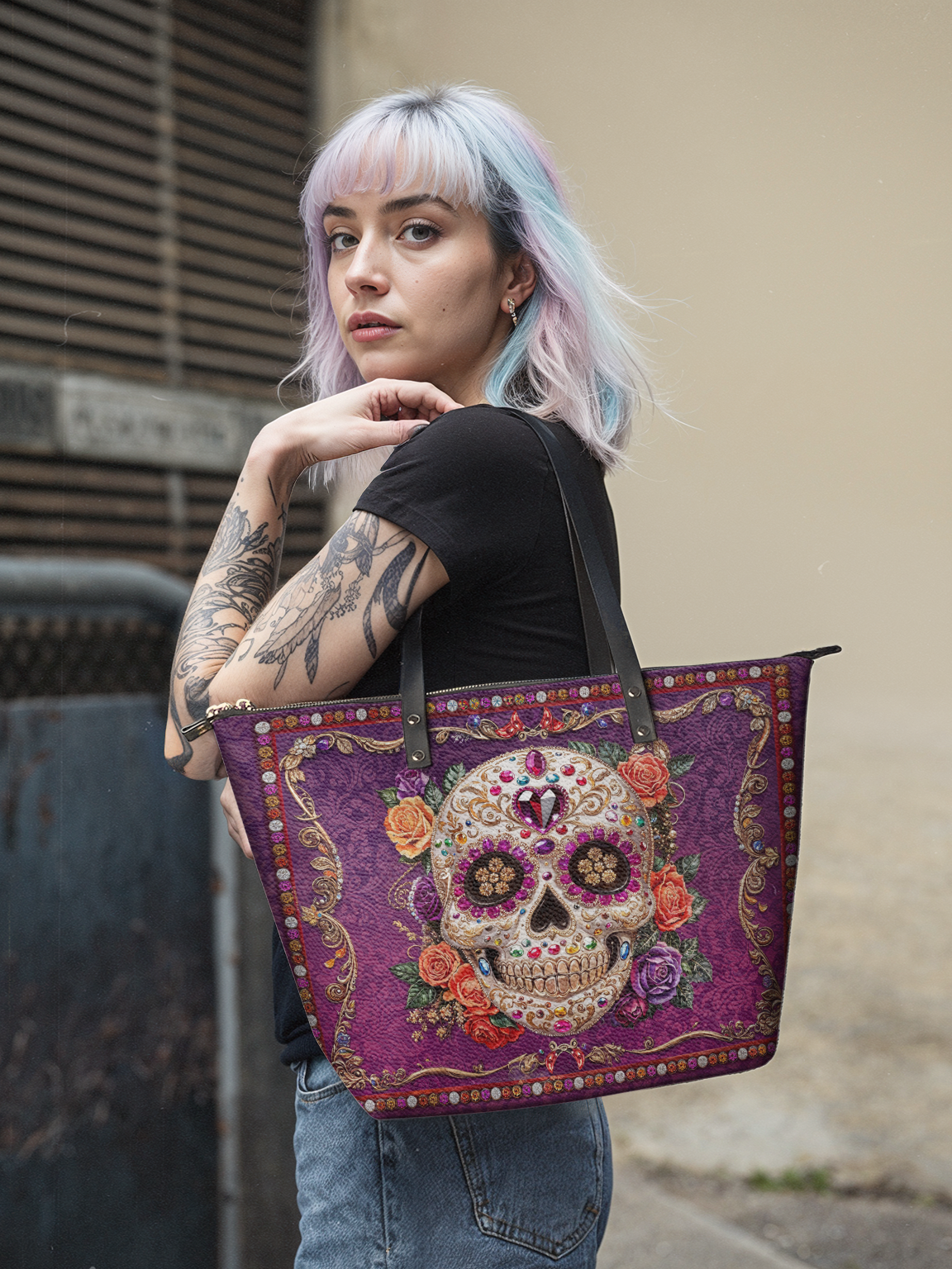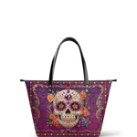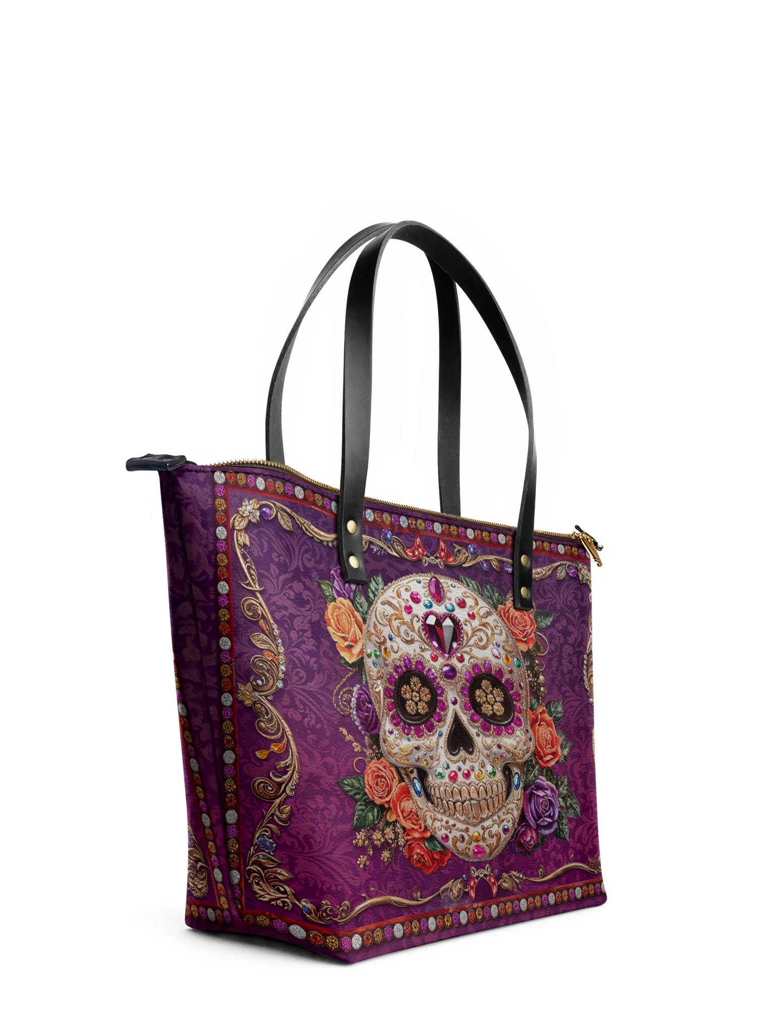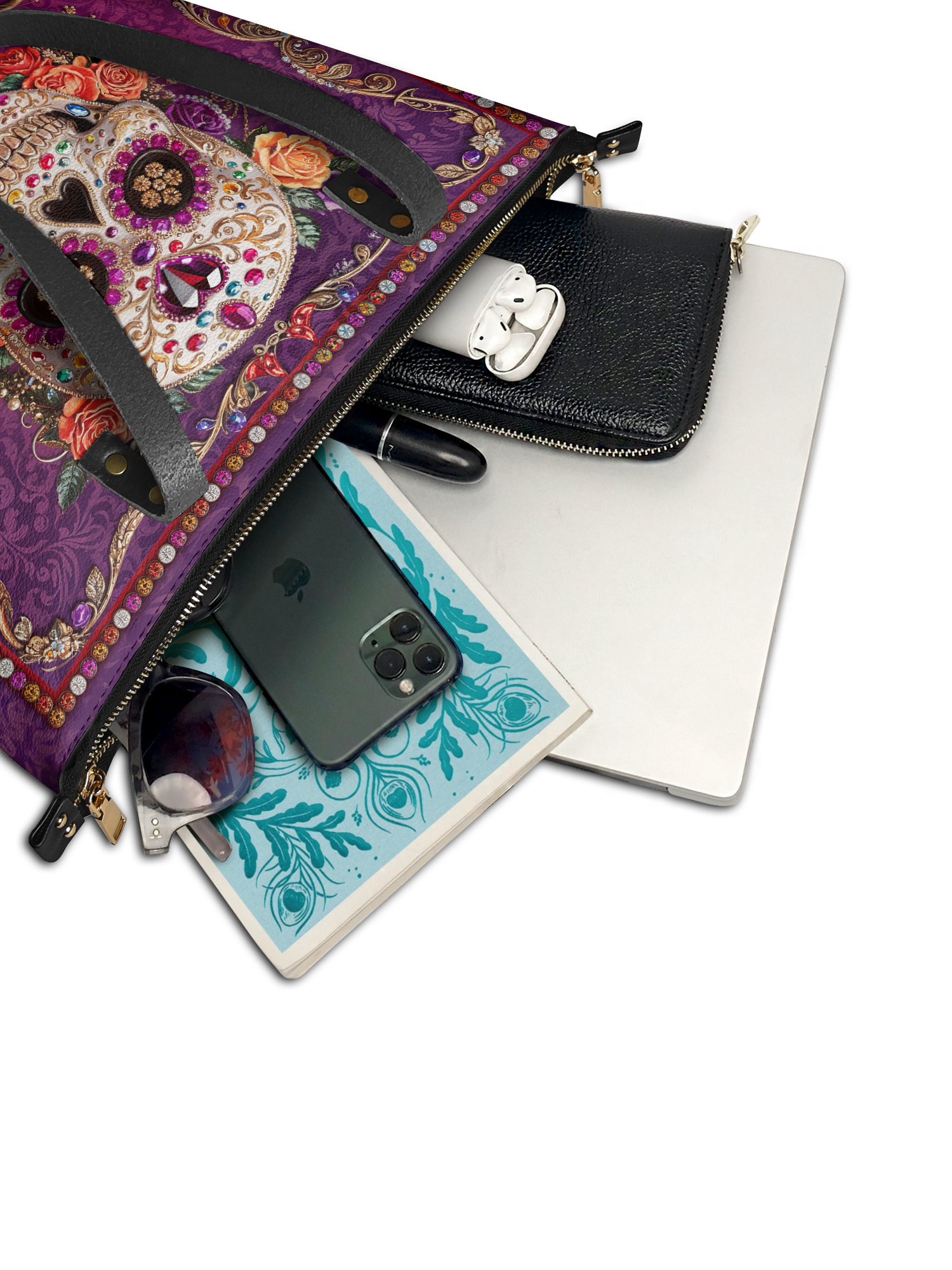 The "Catrinelle" leather tote is a walking fiesta. With jeweled sugar skulls, blooming roses, and rich gold details on a deep purple base, this bag doesn’t whisper—it sings.