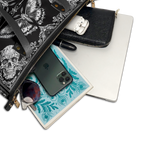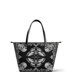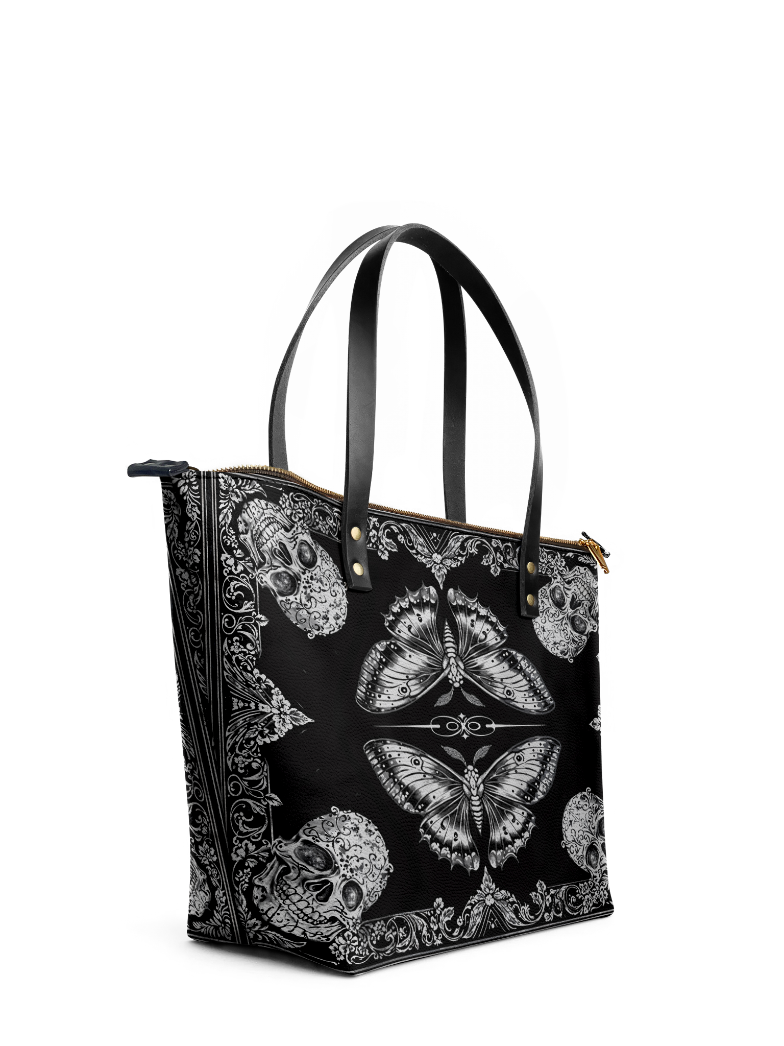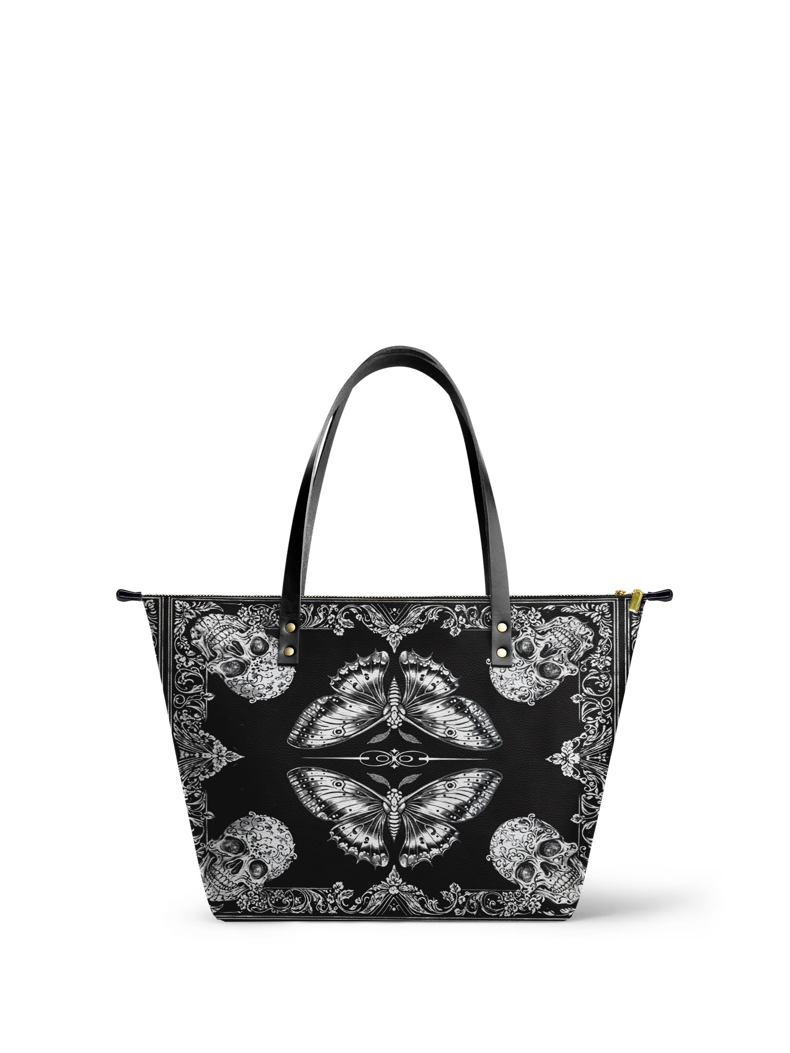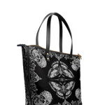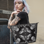 The Morthwing leather tote bag is where dark elegance takes flight. With its striking moth-and-skull motif framed in intricate gothic flourishes, this design evokes the mystique of transformation, mortality, and rebellion. The symmetrical black-and-white artwork commands attention while remaining effortlessly wearable. Crafted from premium vegan leather, this spacious tote offers room for all your essentials—whether you're headed to a bookshop, a concert, or a midnight stroll. It’s more than a bag—it’s a gothic spell wrapped in leather.