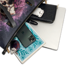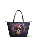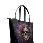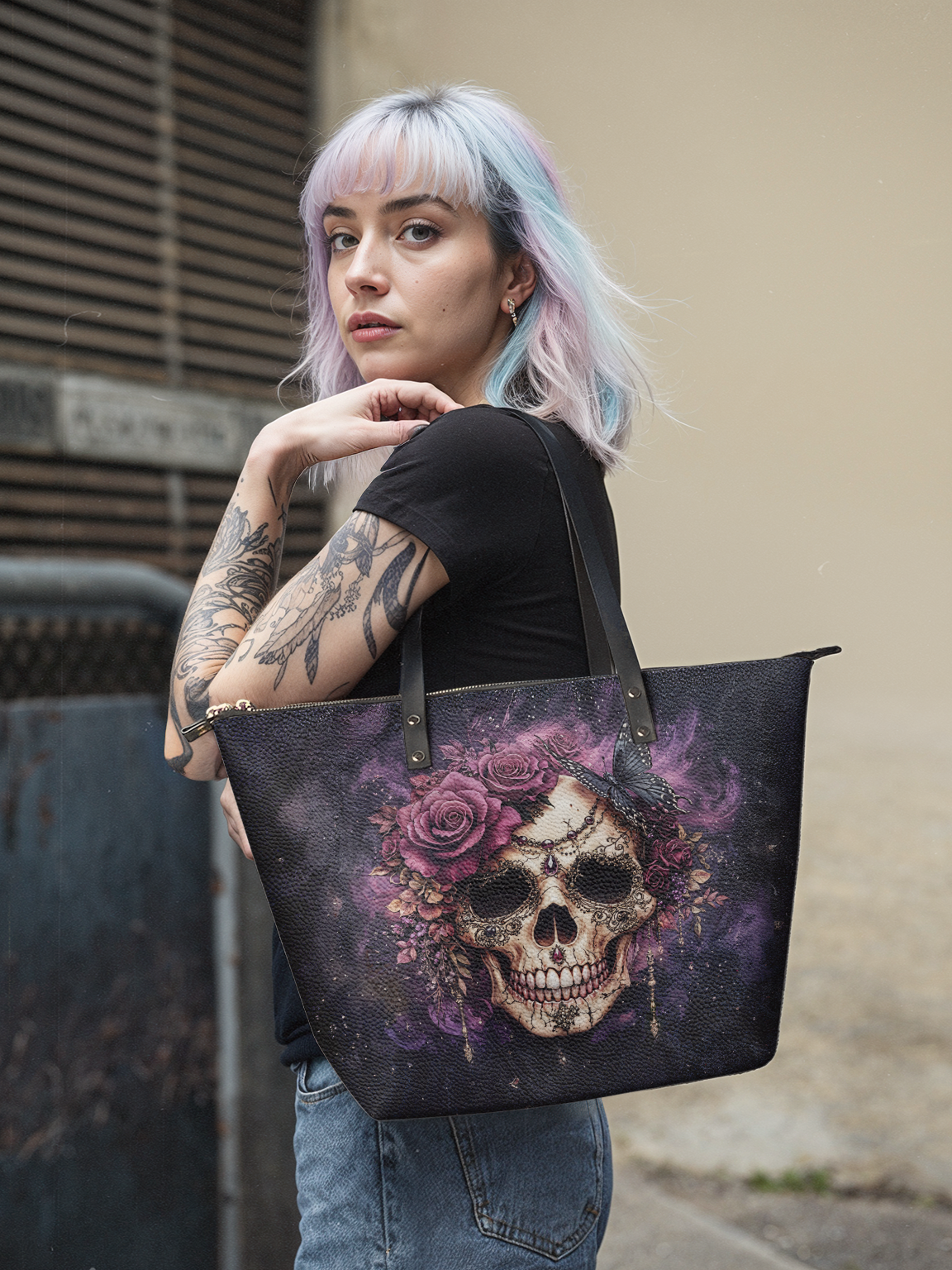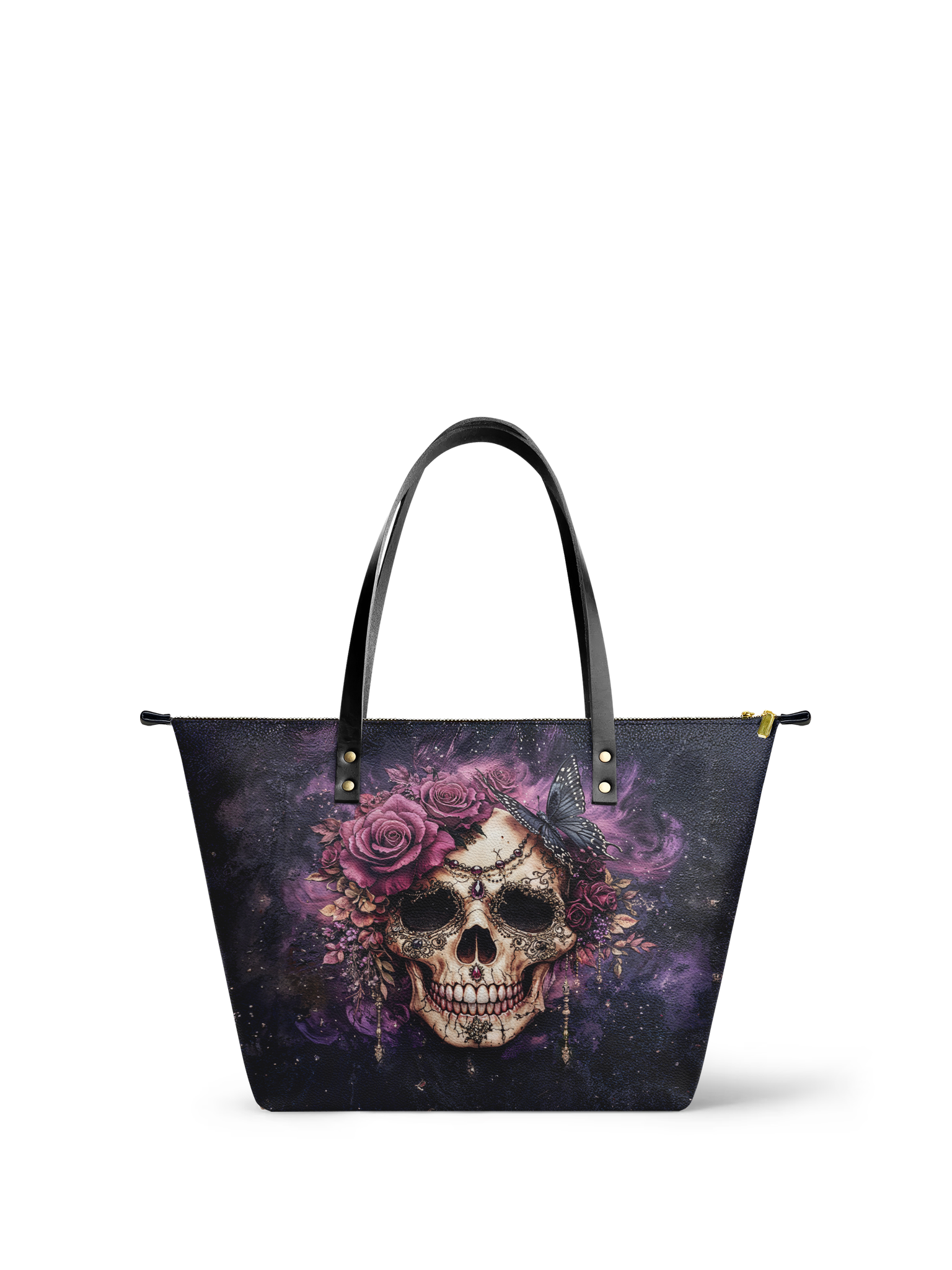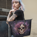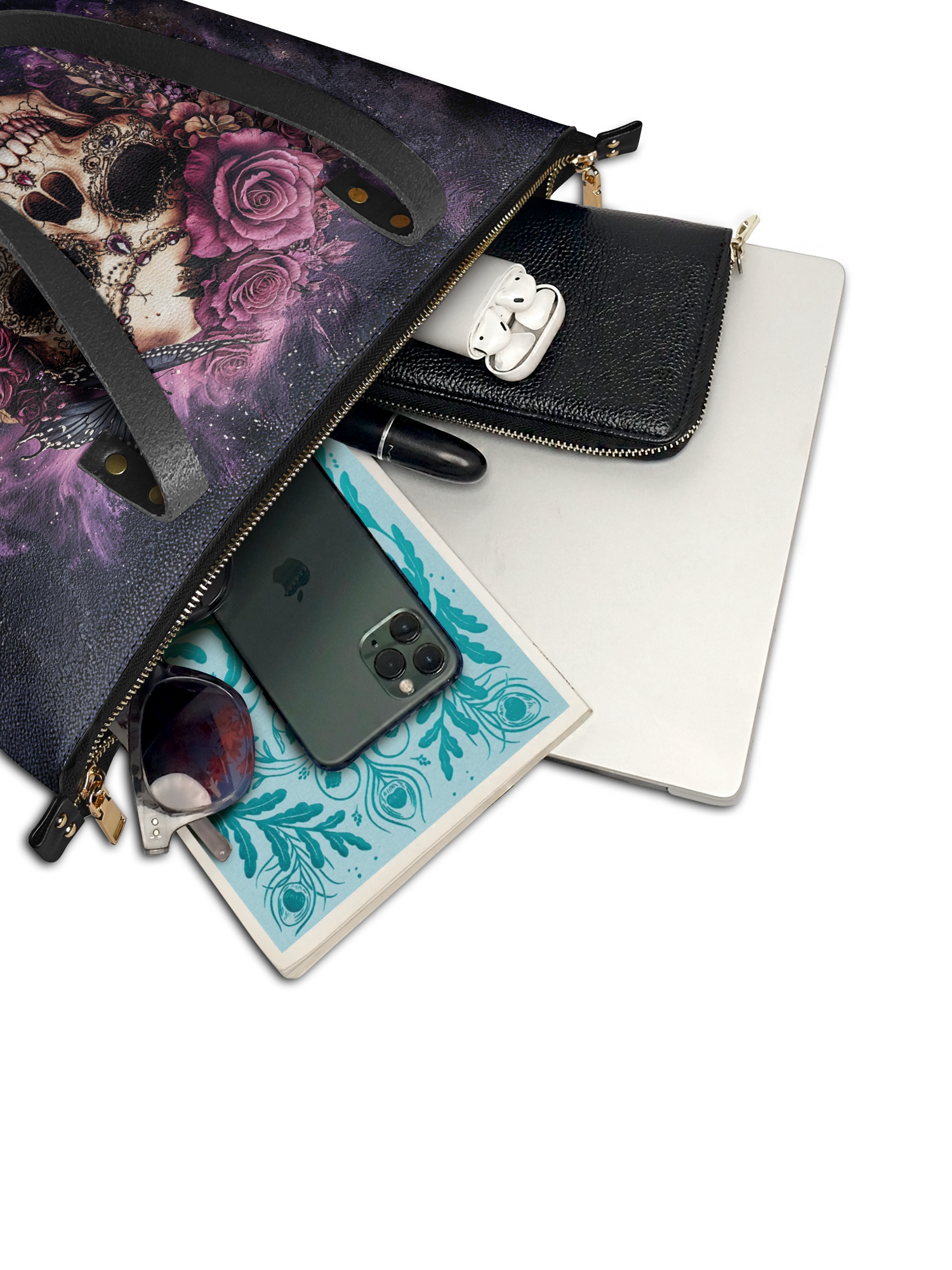 The Noxaria leather tote bag is gothic elegance reimagined. A hauntingly beautiful skull crowned with lush plum roses, delicate gold chains, and a resting black butterfly creates a striking centerpiece—set against a swirling backdrop of deep space purples and shadows. This spacious tote is crafted from buttery soft vegan leather, designed for those who carry darkness with grace. Whether you're wandering moonlit streets or heading into the everyday unknown, Noxaria is your bold companion.