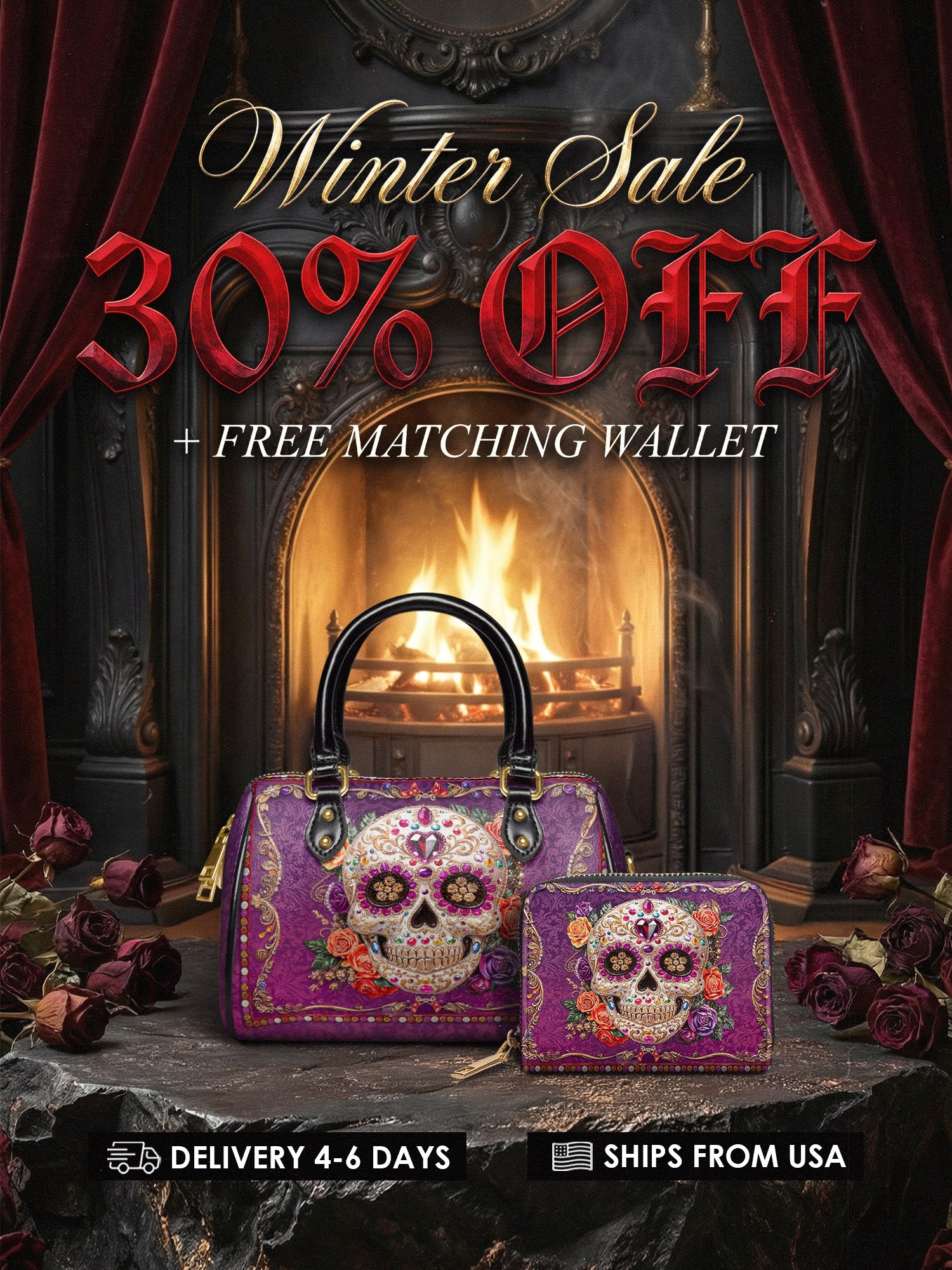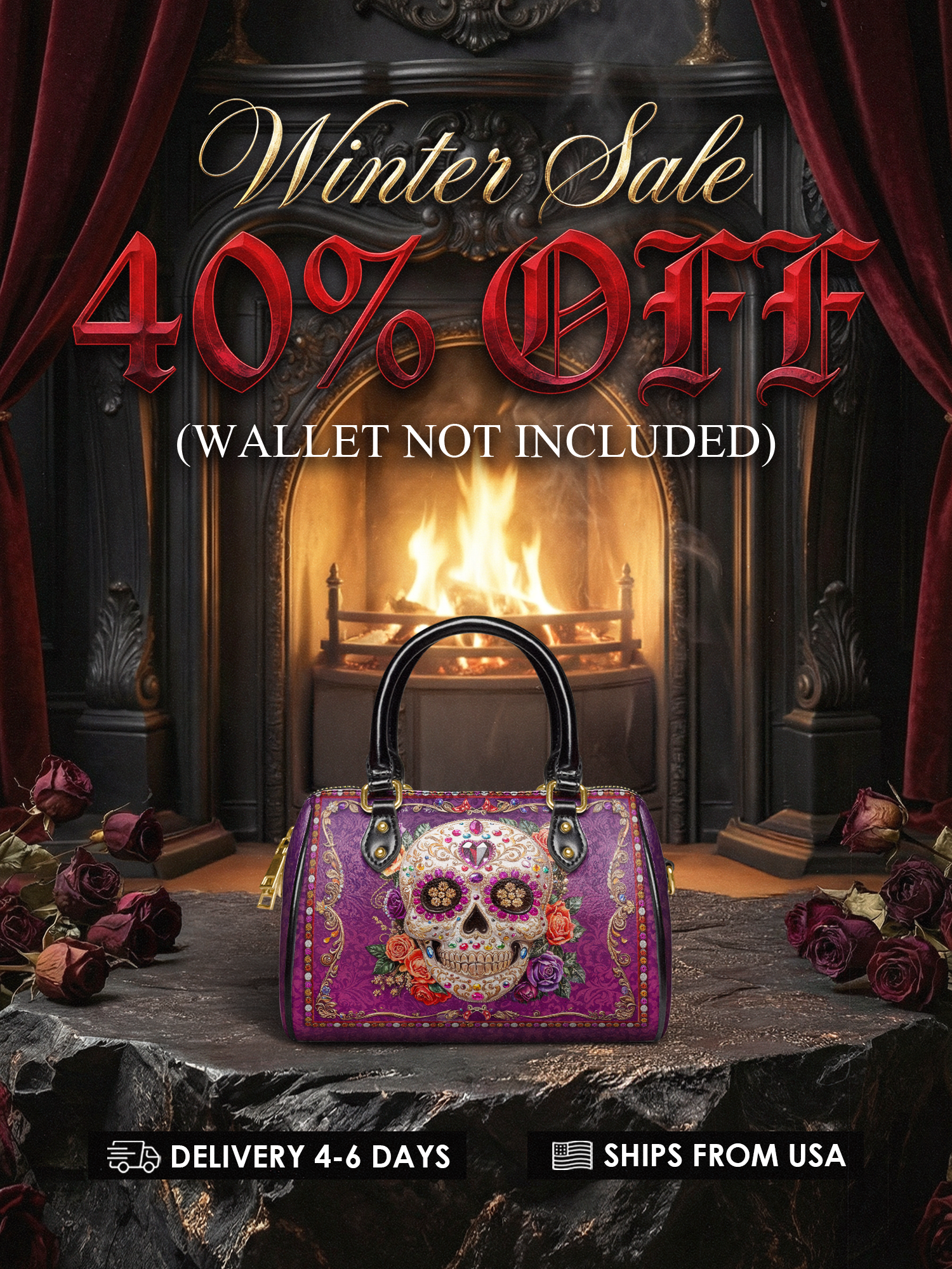 The Catrinelle mini satchel is a radiant homage to elegance beyond the veil. Named after La Catrina—the iconic lady of Día de los Muertos—this bag dazzles with a jewel-adorned sugar skull framed by rich florals and golden scrollwork. Set against a royal purple backdrop, every detail glows with reverence and flair. Compact yet commanding, it’s for those who carry their culture, spirit, and sparkle with pride.