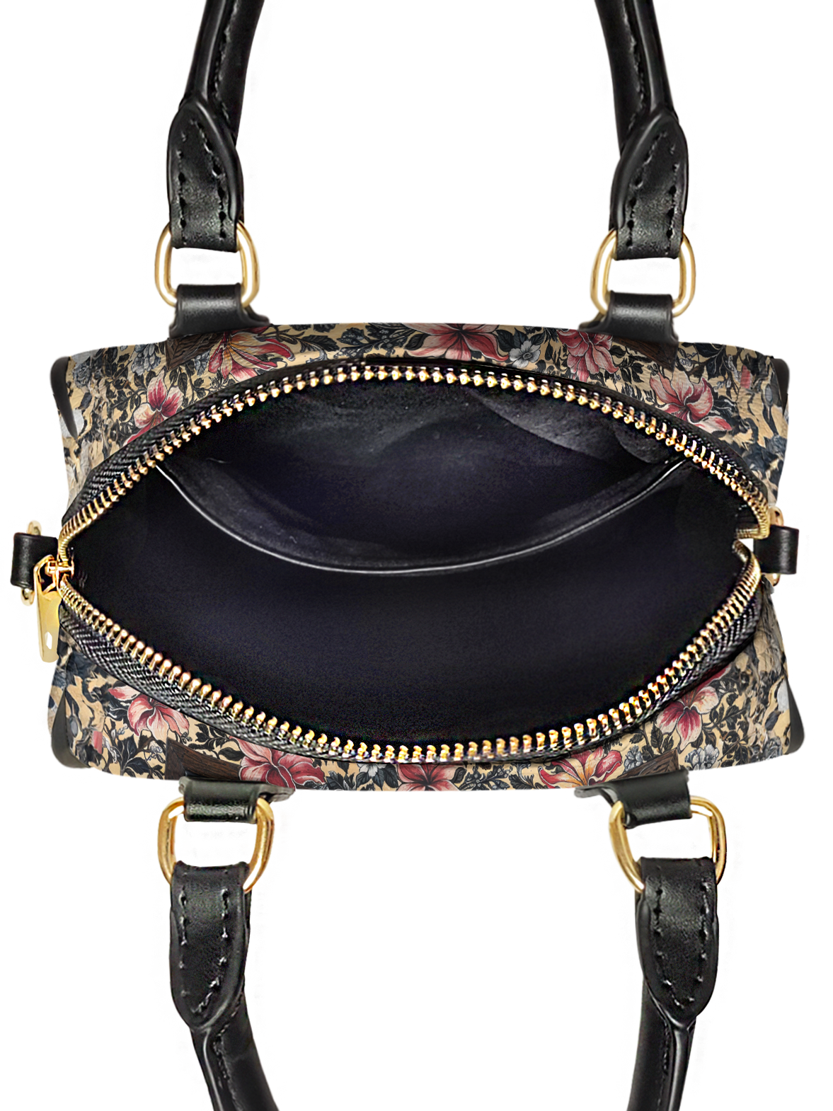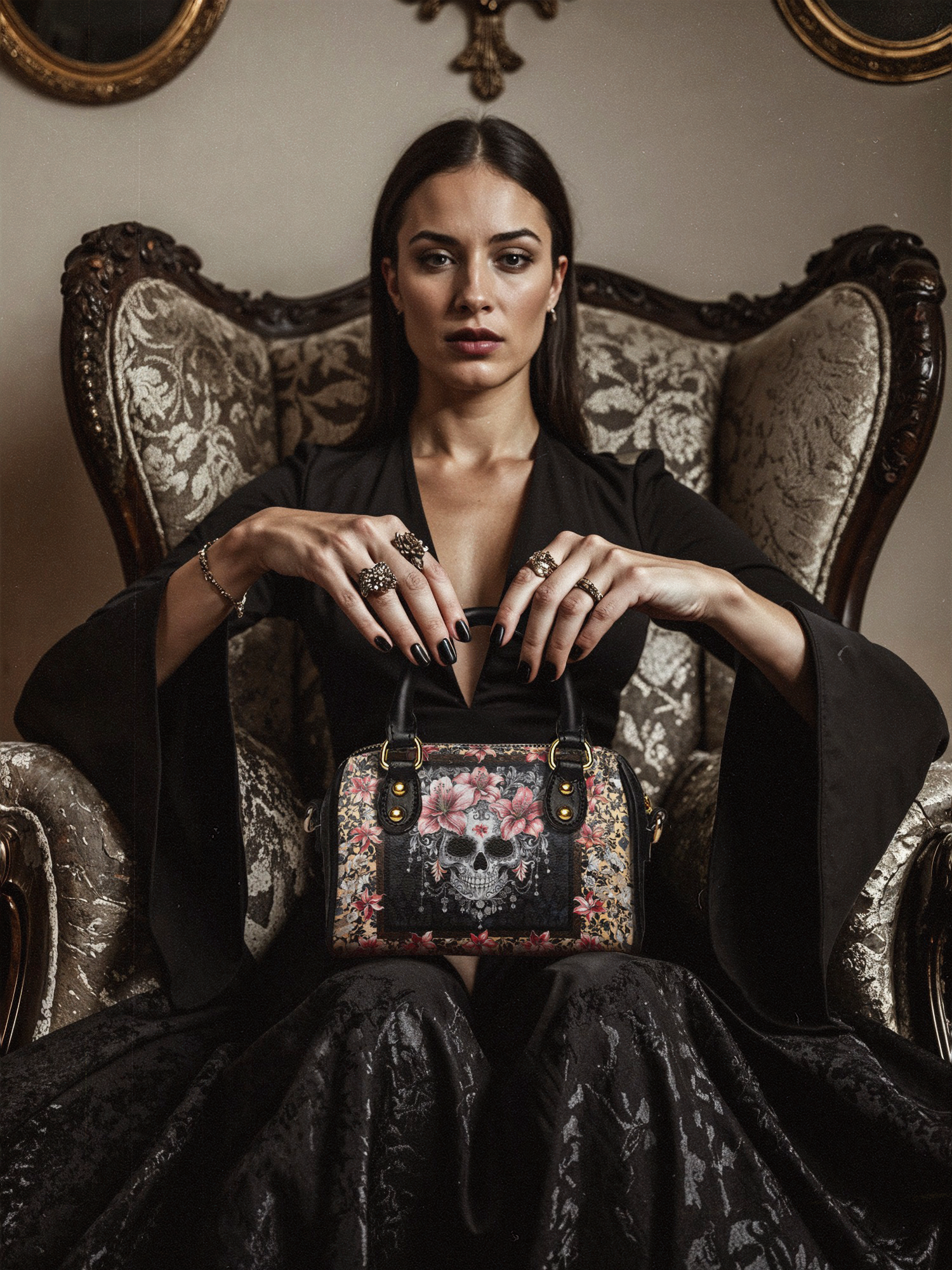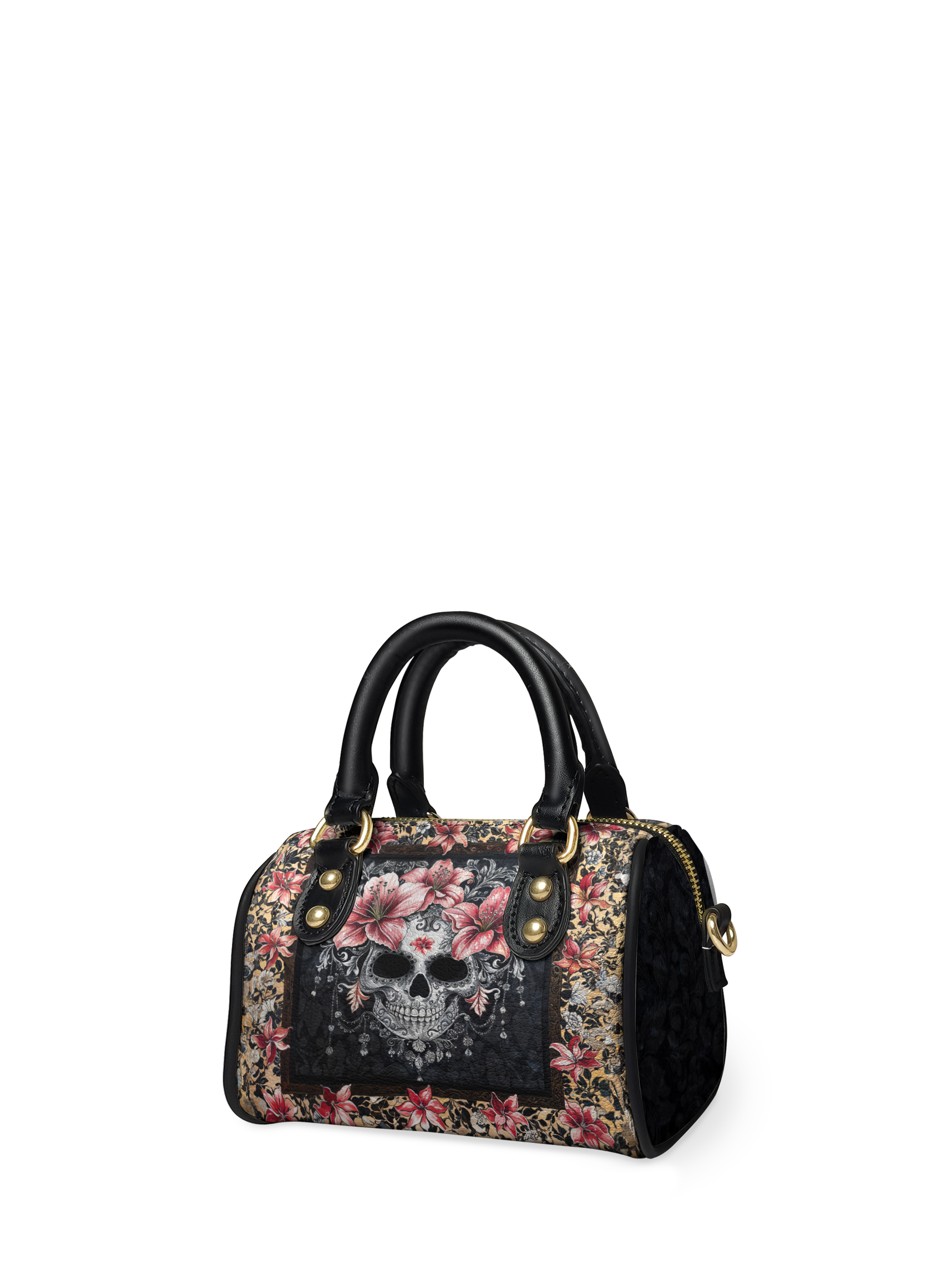 The Roselace mini satchel is elegance with a gothic twist. A delicate skull framed by vintage lace and crowned with soft pink lilies takes center stage, wrapped in a tapestry of faded florals and antique charm. It’s romantic without being sweet, bold without being loud—a quiet rebellion in every petal and pattern. For those who carry both softness and strength, this bag is your signature.