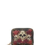 The Bloodrose mini wallet is a small piece of gothic poetry you can hold in the palm of your hand. Adorned with a trio of haunting skulls crowned by lush red roses and golden baroque accents, this wallet fuses dark elegance with everyday practicality. Its compact size fits perfectly in your favorite bag, while the secure zip-around closure keeps your essentials safe. For those who crave beauty with a bite—this wallet speaks your language.