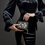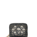 Dark. Regal. Unapologetic. The Deathmark mini wallet is a tribute to timeless rebellion. Featuring a haunting cluster of skulls woven into baroque-style scrollwork, this design balances boldness with sophistication. It’s gothic to the core—stripped of florals, layered with shadows, and made for those who carry their edge with quiet confidence. A small piece that leaves a lasting impression.