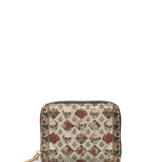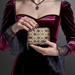 The Mournaire mini wallet is a vintage daydream with a dark twist. Its intricate patchwork of skulls and faded florals feels like something pulled from an antique tapestry—quietly poetic, beautifully eerie. With soft creams, deep reds, and weathered textures, it’s the perfect blend of mourning and romance. For those who love their elegance with a little edge and their nostalgia with a touch of the macabre.