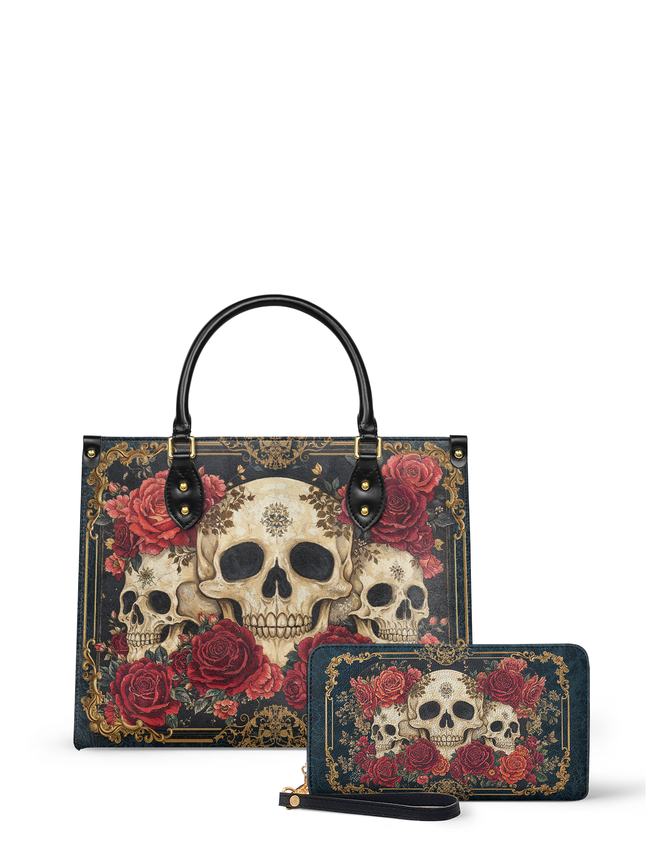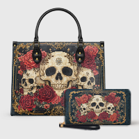 The "Bloodrose" leather bag is fire and flowers in one fierce look. With rich red roses, gold baroque details, and bold skulls front and center, it’s the kind of bag that turns whispers into stares.