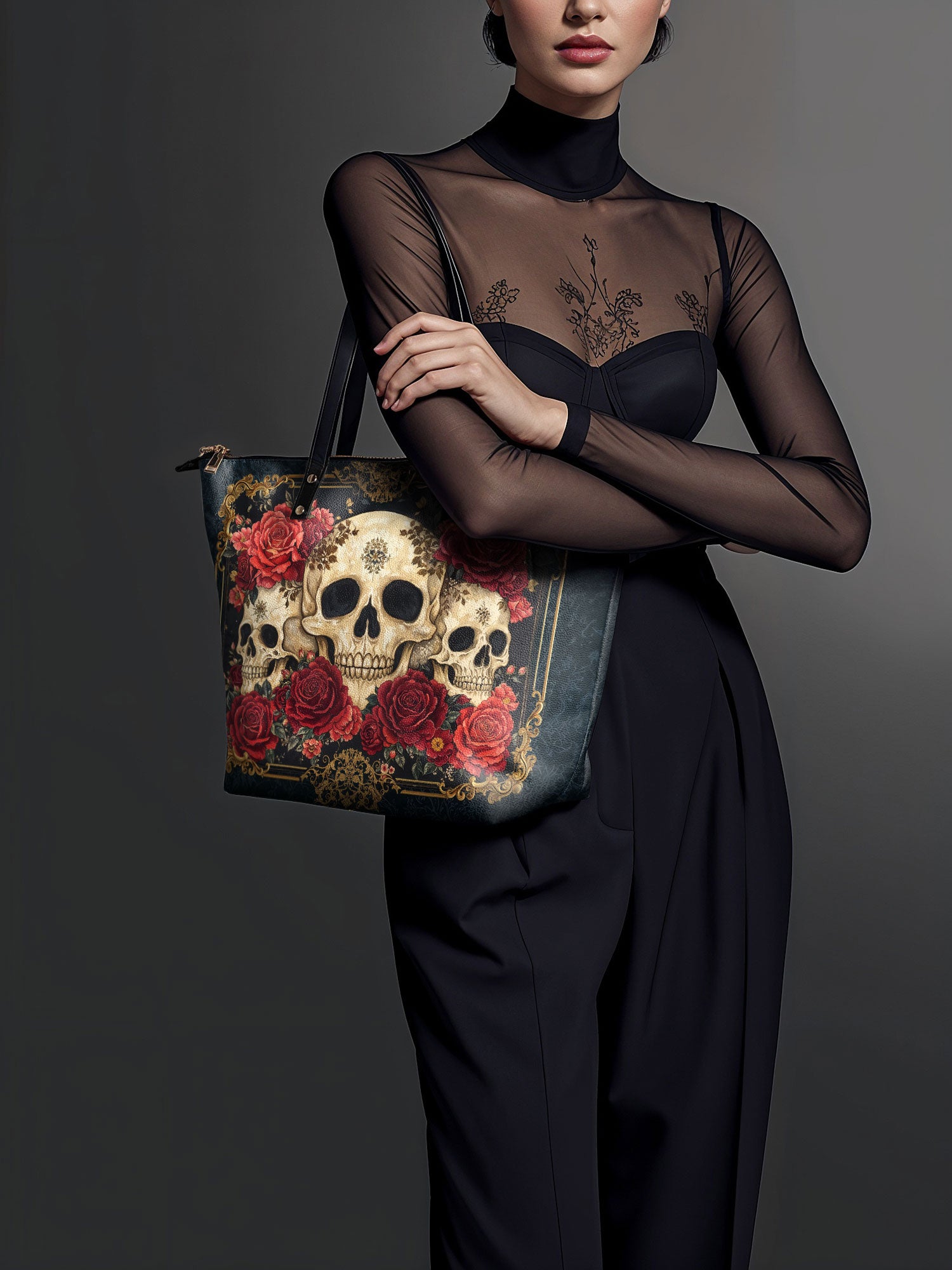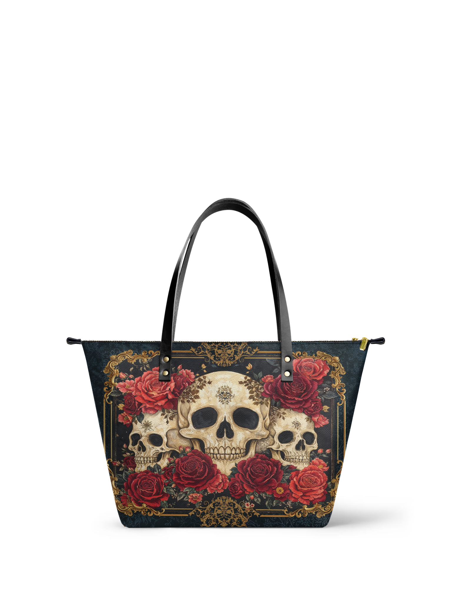 The "Bloodrose" leather tote is where dark beauty meets vintage drama. Skulls sit among crimson roses and gold flourishes, making this bag an unforgettable statement. It’s roomy, zip-secure, and ready to rule any room you walk into.