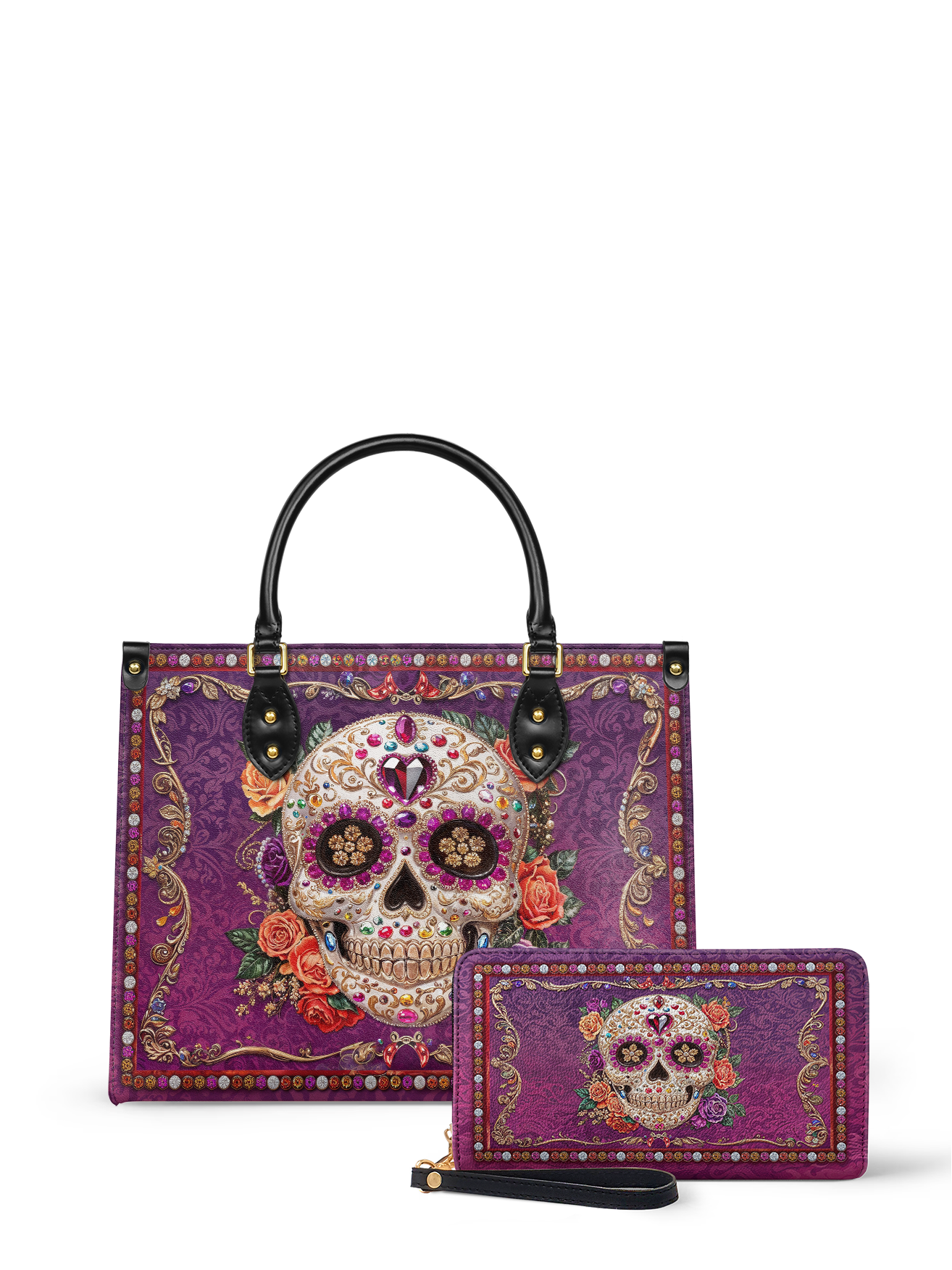 The "Catrinelle" leather bag is pure celebration. With a jeweled sugar skull, glowing florals, and a bold purple backdrop, this bag brings all the joy and all the drama.