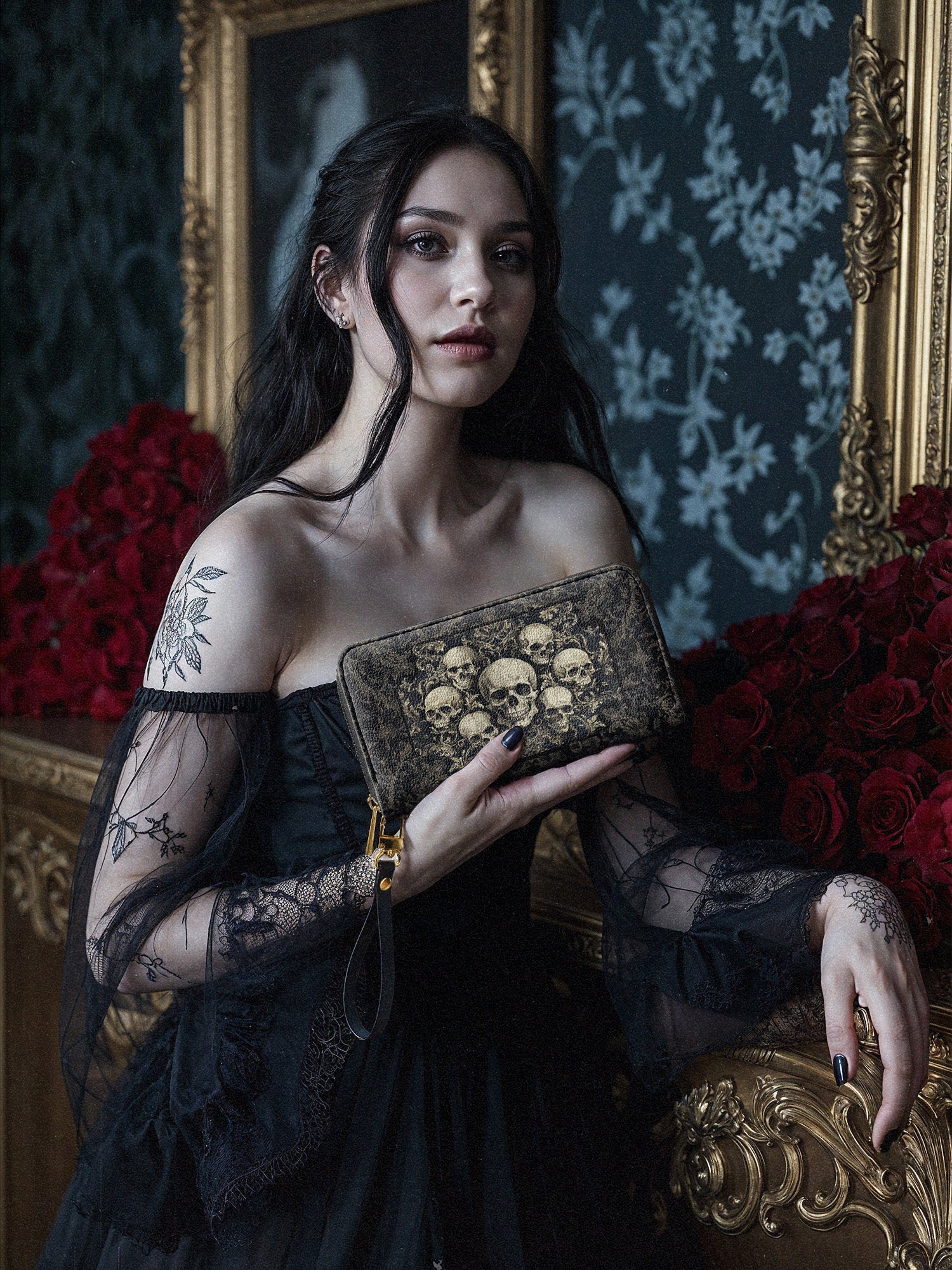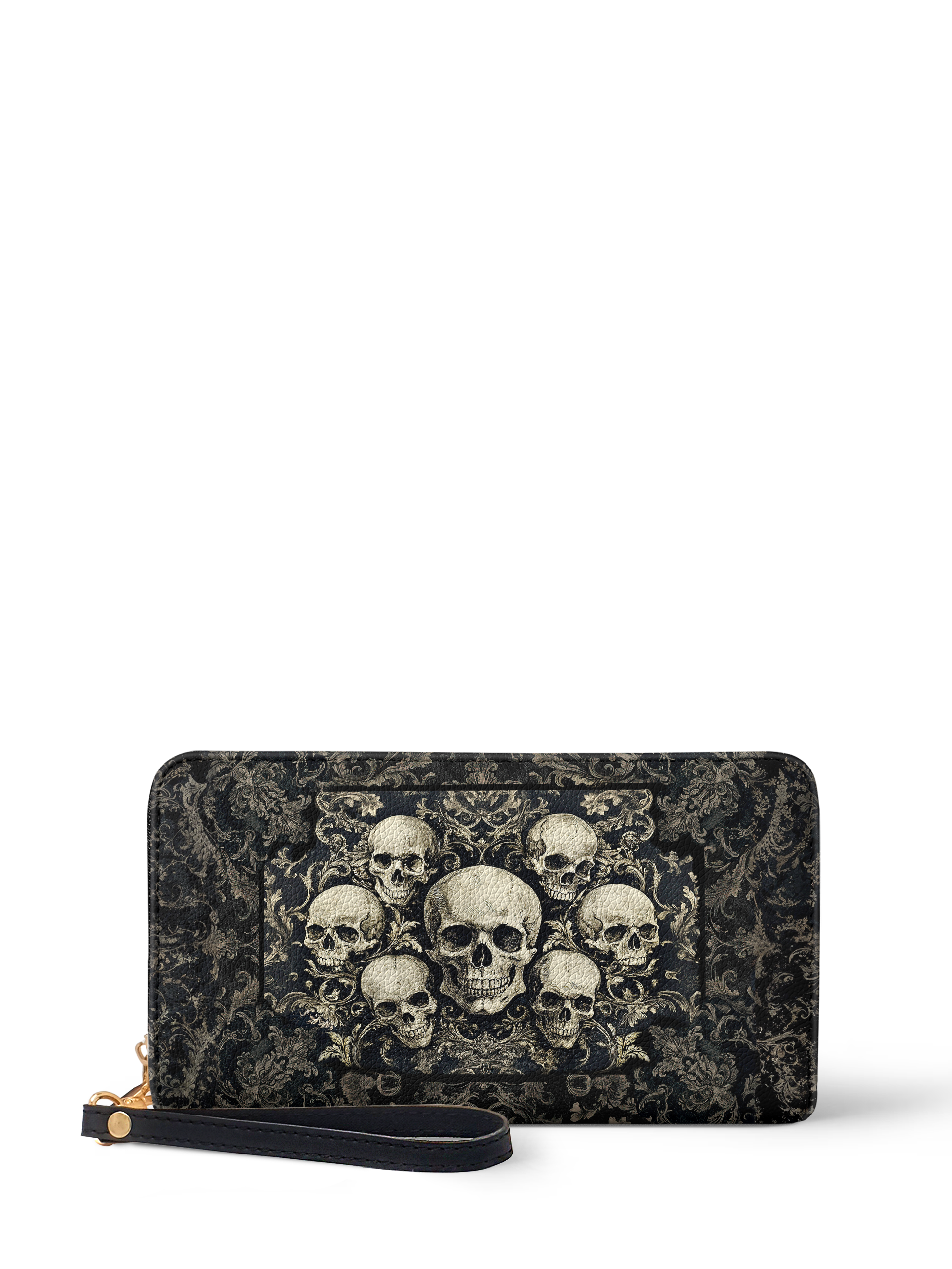 The "Deathmark" leather wallet is dark, detailed, and full of edge. Skulls sit front and center on rich black leather, wrapped in gothic scrolls. It zips tight, feels smooth, and comes with a wrist strap so you’re always ready.