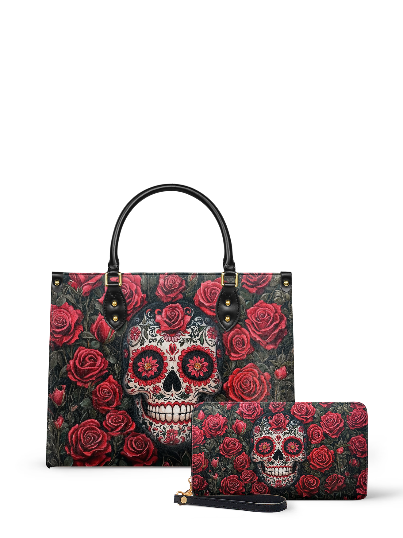 The "La Roja" leather bag is a bold mix of red roses and vibrant sugar skull art, bringing fierce floral energy to your everyday. It’s soft, structured, and full of personality—just like you.