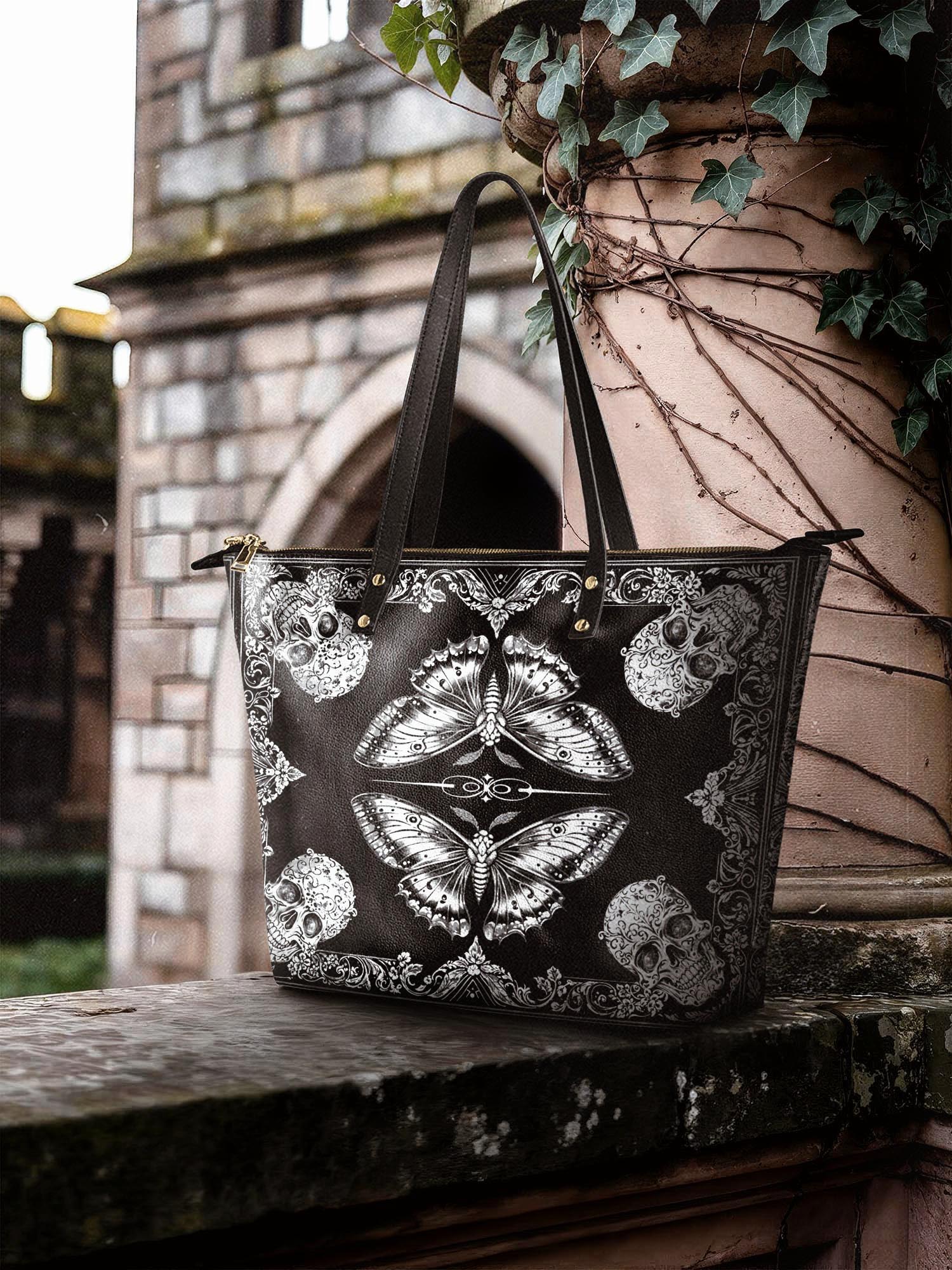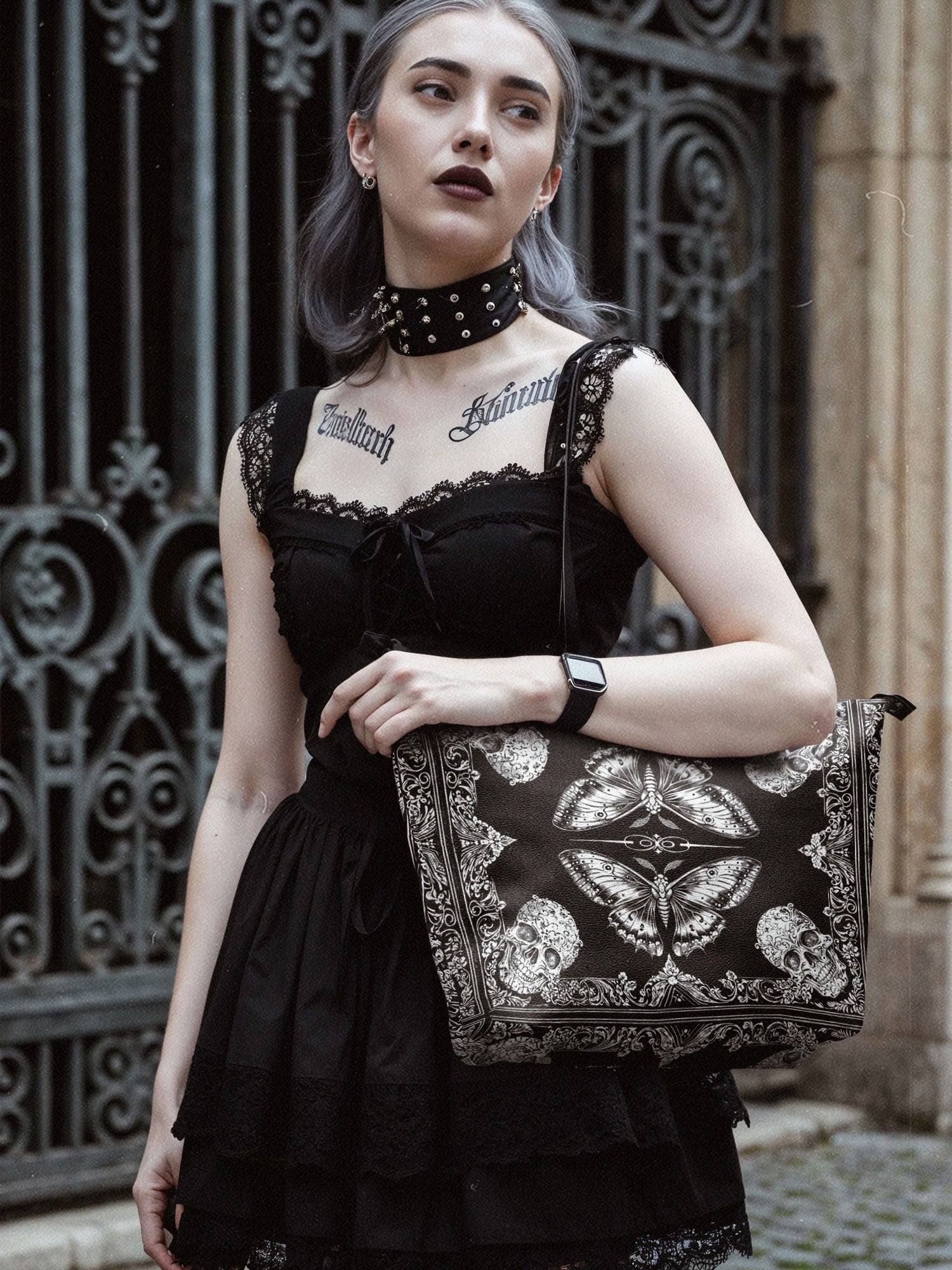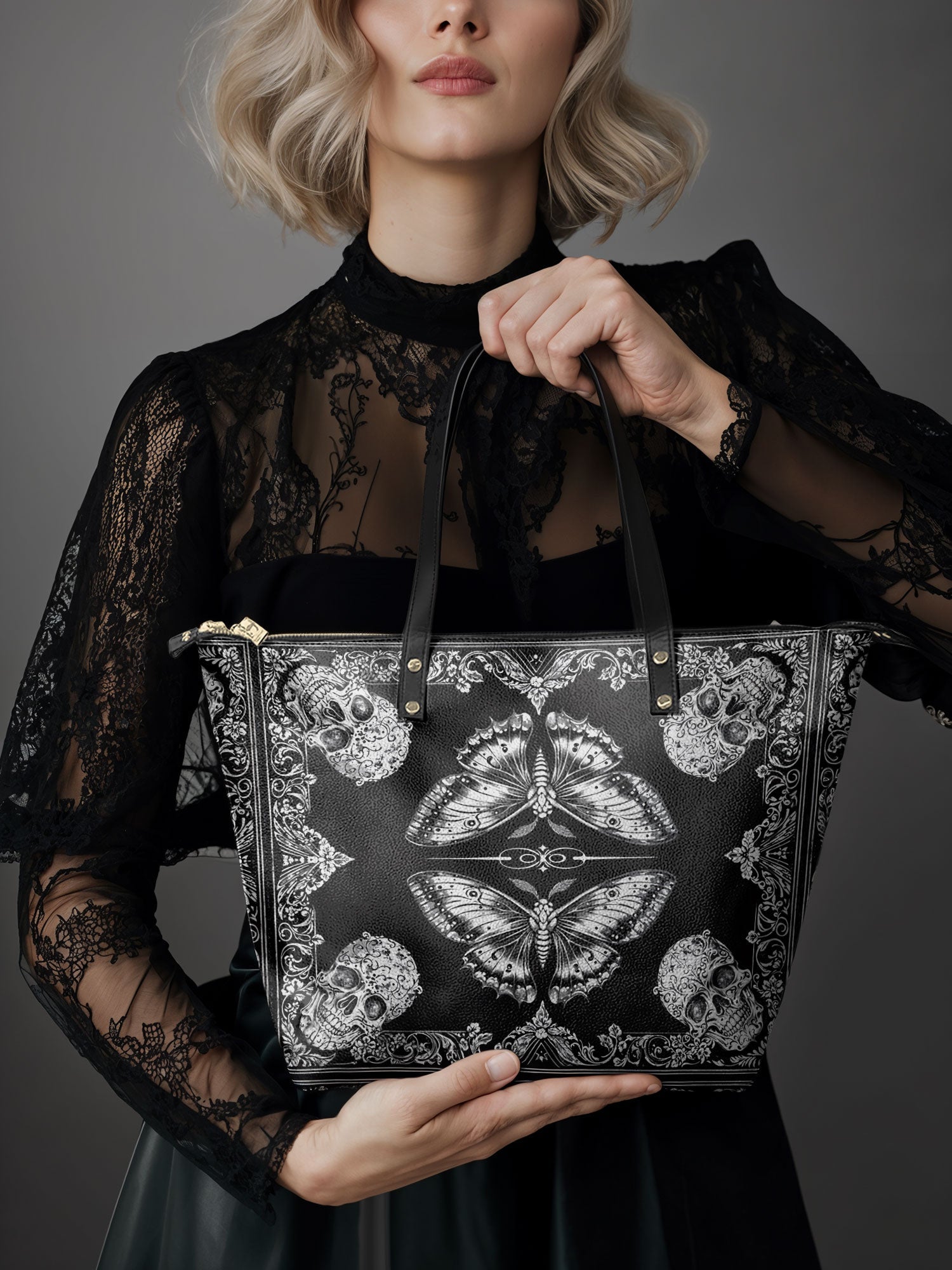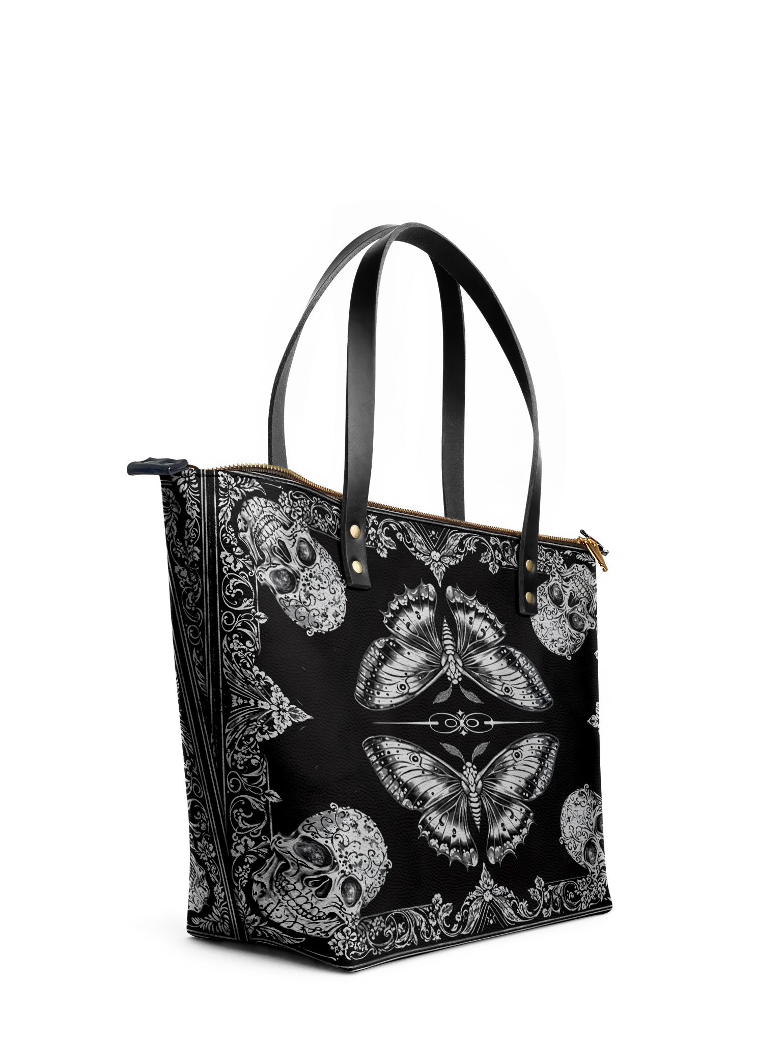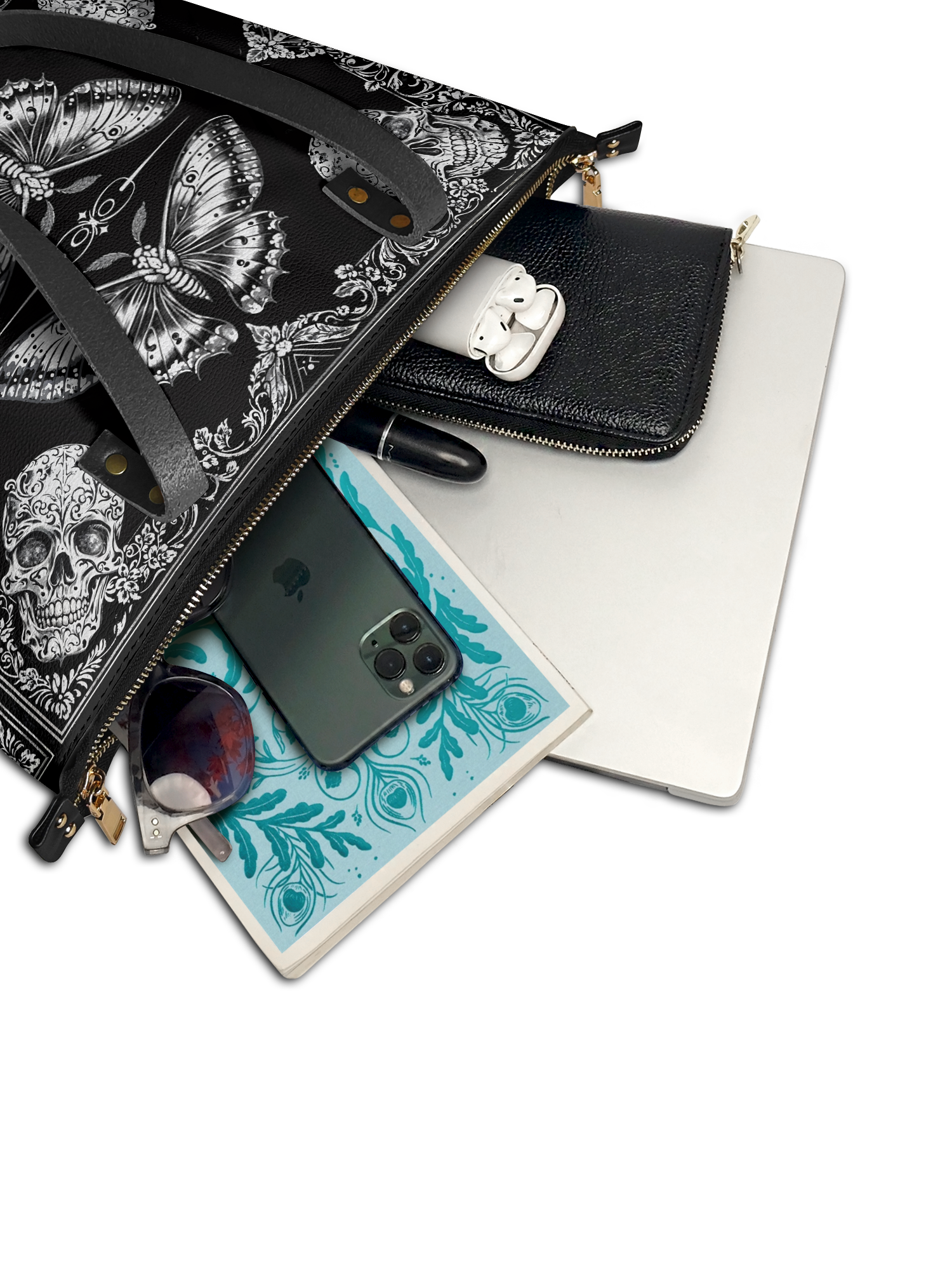 The Morthwing leather tote bag is where dark elegance takes flight. With its striking moth-and-skull motif framed in intricate gothic flourishes, this design evokes the mystique of transformation, mortality, and rebellion. The symmetrical black-and-white artwork commands attention while remaining effortlessly wearable. Crafted from premium vegan leather, this spacious tote offers room for all your essentials—whether you're headed to a bookshop, a concert, or a midnight stroll. It’s more than a bag—it’s a gothic spell wrapped in leather.