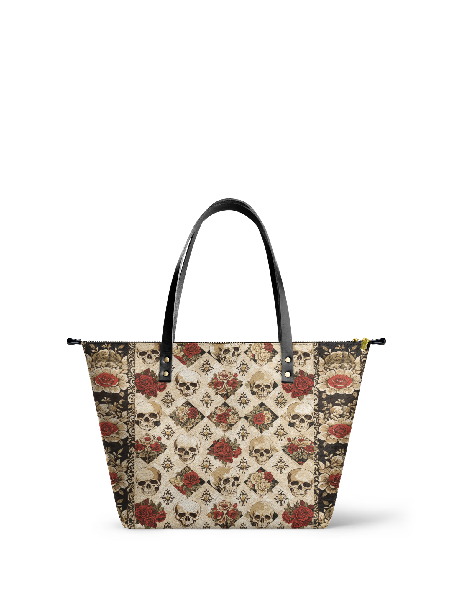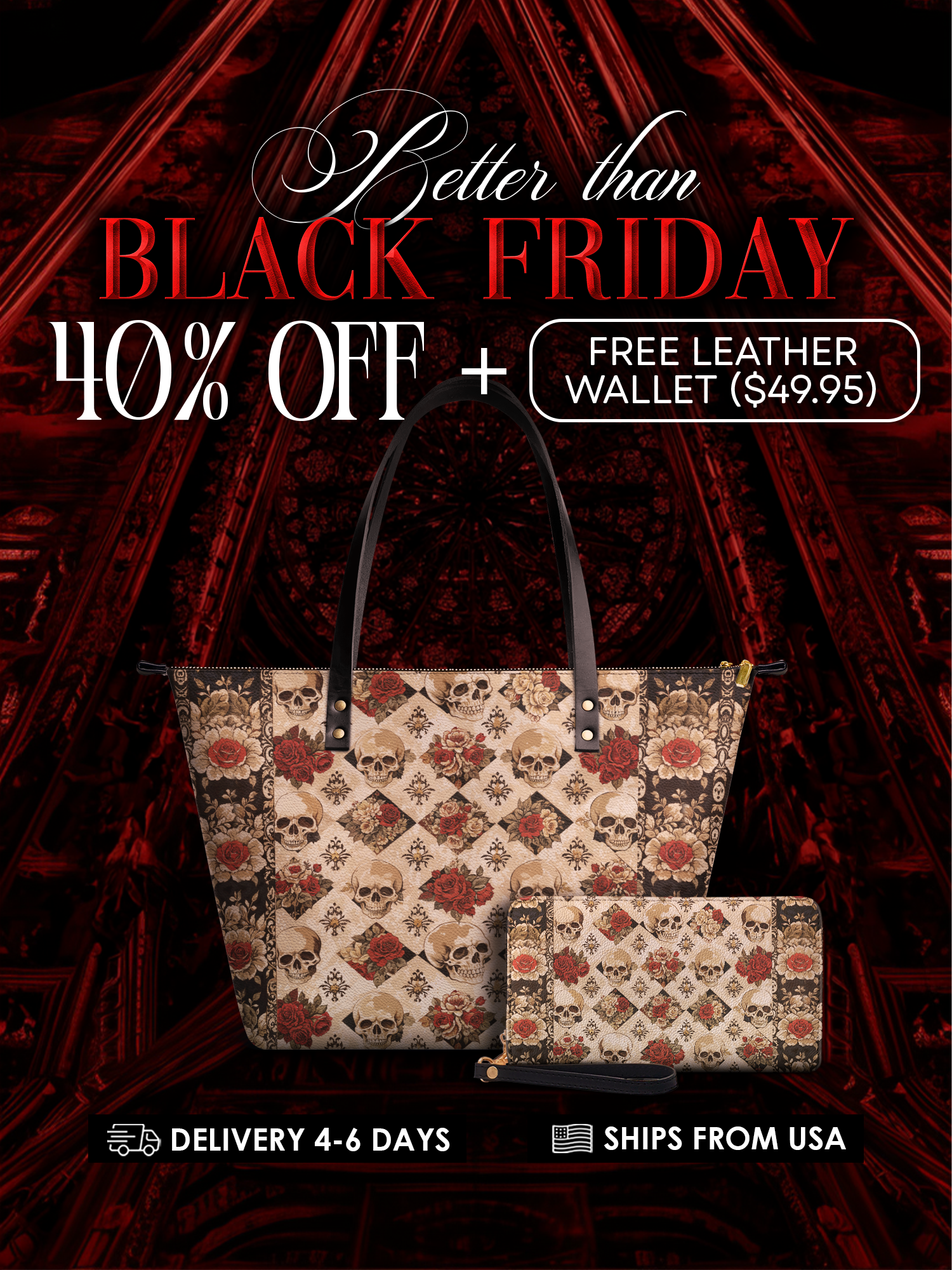 The "Mournaire" leather tote is soft, roomy, and bold in all the right ways. Skulls and roses cover every inch—because your style deserves a little drama. It zips up easy, holds a ton, and turns heads without even trying.
