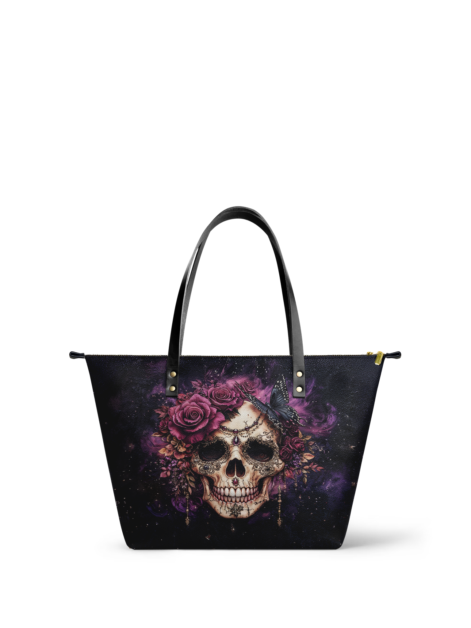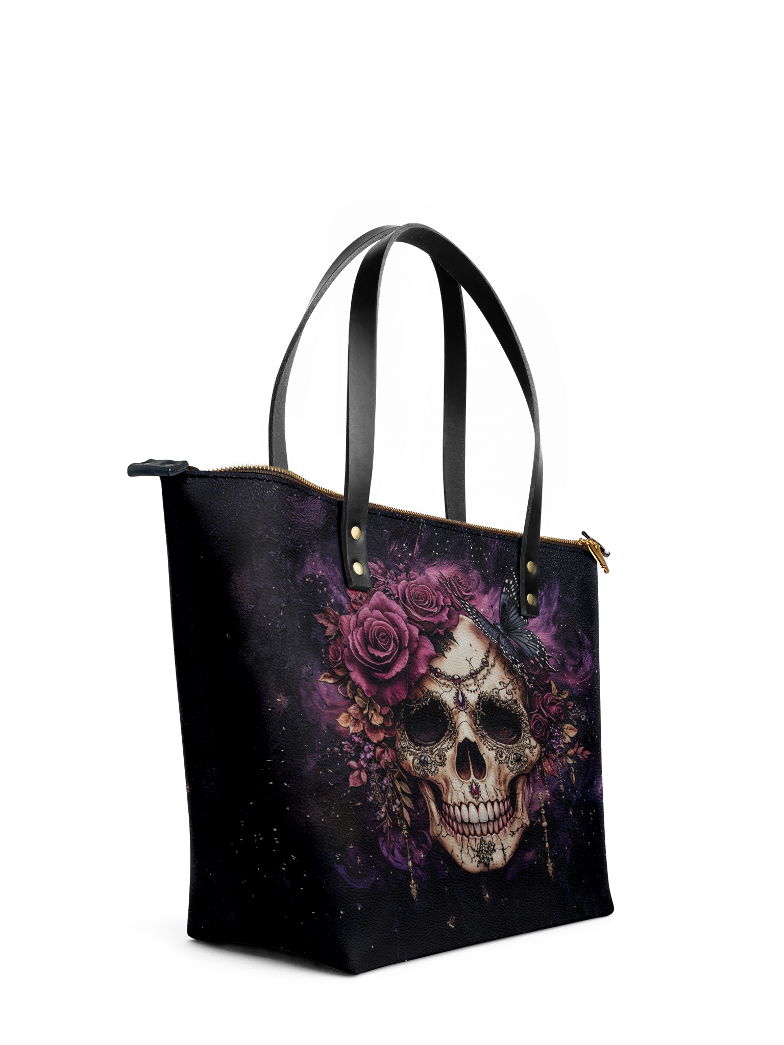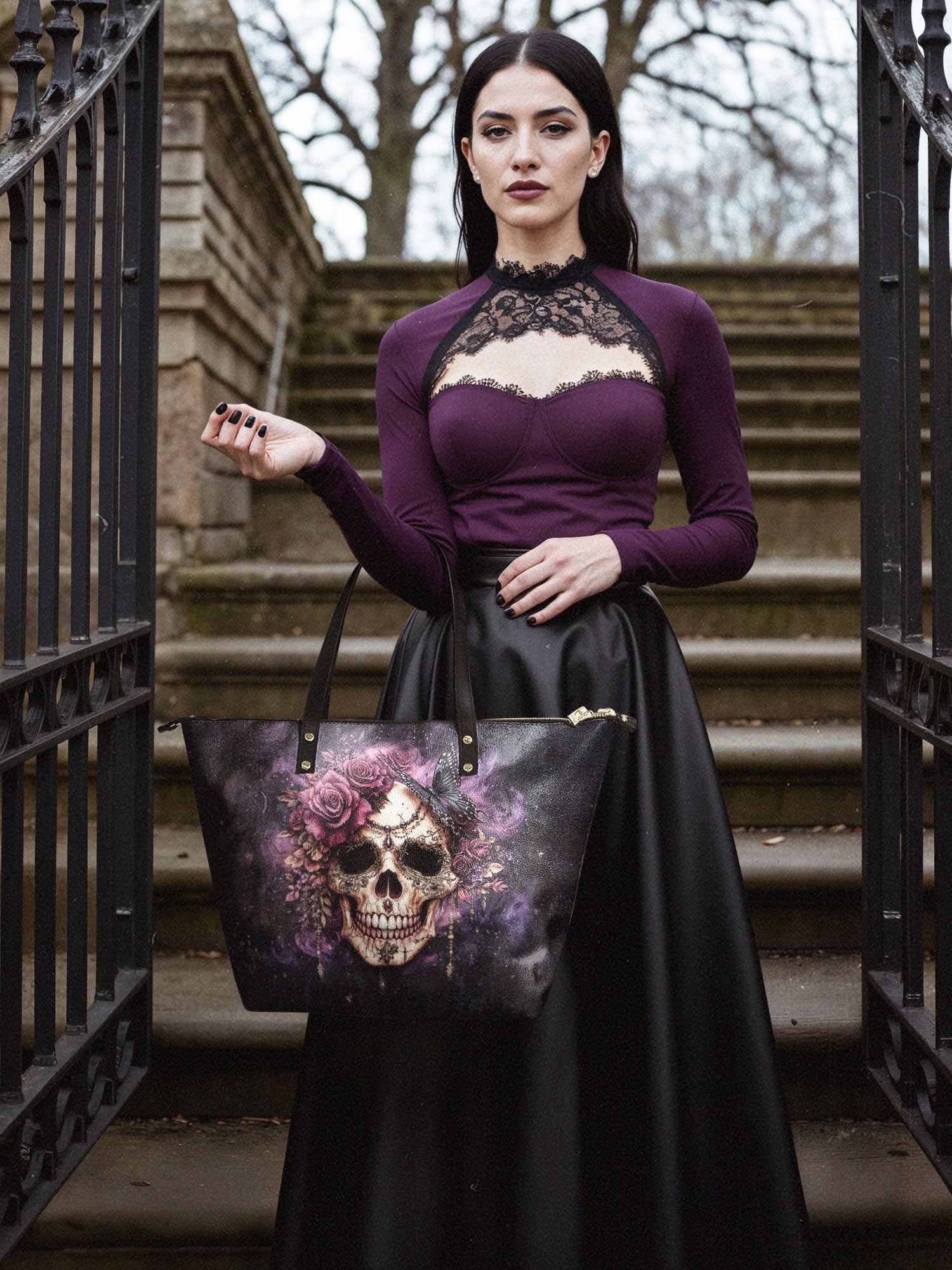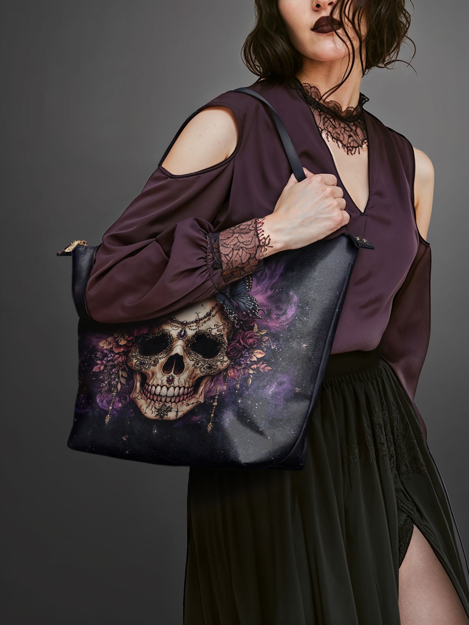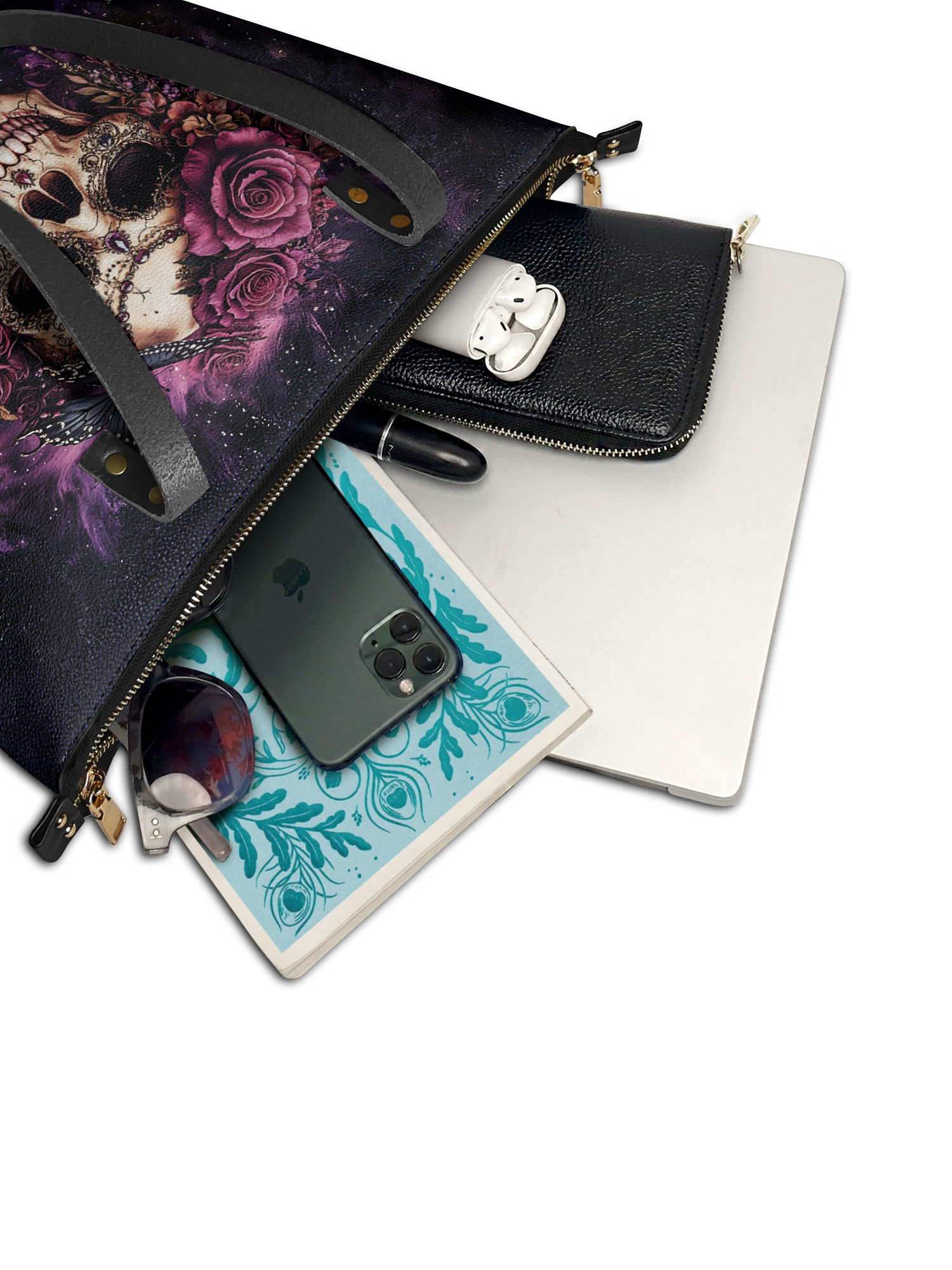 The Noxaria leather tote bag is gothic elegance reimagined. A hauntingly beautiful skull crowned with lush plum roses, delicate gold chains, and a resting black butterfly creates a striking centerpiece—set against a swirling backdrop of deep space purples and shadows. This spacious tote is crafted from buttery soft vegan leather, designed for those who carry darkness with grace. Whether you're wandering moonlit streets or heading into the everyday unknown, Noxaria is your bold companion.