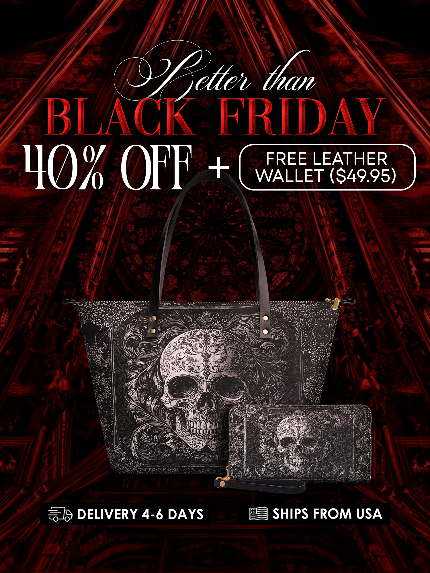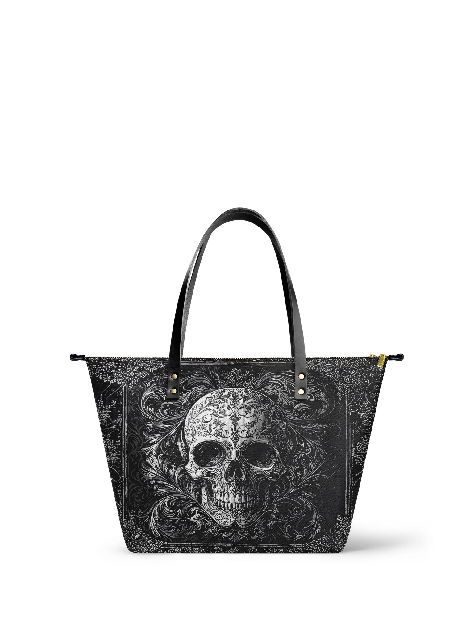The Obscuria leather tote bag is your new go-to for dark, commanding style. A hauntingly ornate skull emerges from a swirl of gothic filigree—etched in silver over deep black vegan leather. It's bold. It's baroque. And it carries serious attitude. With long shoulder straps and a roomy zippered interior, this tote blends function with fierce fashion. Whether you’re headed to the bookstore, coffee shop, or the shadows of the night—Obscuria makes sure you arrive in statement-making style.