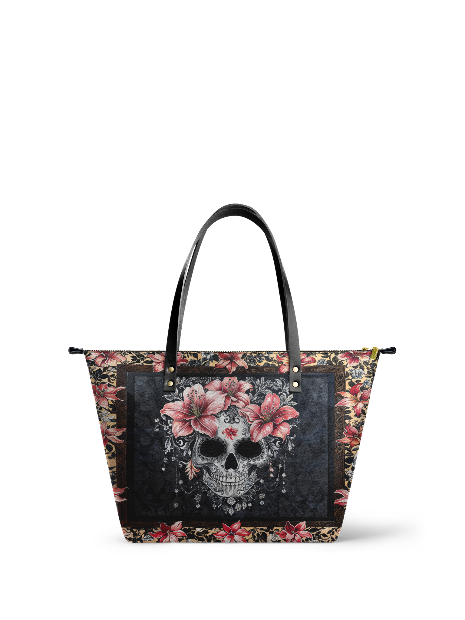 The "Roselace" leather tote is roomy, edgy, and full of vibes. That skull-and-flower design? It turns heads. The leather? Soft and strong. And yes, it zips—so your stuff stays safe.