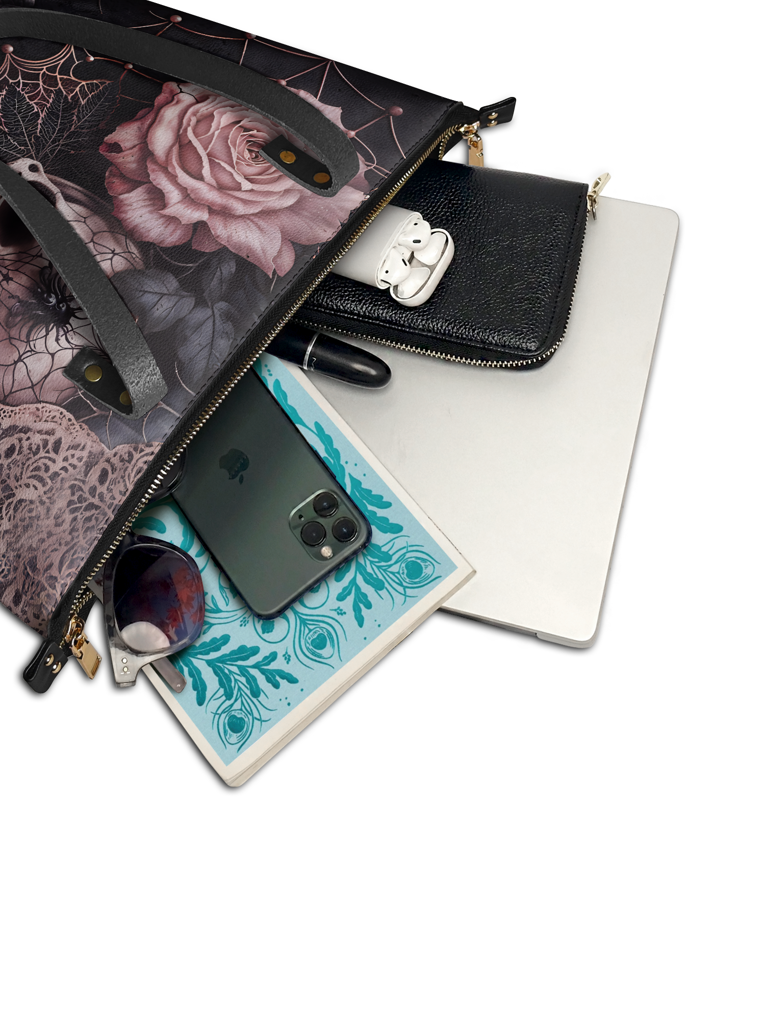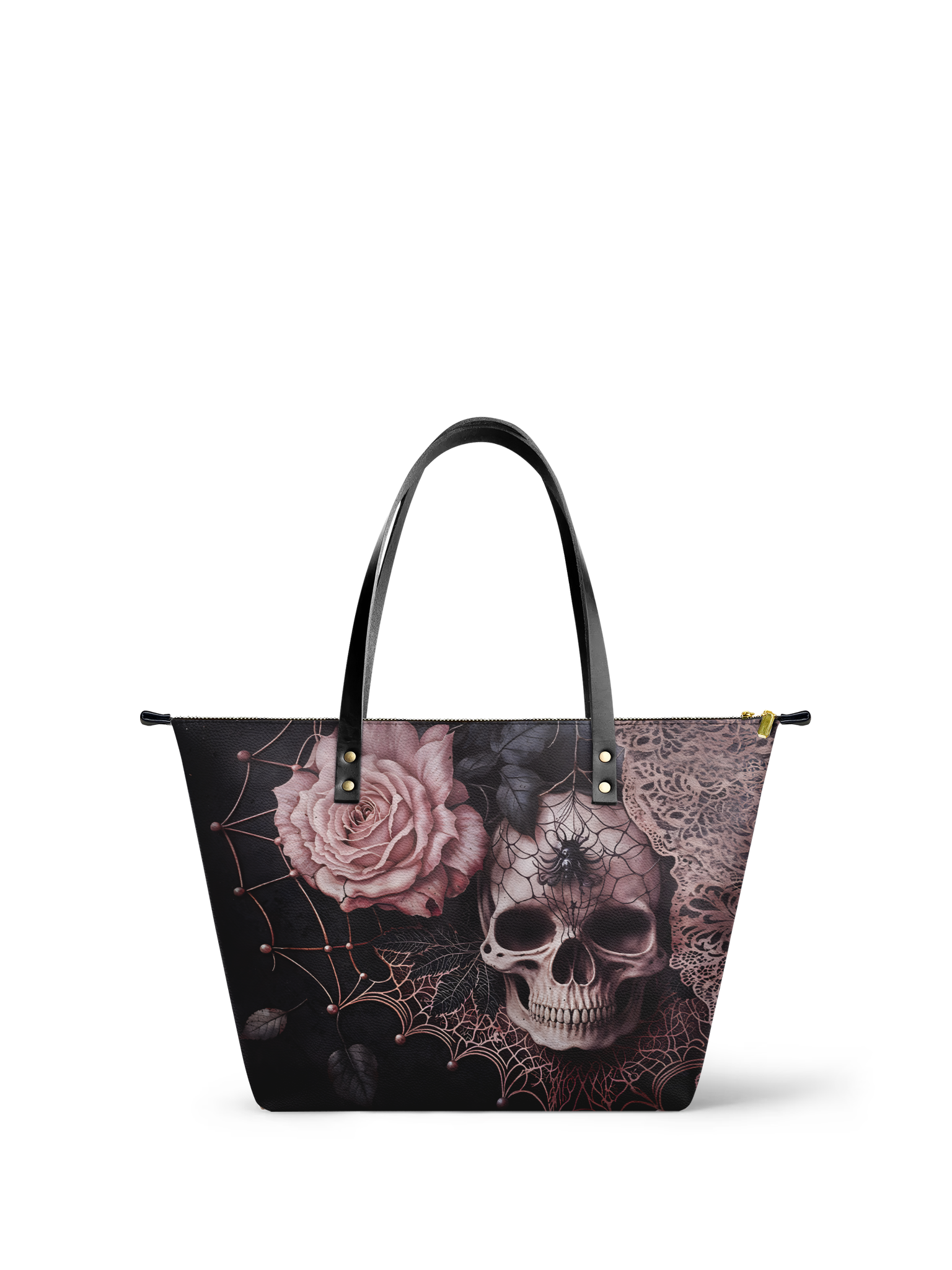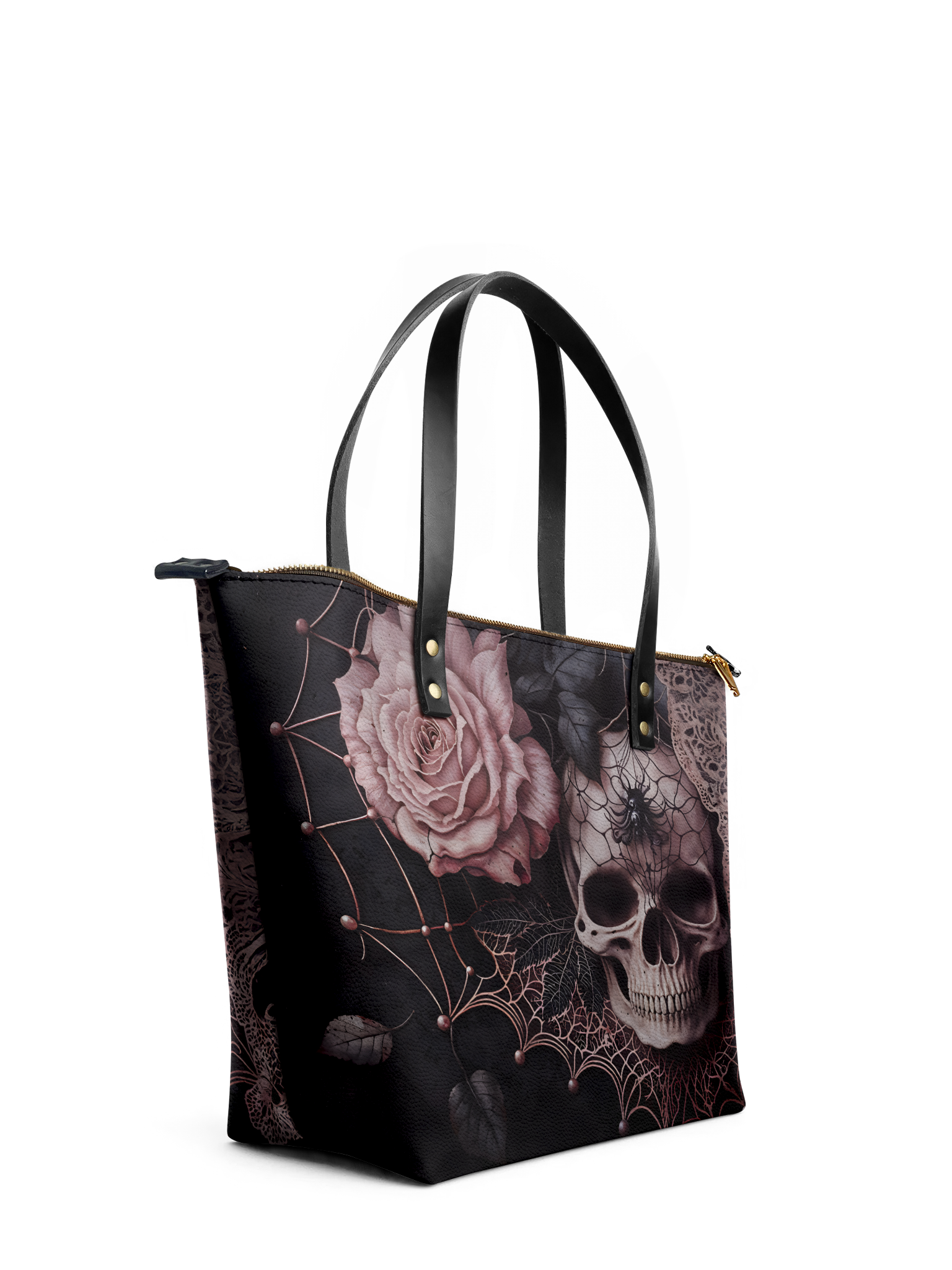 The Venomina leather tote bag is a haunting masterpiece made for the elegantly sinister. Featuring a delicate yet deadly design—an ivory skull crowned with a spider, nestled among dusky roses and webs—it’s the kind of bag that whispers gothic poetry with every glance. Crafted from premium vegan leather with strong shoulder straps and a spacious zip-top interior, this tote isn’t just about looks—it’s built to carry your secrets, spells, and everyday essentials. For the femme fatale who blooms in the shadows.