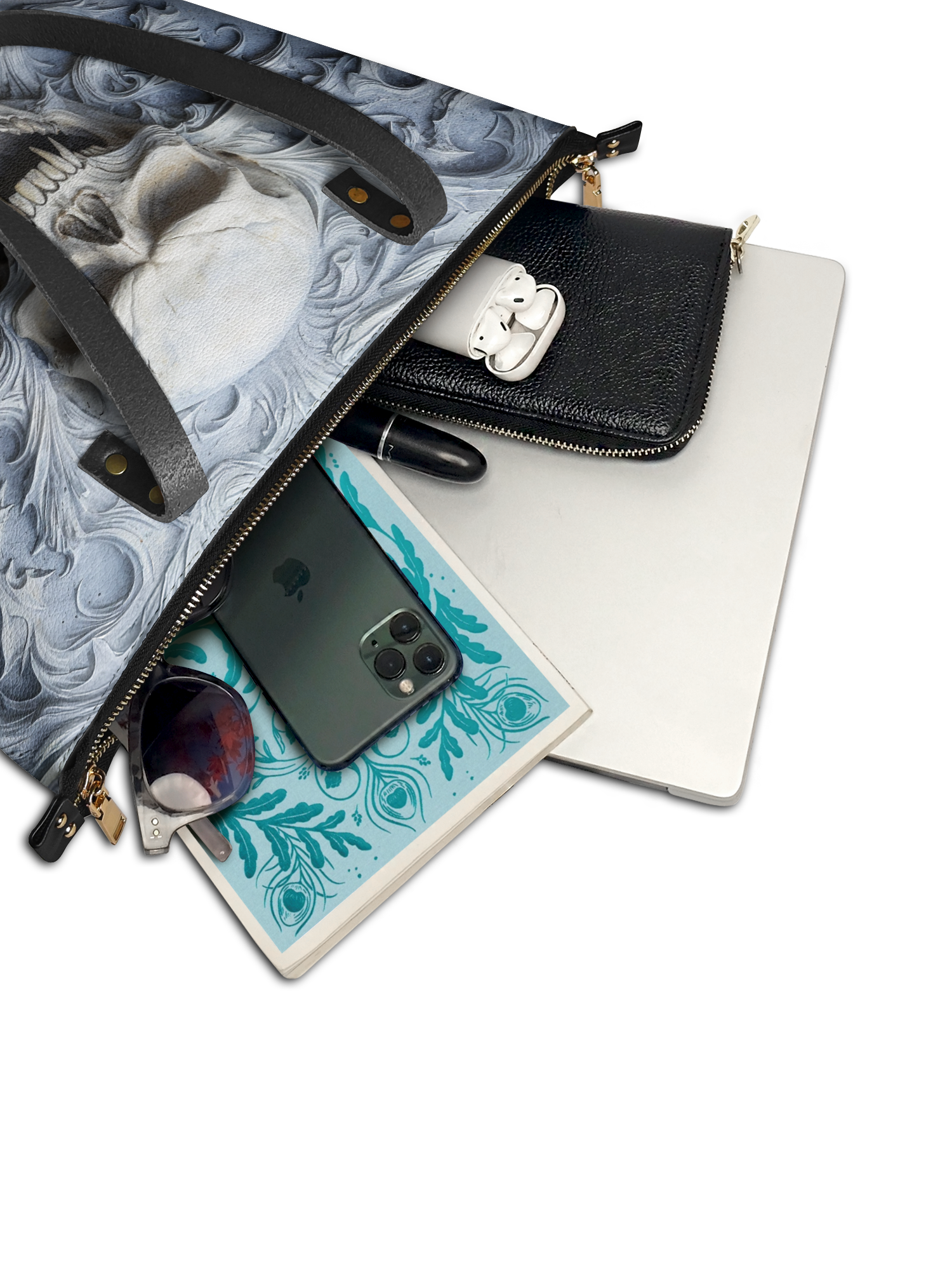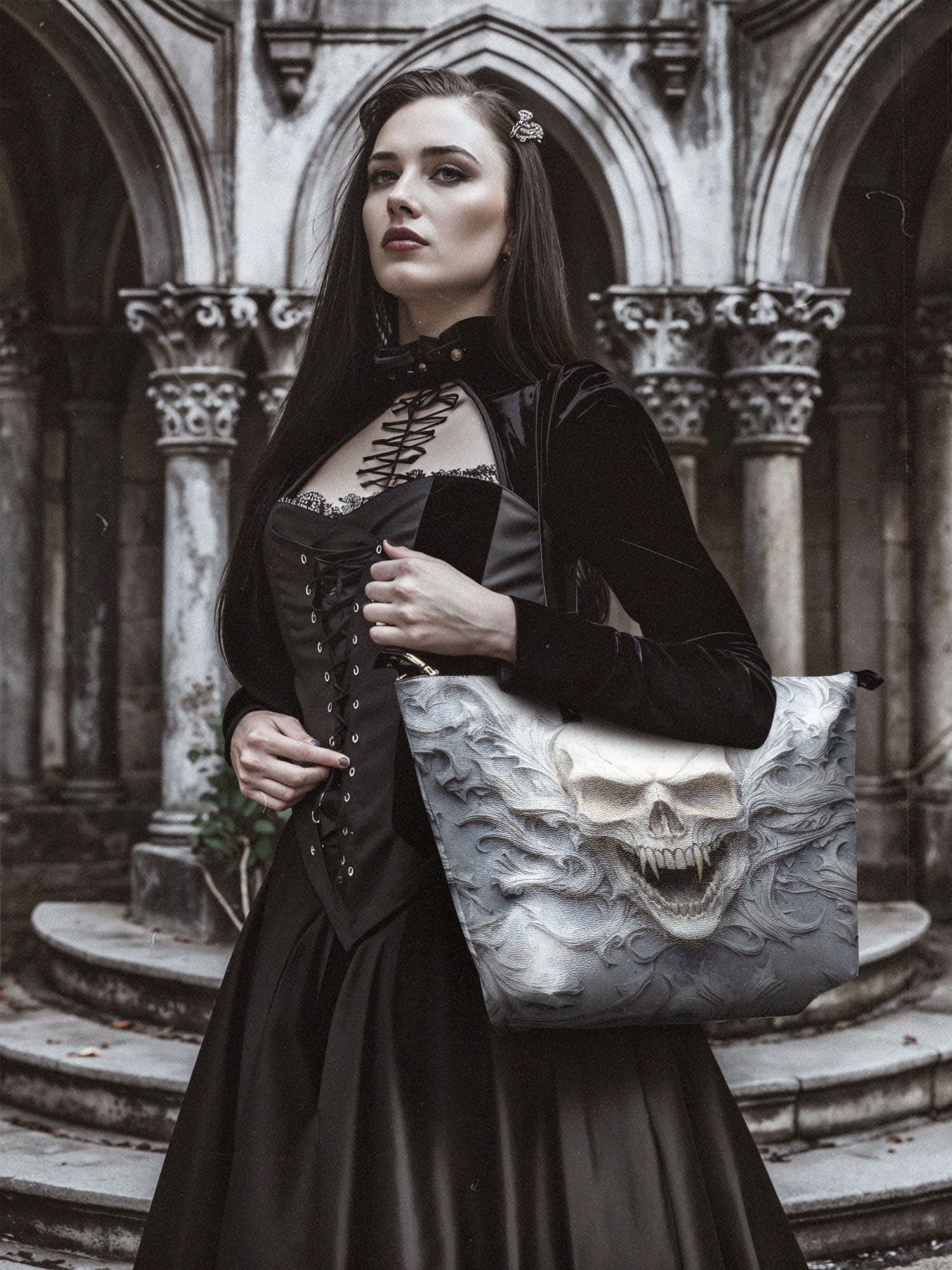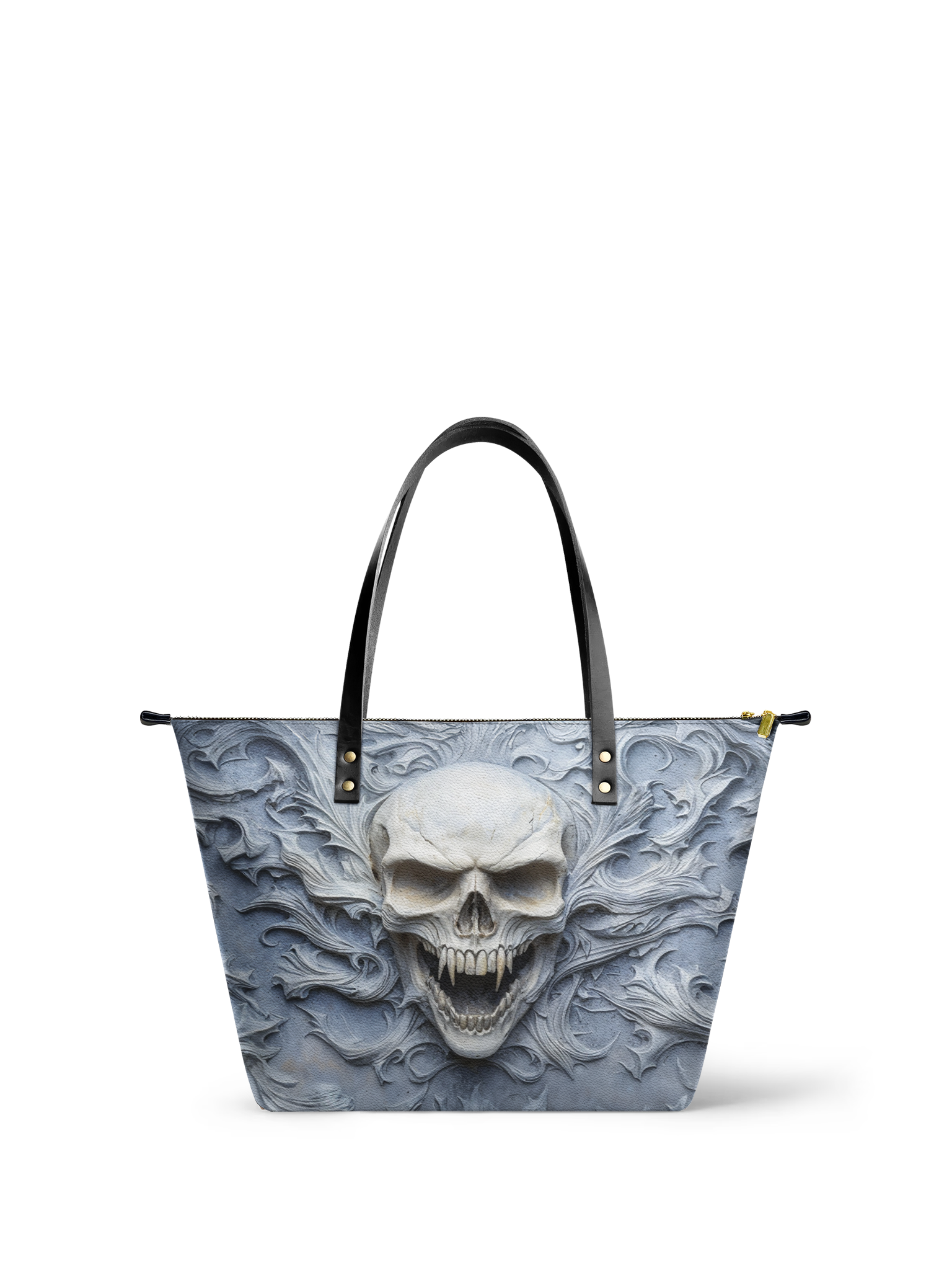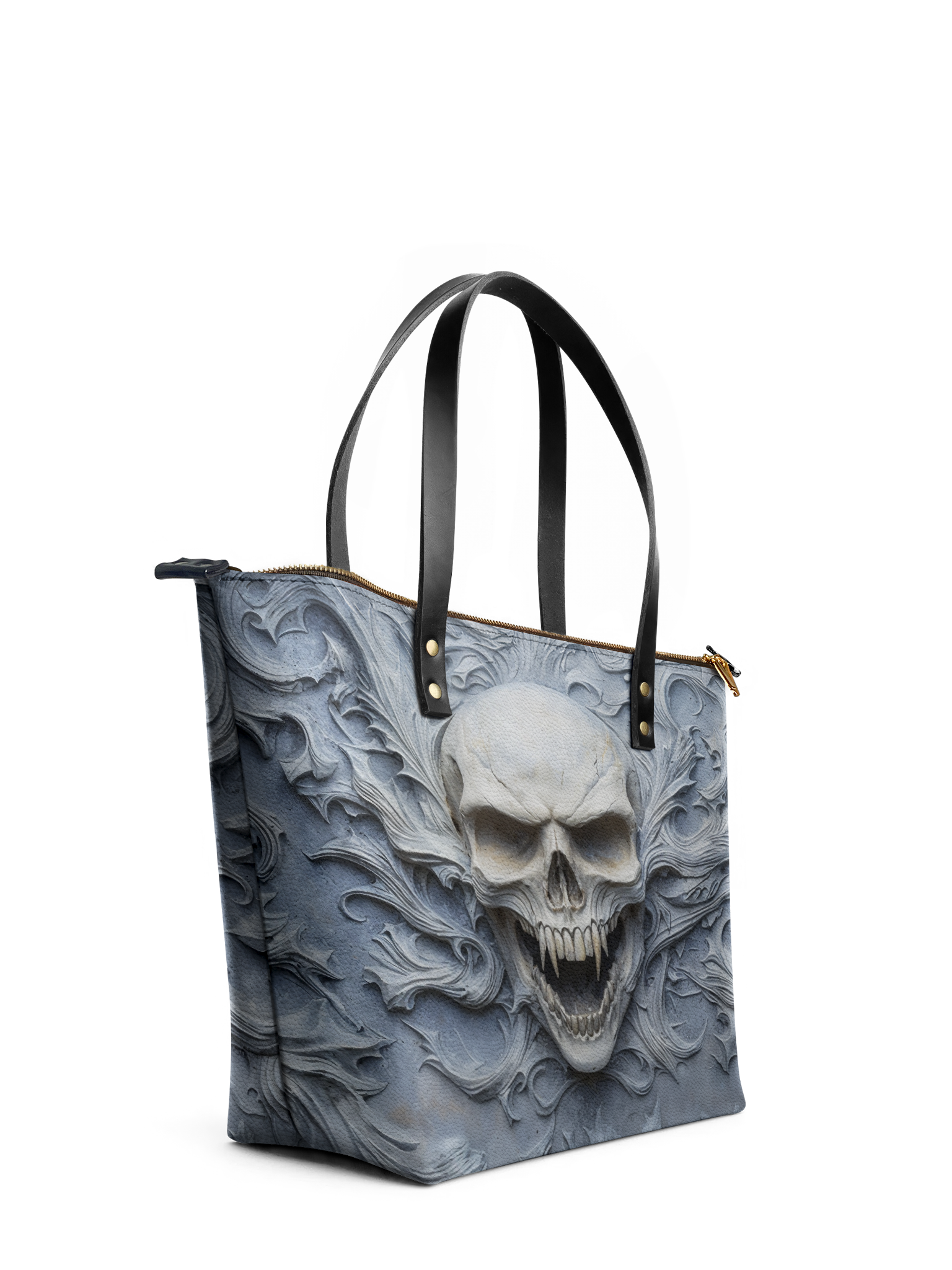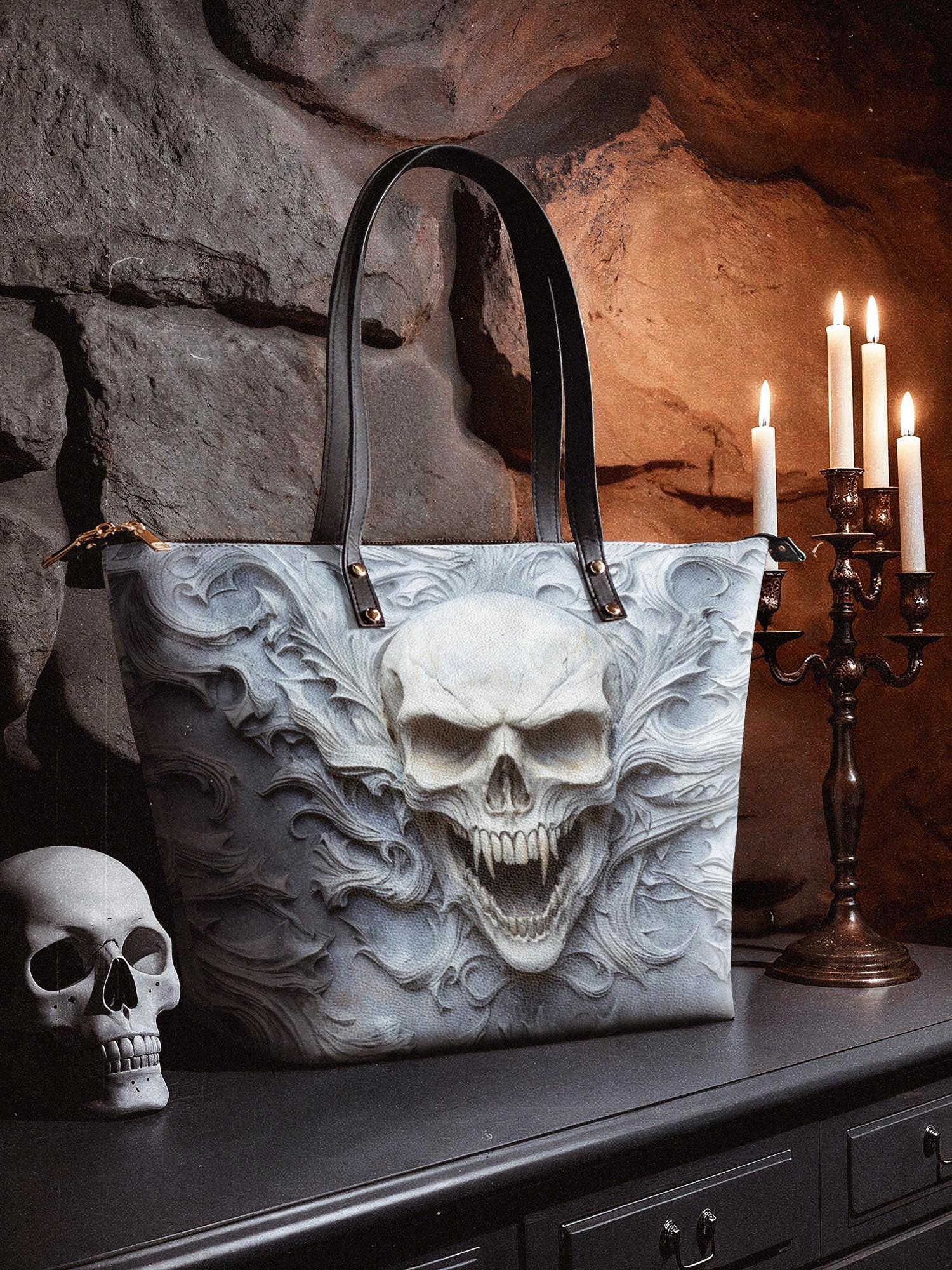 The Wraithbone leather tote bag is a chilling tribute to the bold and the fearless. With a bone-white skull rising from swirling spectral carvings, it feels like a relic torn from ancient tombstone artistry—haunting, powerful, and impossible to ignore. Crafted from high-quality vegan leather and finished with black handles and gold-tone hardware, this spacious tote delivers both eerie elegance and everyday function. It’s perfect for those who carry shadows, style, and a spine of steel.