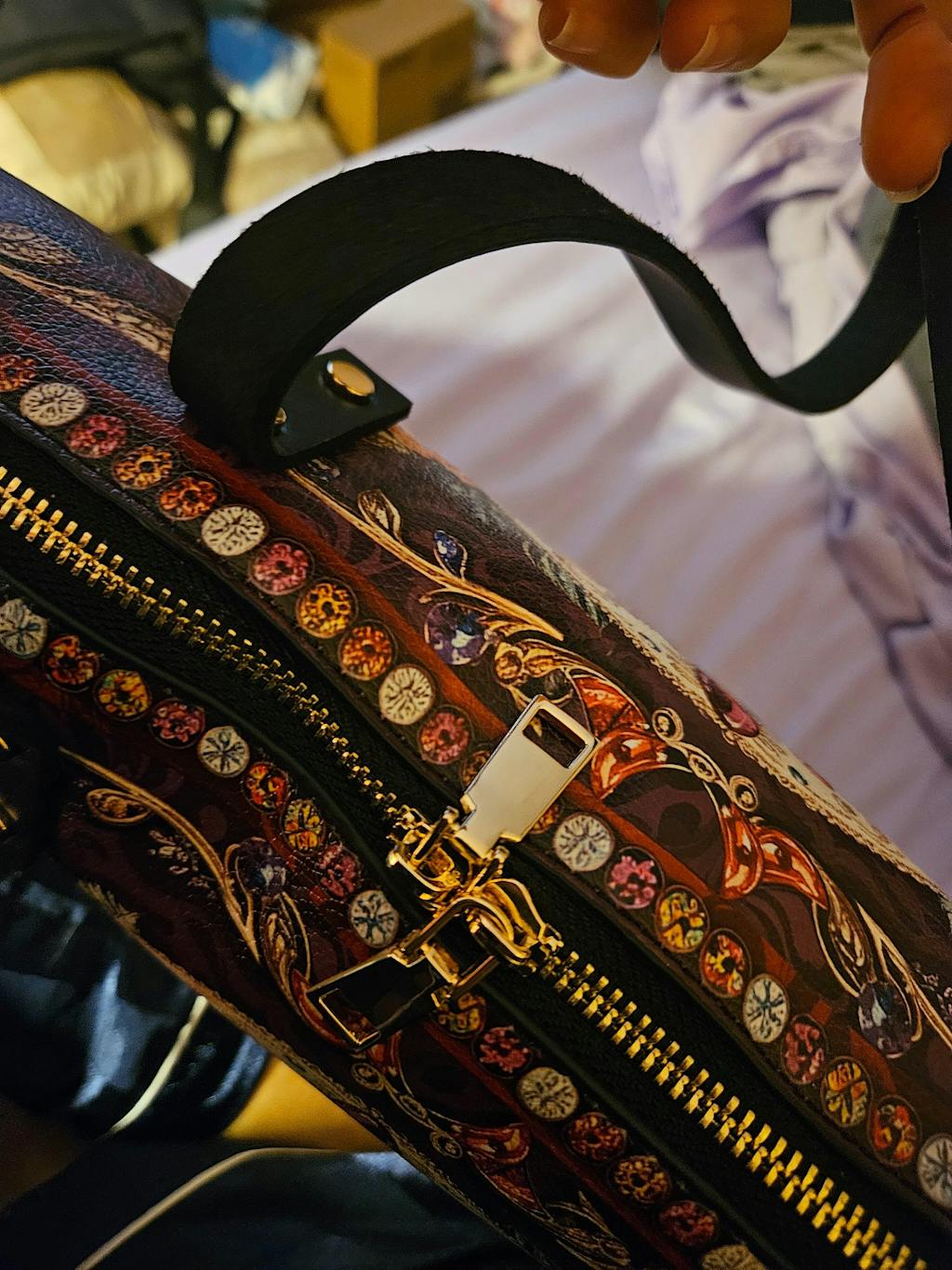 This is a gift for my daughter who loves this esthetic. The purse is so gorgeous, I was seriously keeping it for myself. The purse is very well made. I love the sturdy zipper to close it up (she works in the French Quarter). The strap attaches in a way that it does not strange if you decide not to use it making it very versatile. Highly recommend!