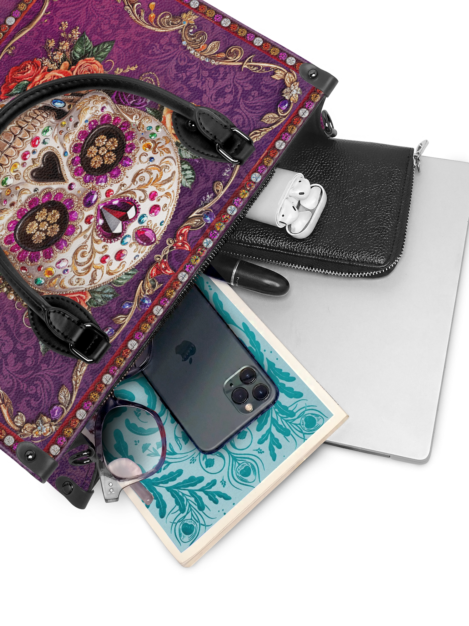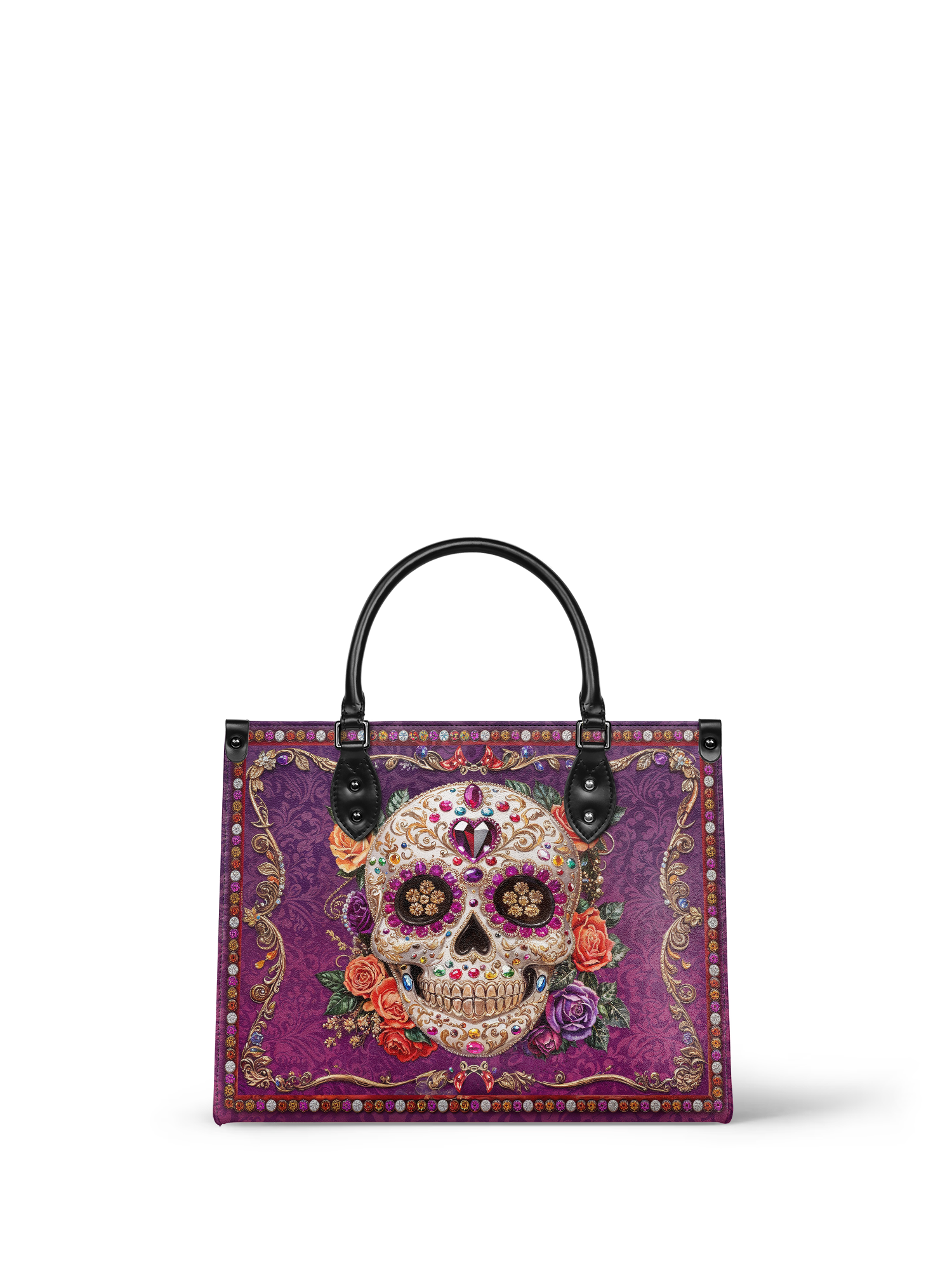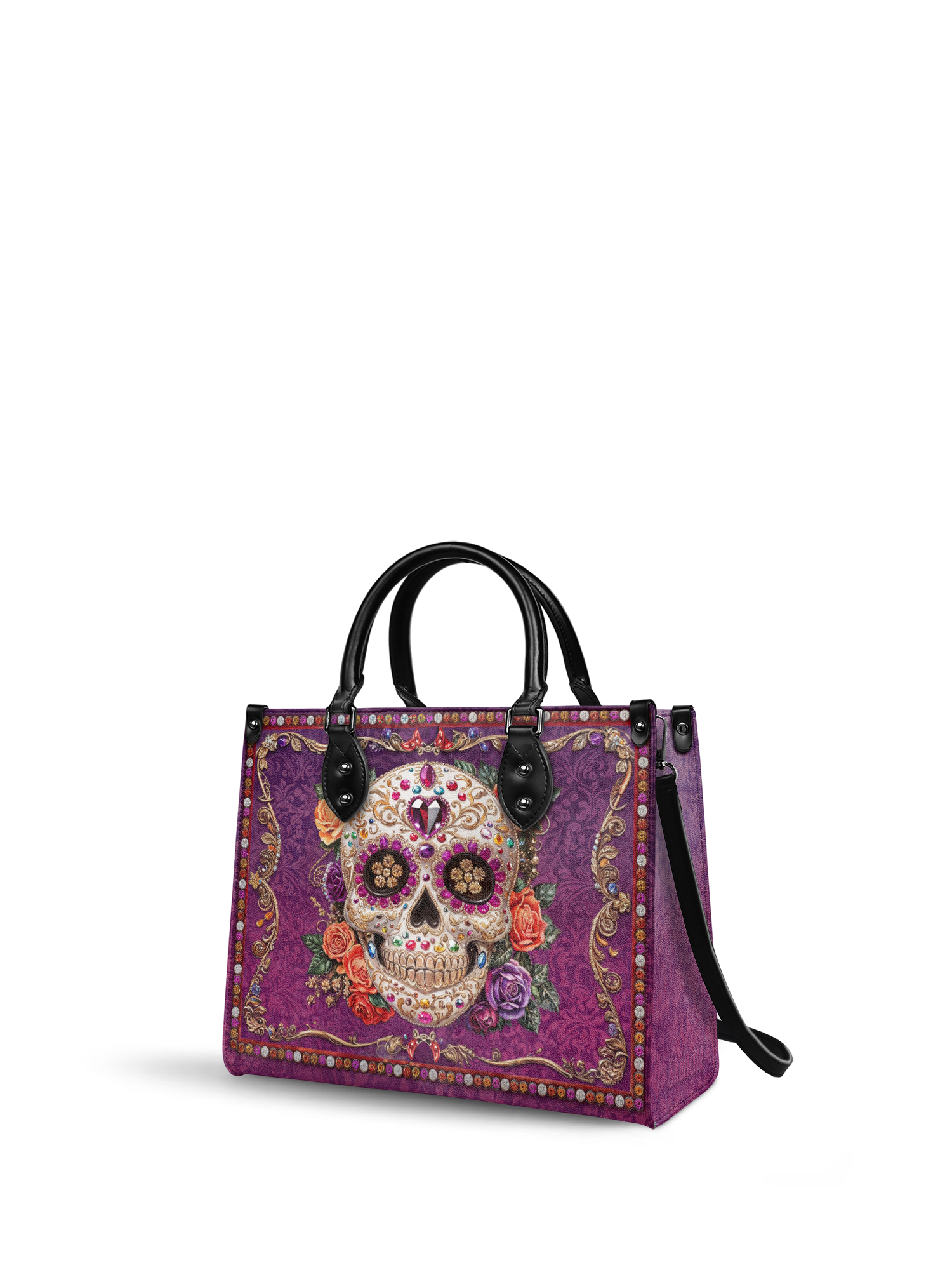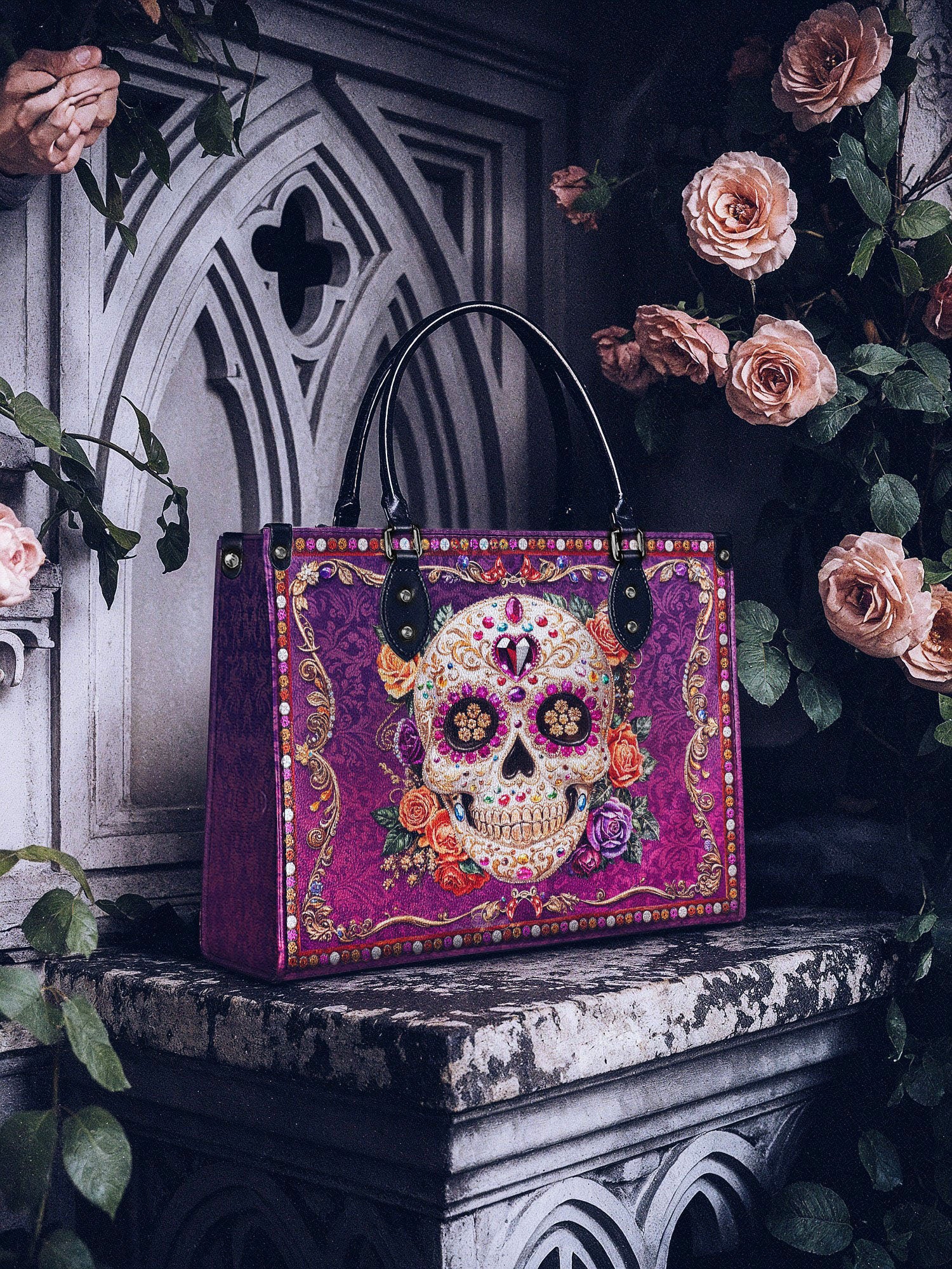 The "Catrinelle" leather bag is pure celebration. With a jeweled sugar skull, glowing florals, and a bold purple backdrop, this bag brings all the joy and all the drama.