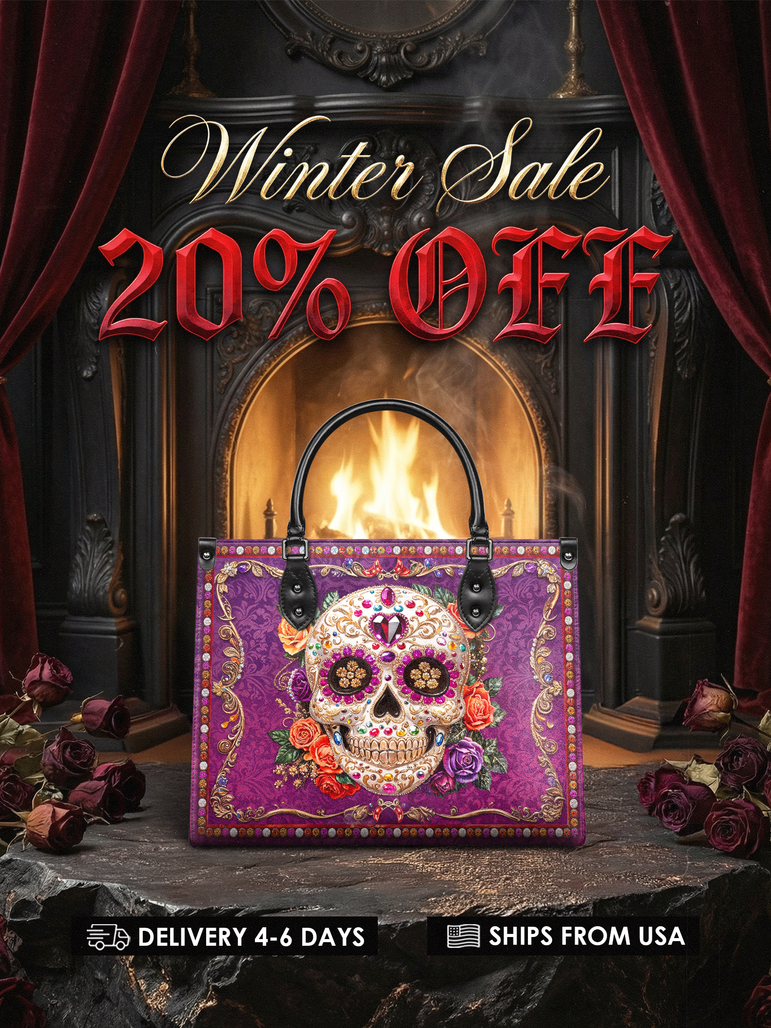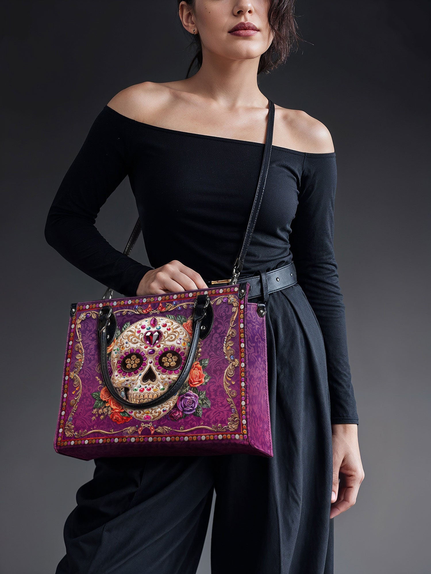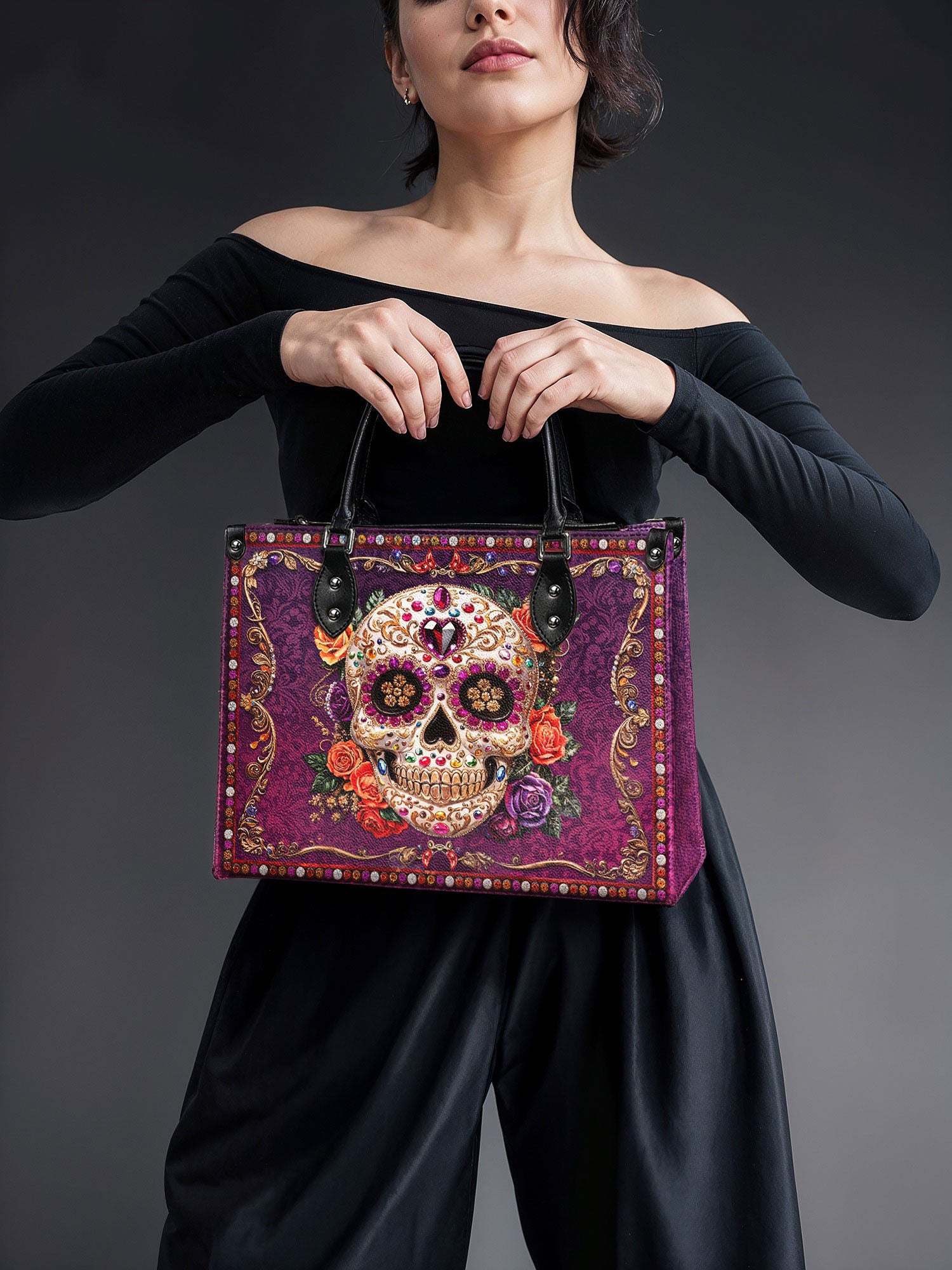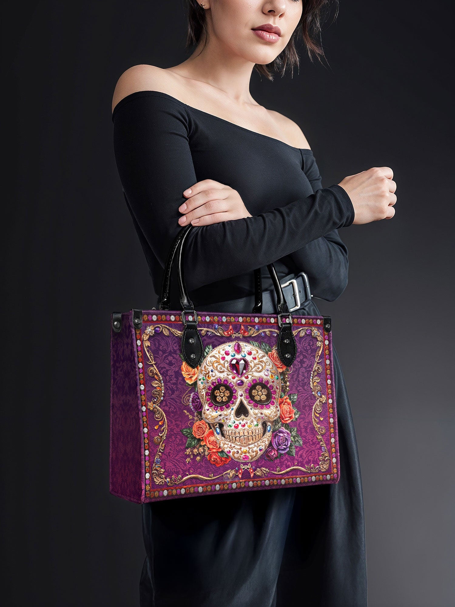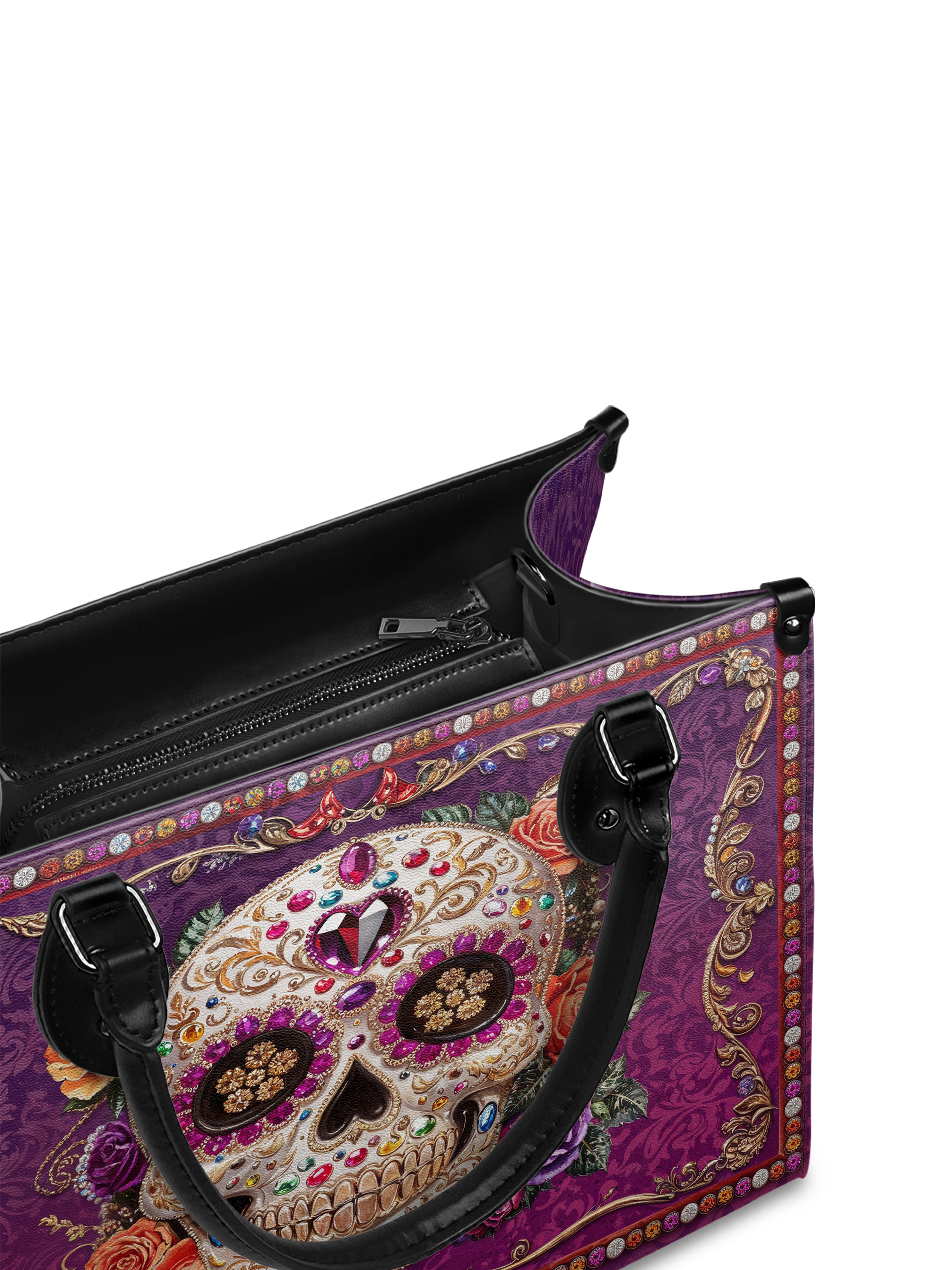 The "Catrinelle" leather bag is pure celebration. With a jeweled sugar skull, glowing florals, and a bold purple backdrop, this bag brings all the joy and all the drama.