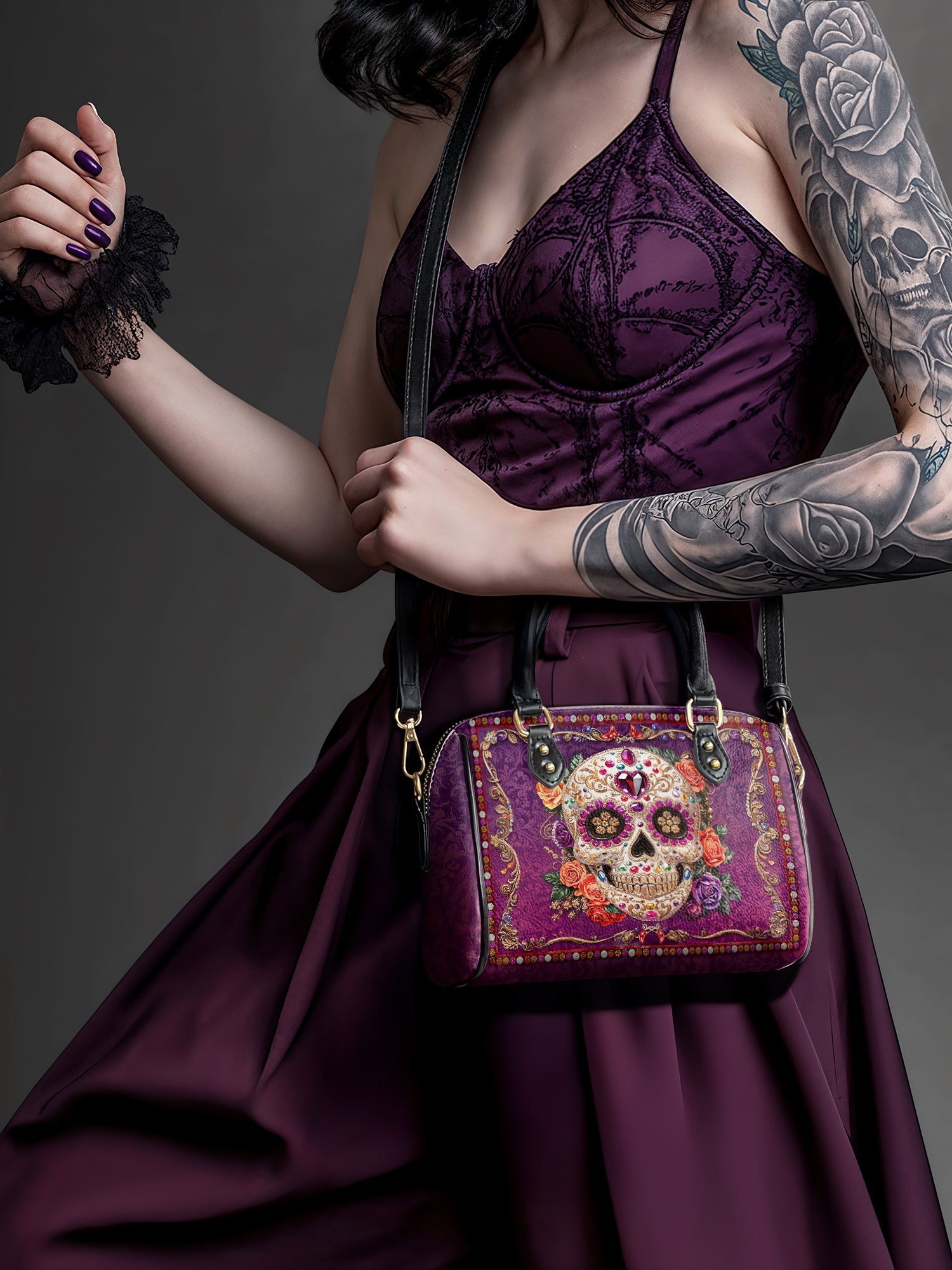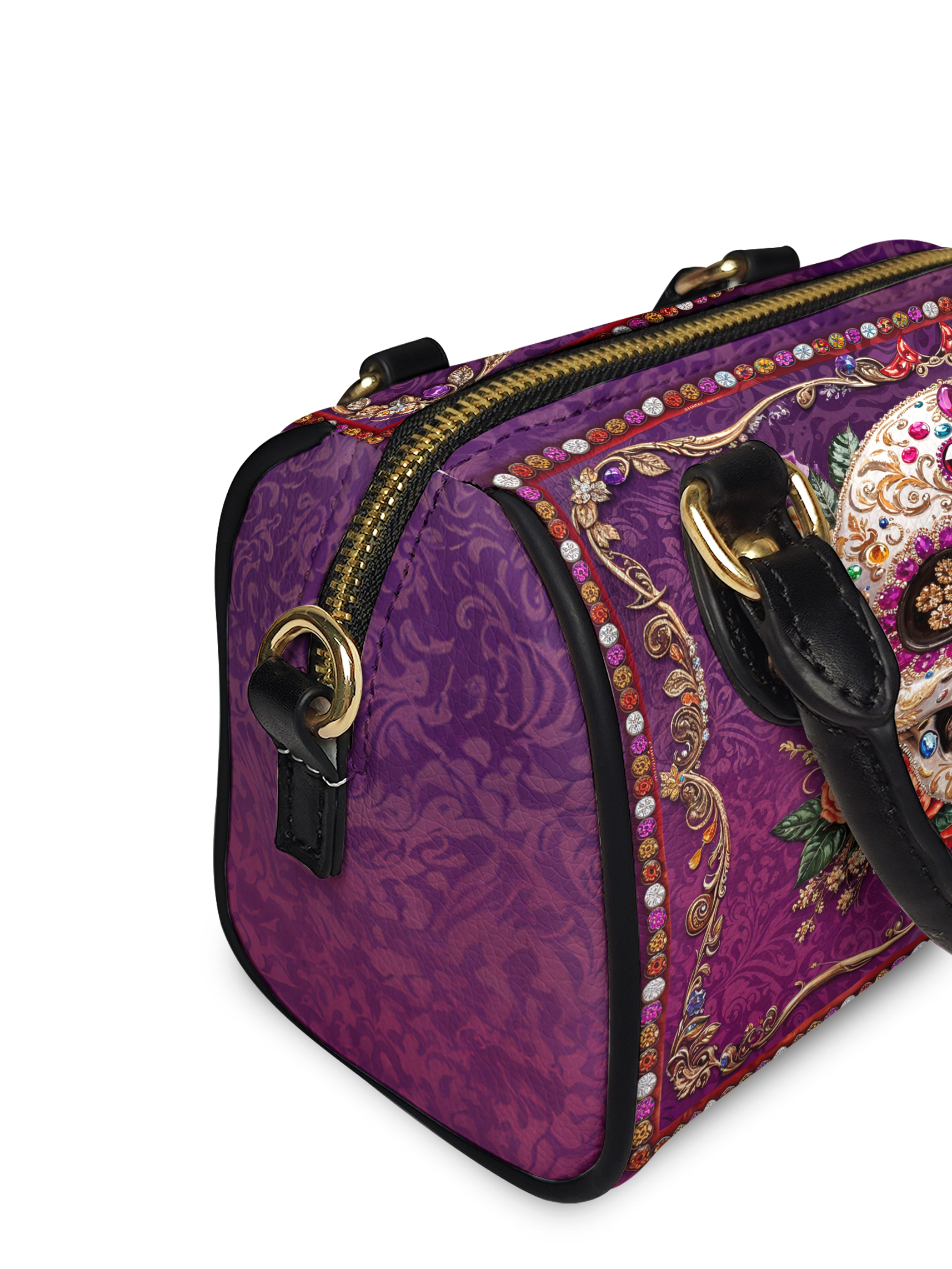 The Catrinelle mini satchel is a radiant homage to elegance beyond the veil. Named after La Catrina—the iconic lady of Día de los Muertos—this bag dazzles with a jewel-adorned sugar skull framed by rich florals and golden scrollwork. Set against a royal purple backdrop, every detail glows with reverence and flair. Compact yet commanding, it’s for those who carry their culture, spirit, and sparkle with pride.