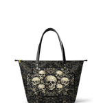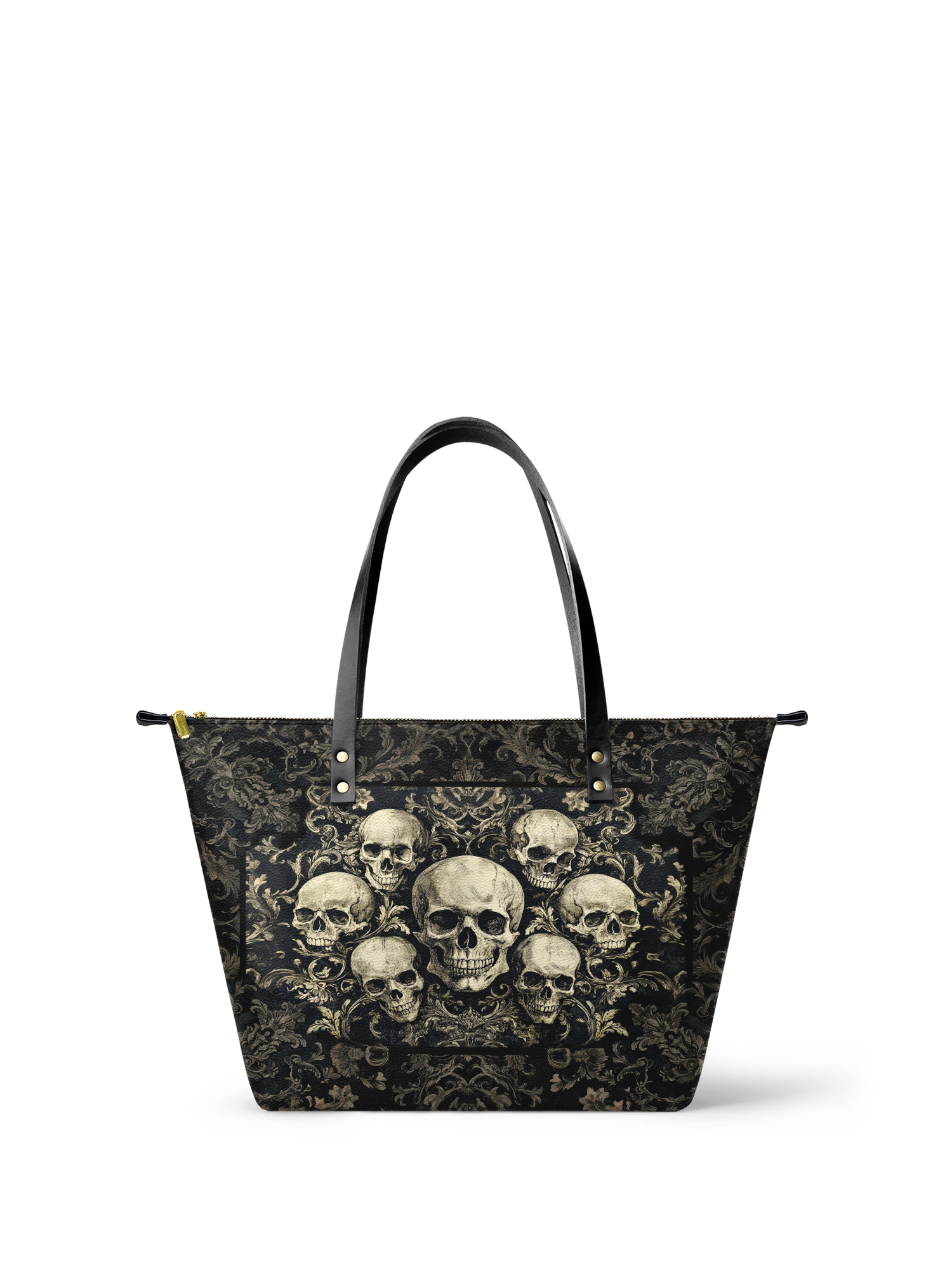 This leather tote brings the drama with bold skull art and baroque-style swirls. It’s roomy, zips up tight, and makes any outfit feel a little more powerful.
