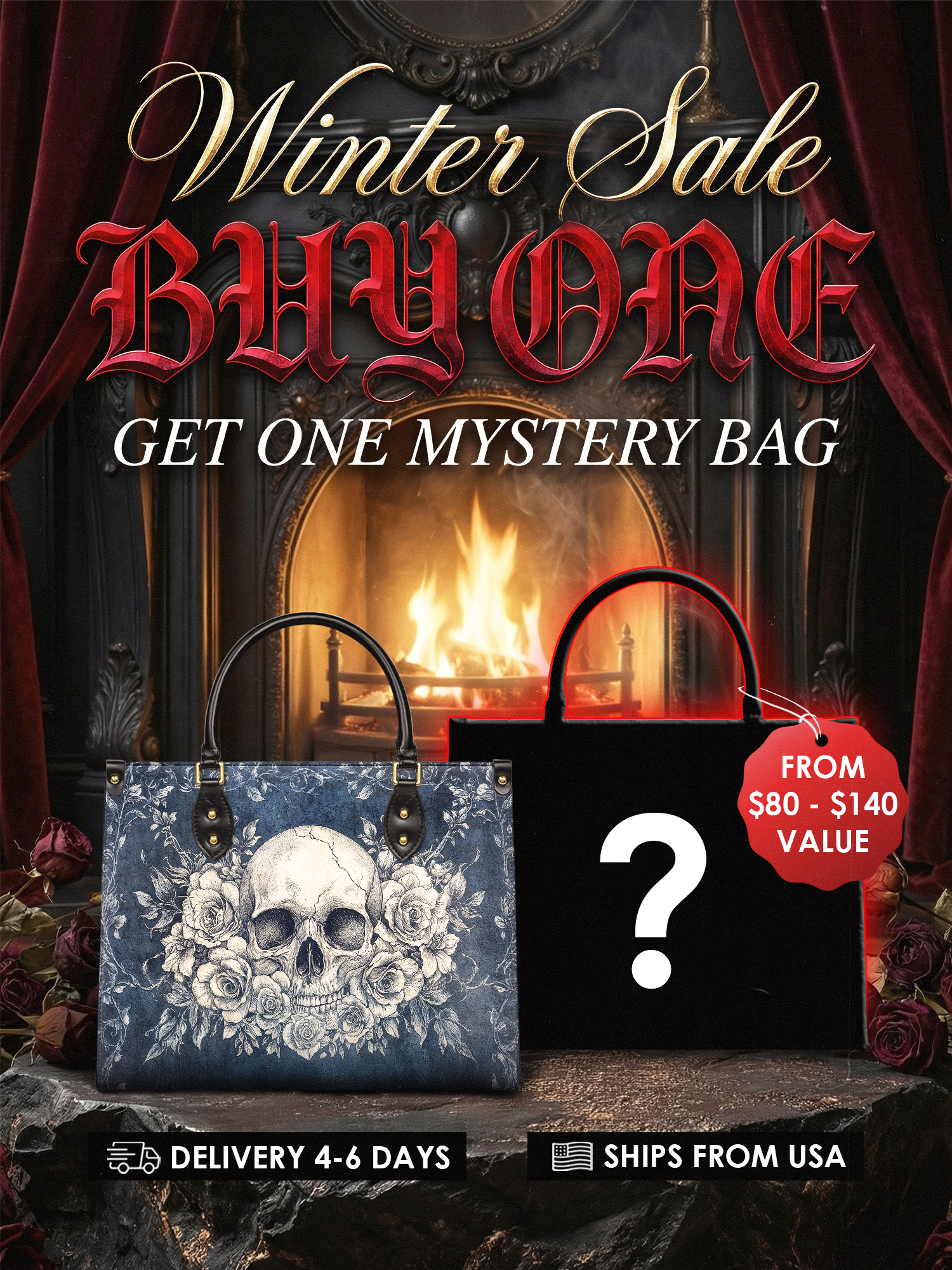 The "Frostmourne" leather bag is icy blue with a haunting floral twist. That skull? Softly fierce. The roses? Frozen in time. Made with buttery leather and black handles, it’s the kind of bag that whispers power.