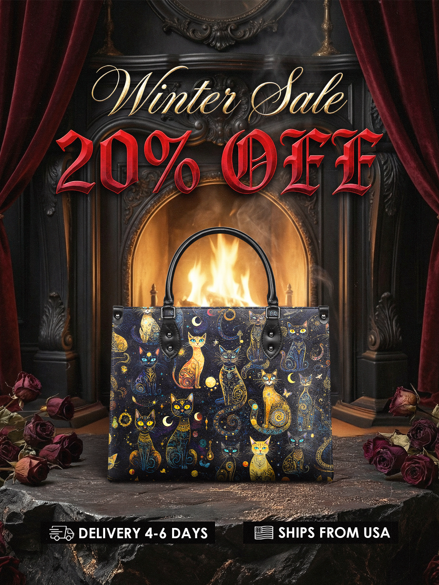 The Lunacat leather handbag is a spellbinding blend of feline grace and celestial mystery. Wrapped in a tapestry of moonlit cats—each adorned with cosmic swirls, stars, and lunar motifs—this bag turns every glance into a second look. Set against a deep midnight background, the gold and sapphire accents shimmer like stardust. With structured handles, sleek silhouette, and rich leather texture, it’s perfect for the cat lover with a cosmic soul. Whether you’re prowling through the city or moon-gazing in silence, Lunacat keeps your style aligned with the stars.