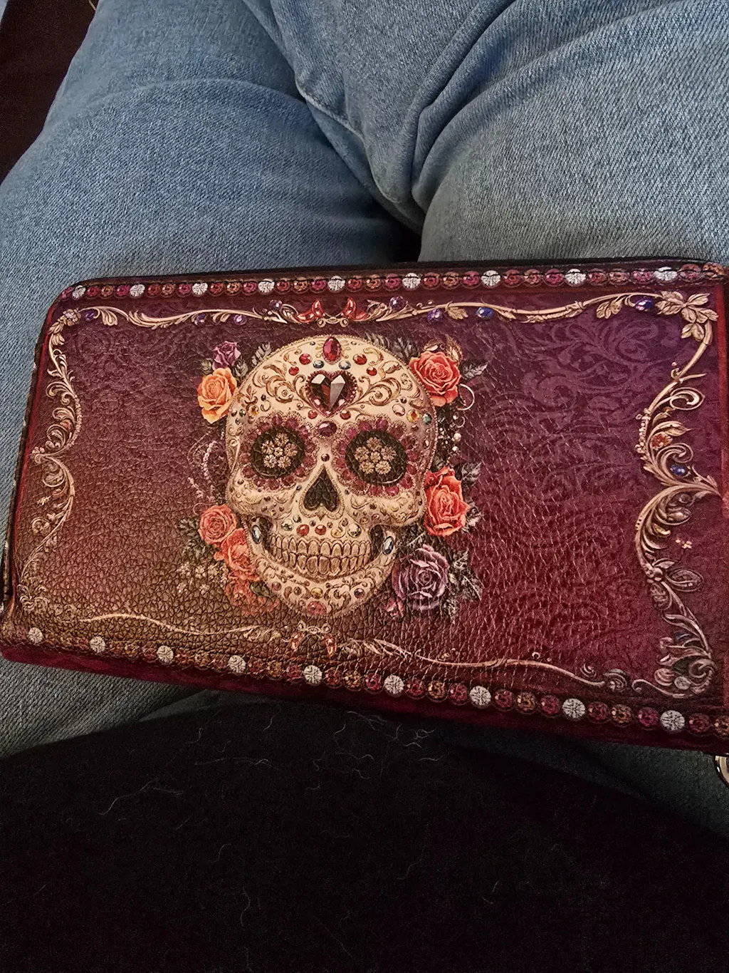 I loved stalking the website I love the purses but being on a limited budget im not able to buy alot for myself and when I got the invite for the Friday the13th sale I jumped at it although I wasn't able to get the backpack I wanted I was able to snag this wallet needless to say I was blown away I just love it and the fact that it comes with a strap to carry it makes it even more versatile for me im not a princess I identify more on the dark and villainous side and I love that I've found a place to express myself...Thanks Skullette from those of us who dare to be ourselves.