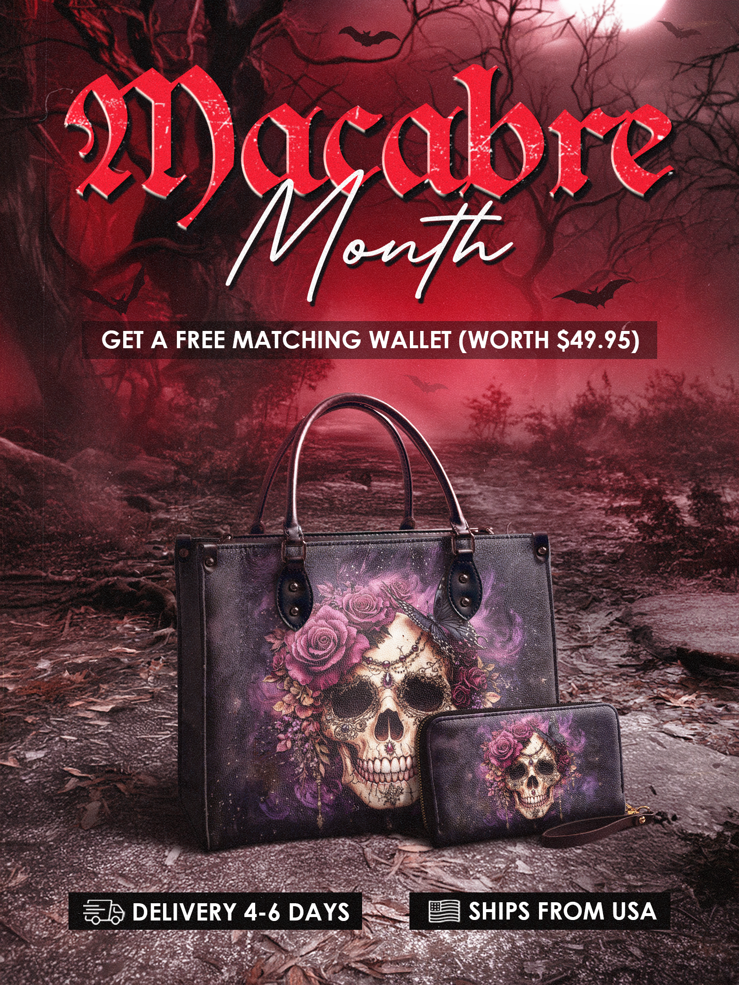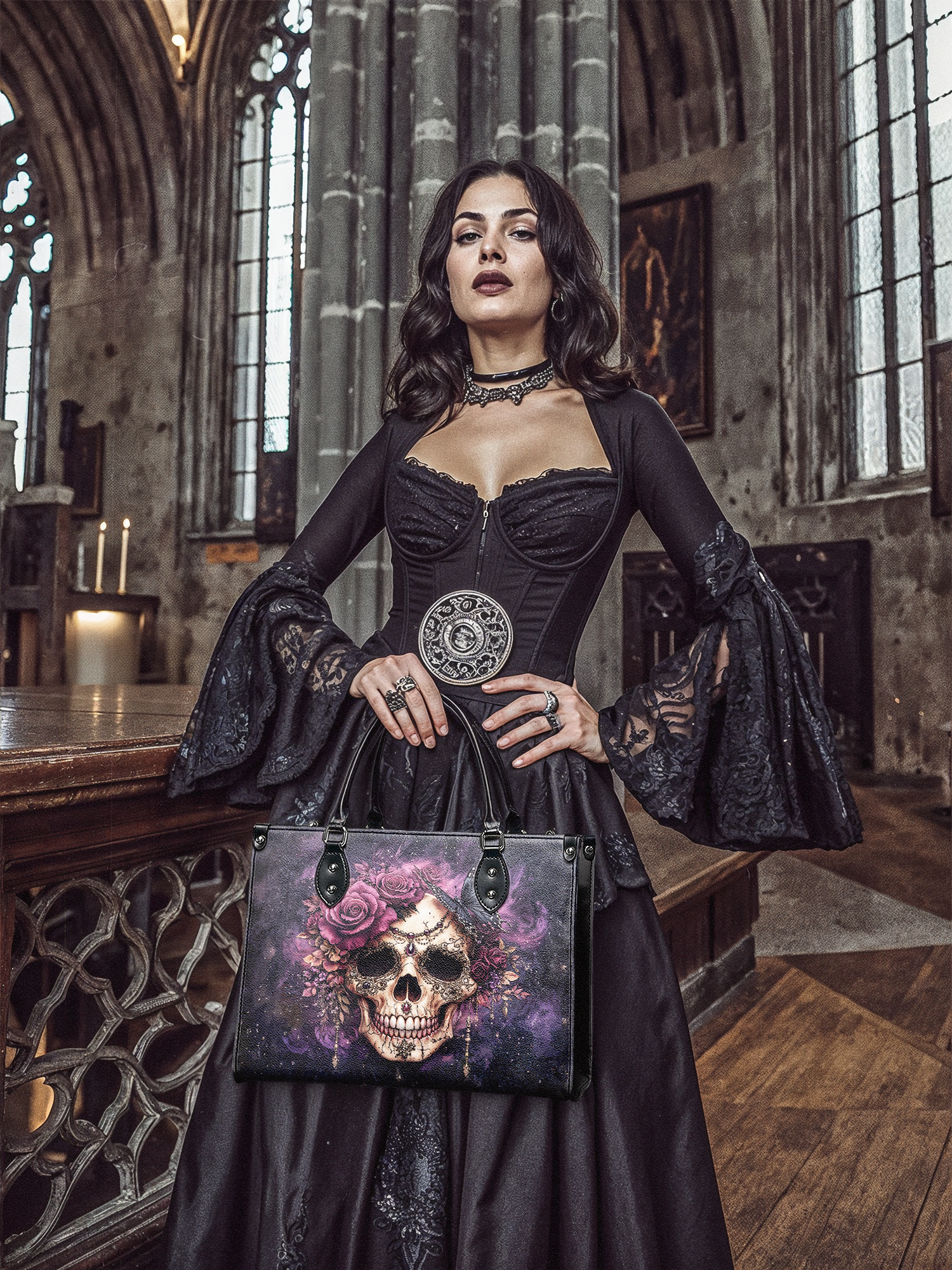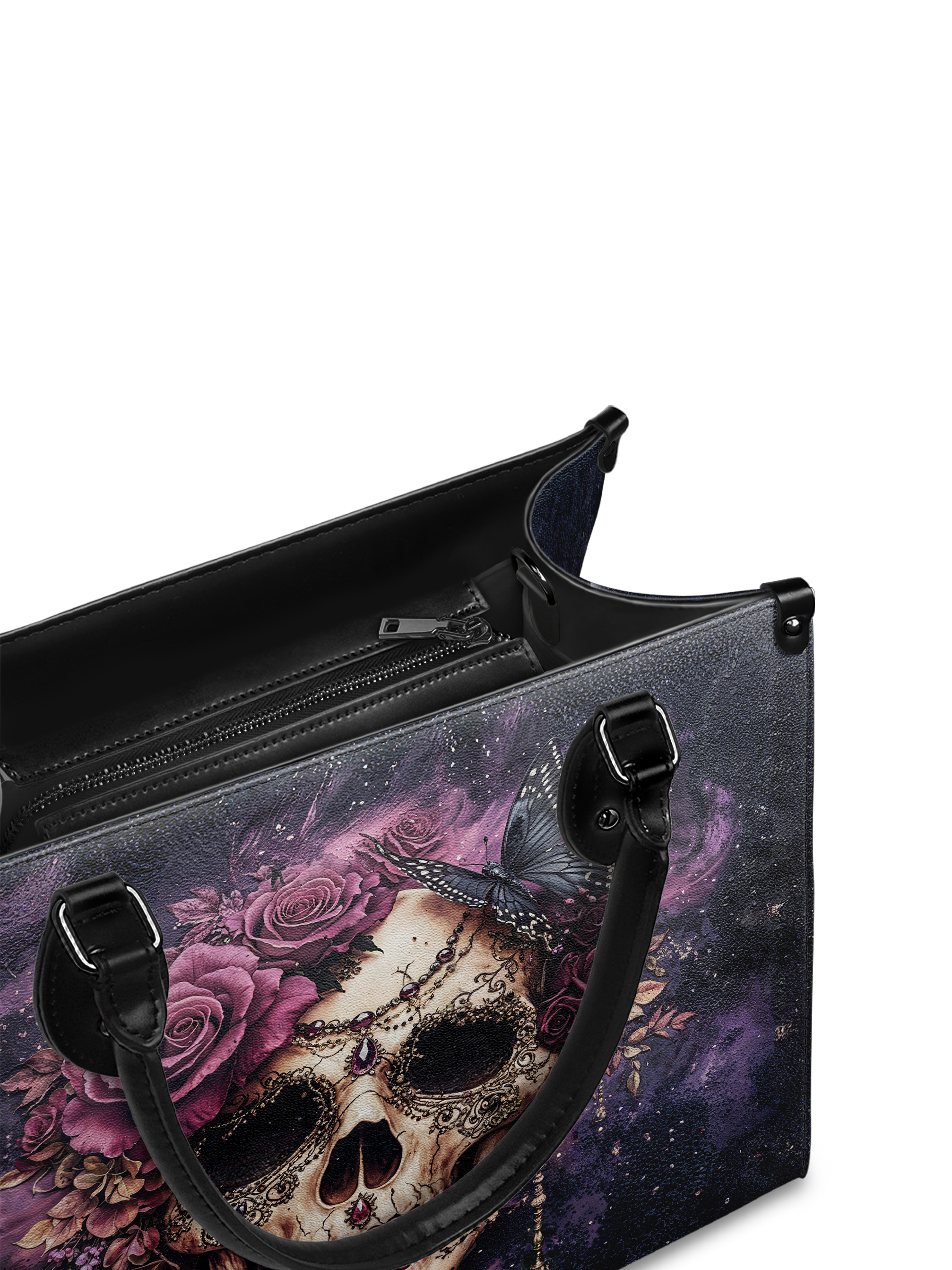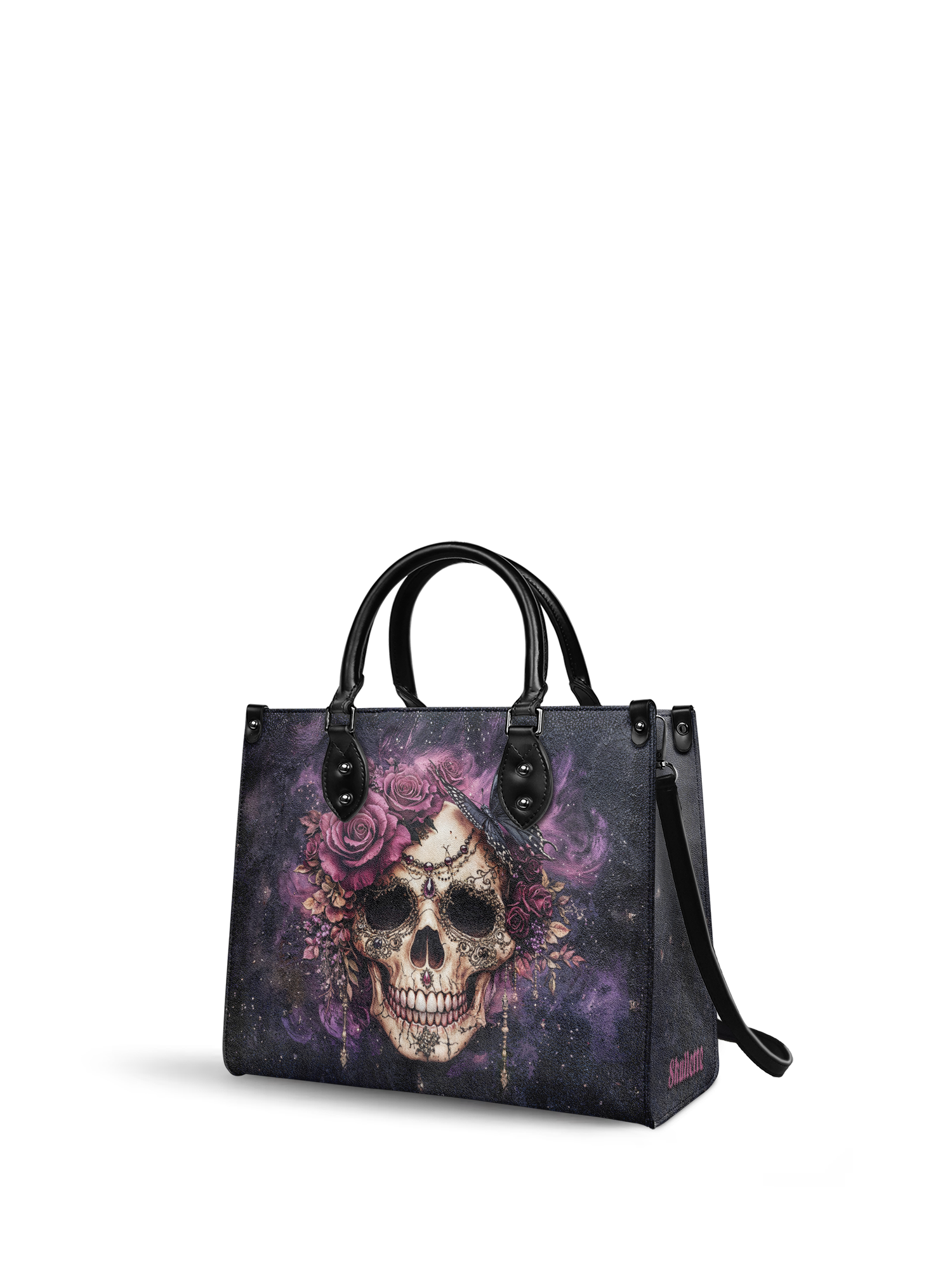 The Noxaria leather handbag is a dark symphony of elegance and mystery. At its center, a regal skull adorned with intricate filigree, deep magenta roses, and glistening jewels commands attention—while a black butterfly rests atop as if to whisper secrets from beyond. Set against a smoky, cosmic backdrop, this bag is made for those who find beauty in the macabre. Crafted from premium vegan leather with structured handles and gold-tone accents, Noxaria carries your essentials—and your essence—with unapologetic allure.