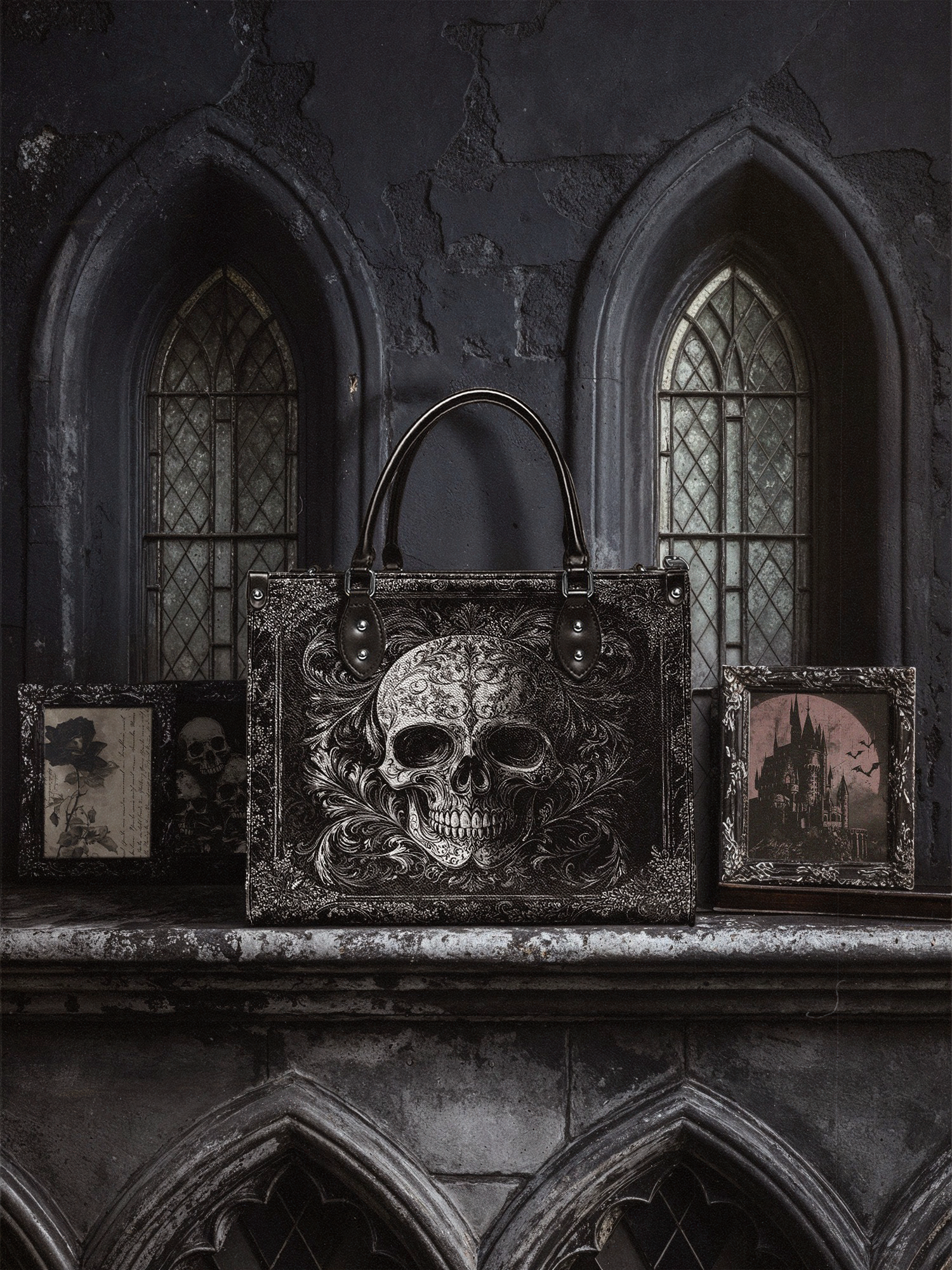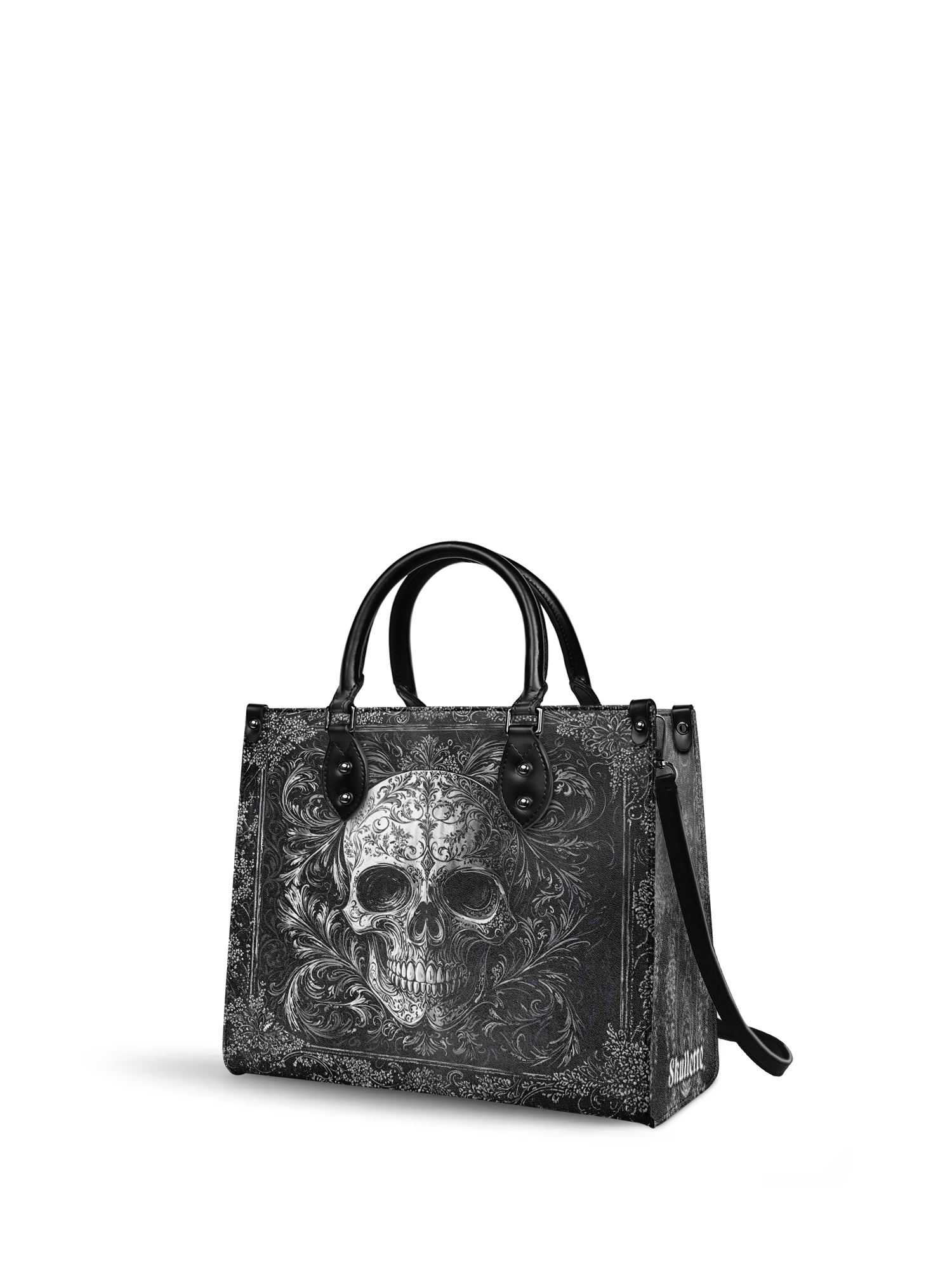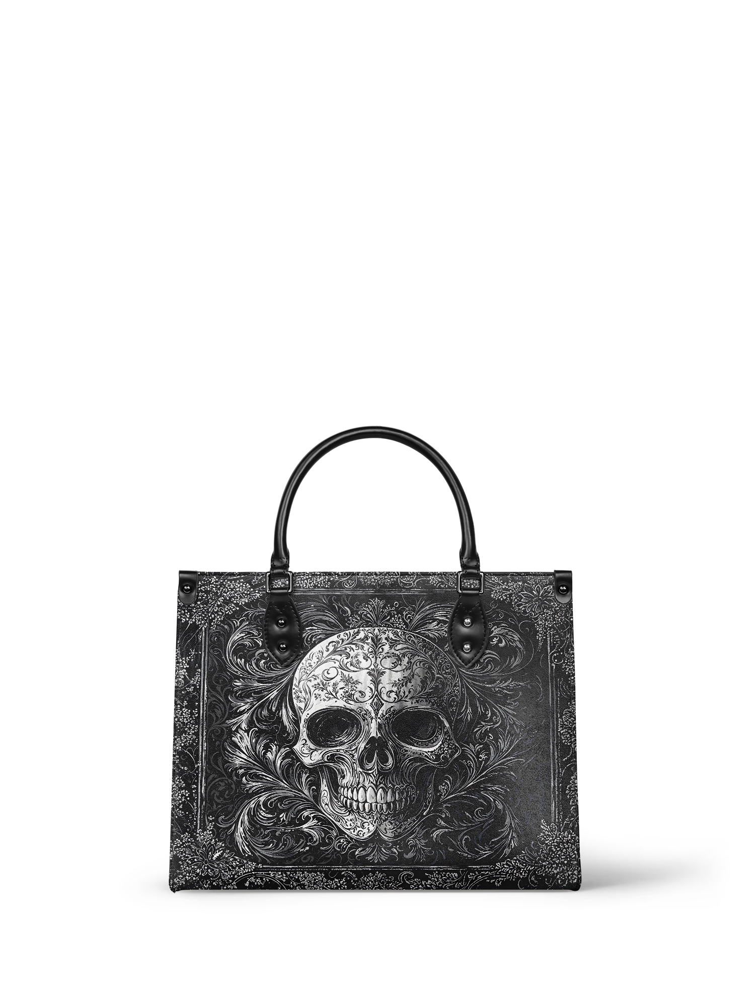 The Obscuria leather handbag is gothic elegance in its purest form. Featuring a silver-etched skull surrounded by swirling baroque filigree, this bag radiates dark luxury and unapologetic edge. Crafted from premium vegan leather, it’s both durable and dramatic—perfect for those who walk the line between shadow and style. With structured handles and a spacious interior, Obscuria is made for the bold soul who doesn’t just carry a bag—she carries a statement.