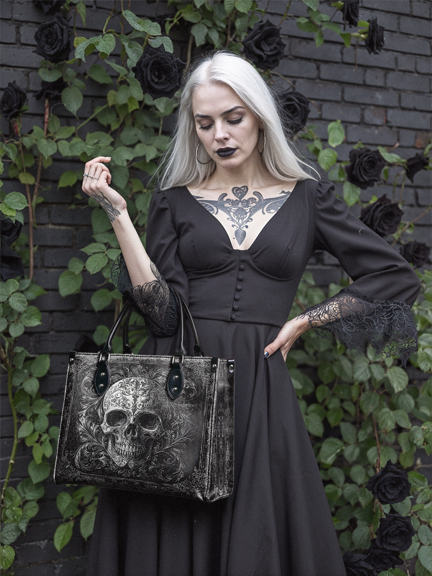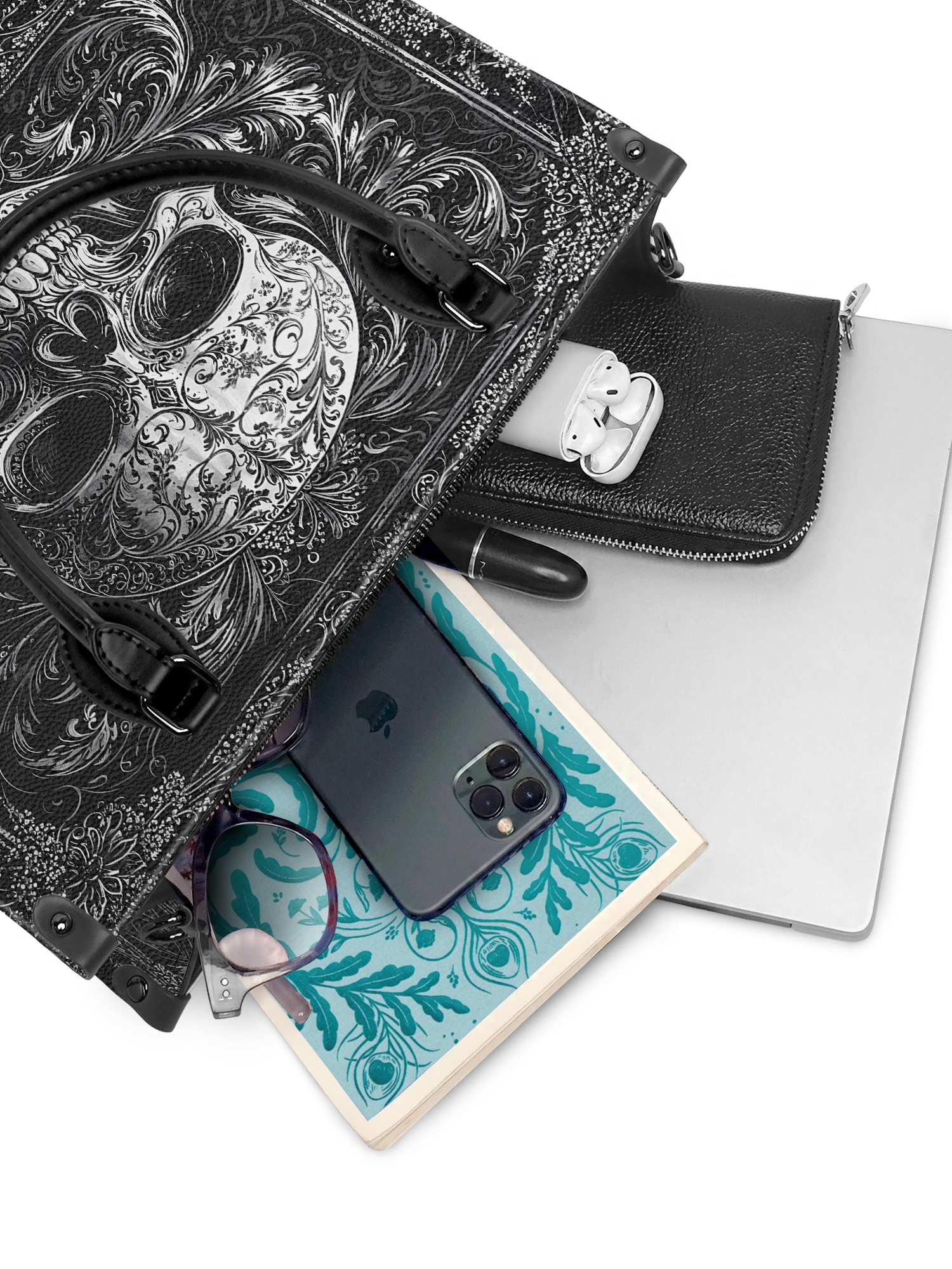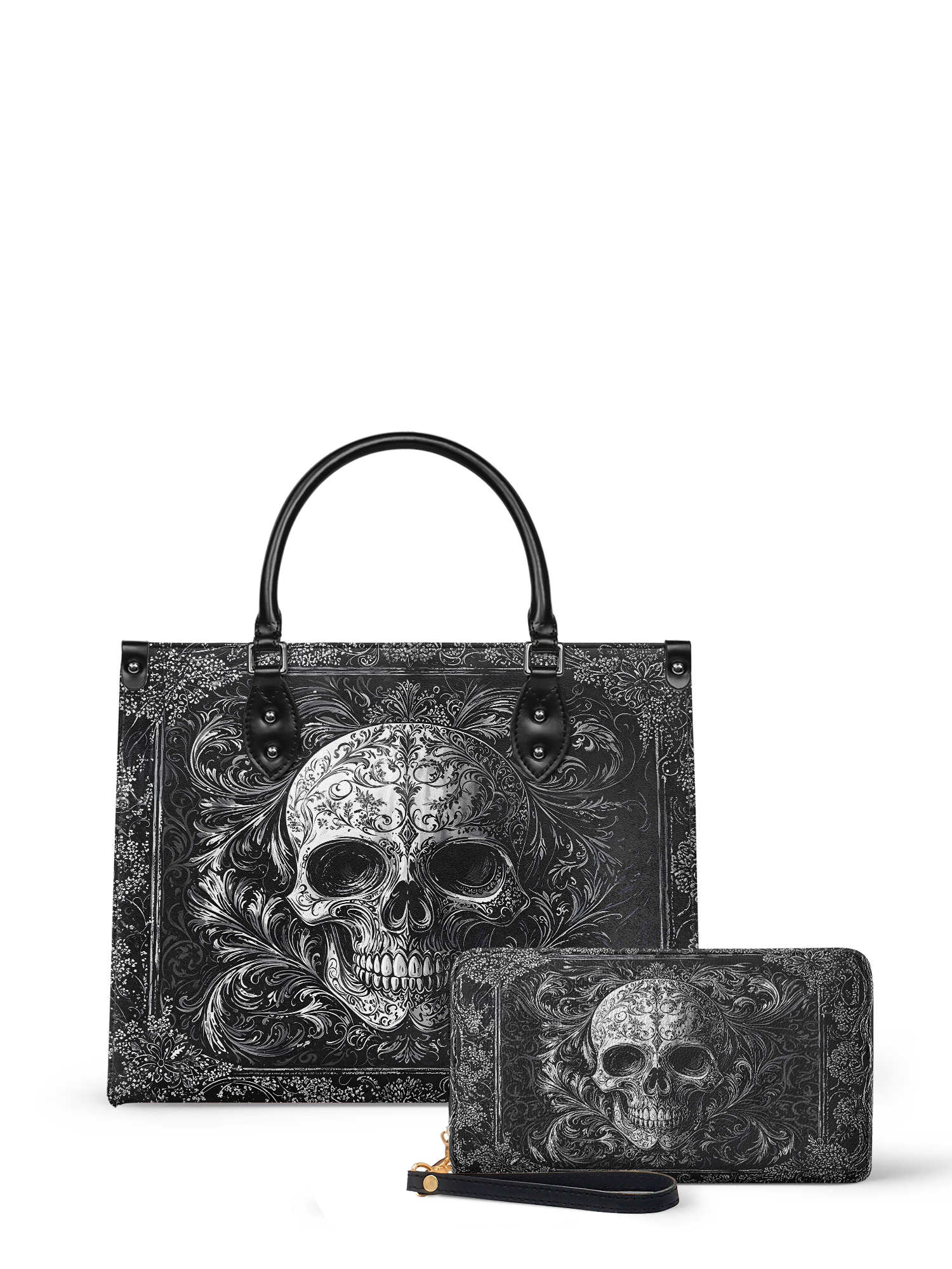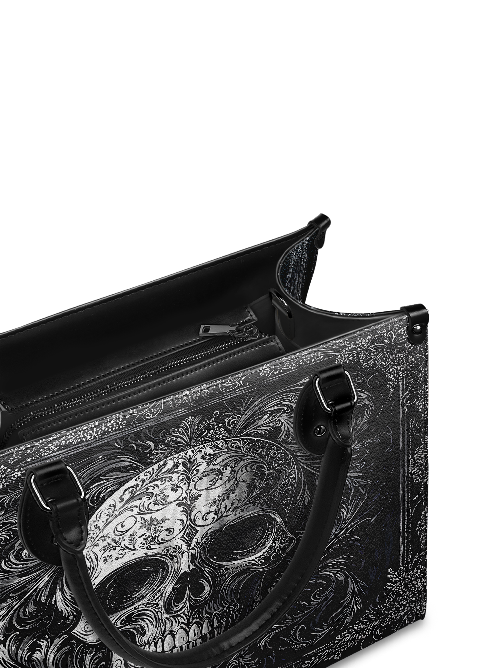 The Obscuria leather handbag is gothic elegance in its purest form. Featuring a silver-etched skull surrounded by swirling baroque filigree, this bag radiates dark luxury and unapologetic edge. Crafted from premium vegan leather, it’s both durable and dramatic—perfect for those who walk the line between shadow and style. With structured handles and a spacious interior, Obscuria is made for the bold soul who doesn’t just carry a bag—she carries a statement.