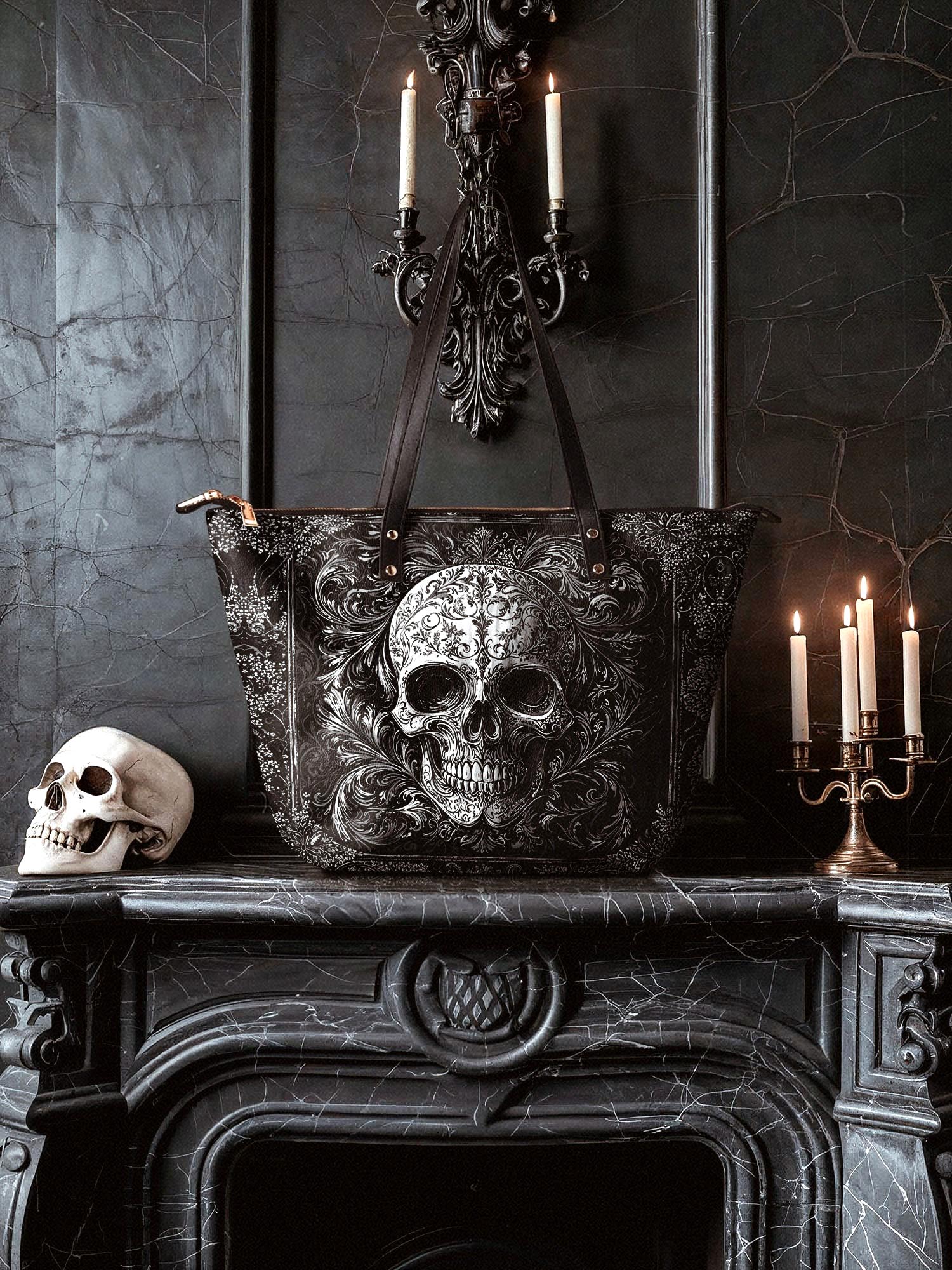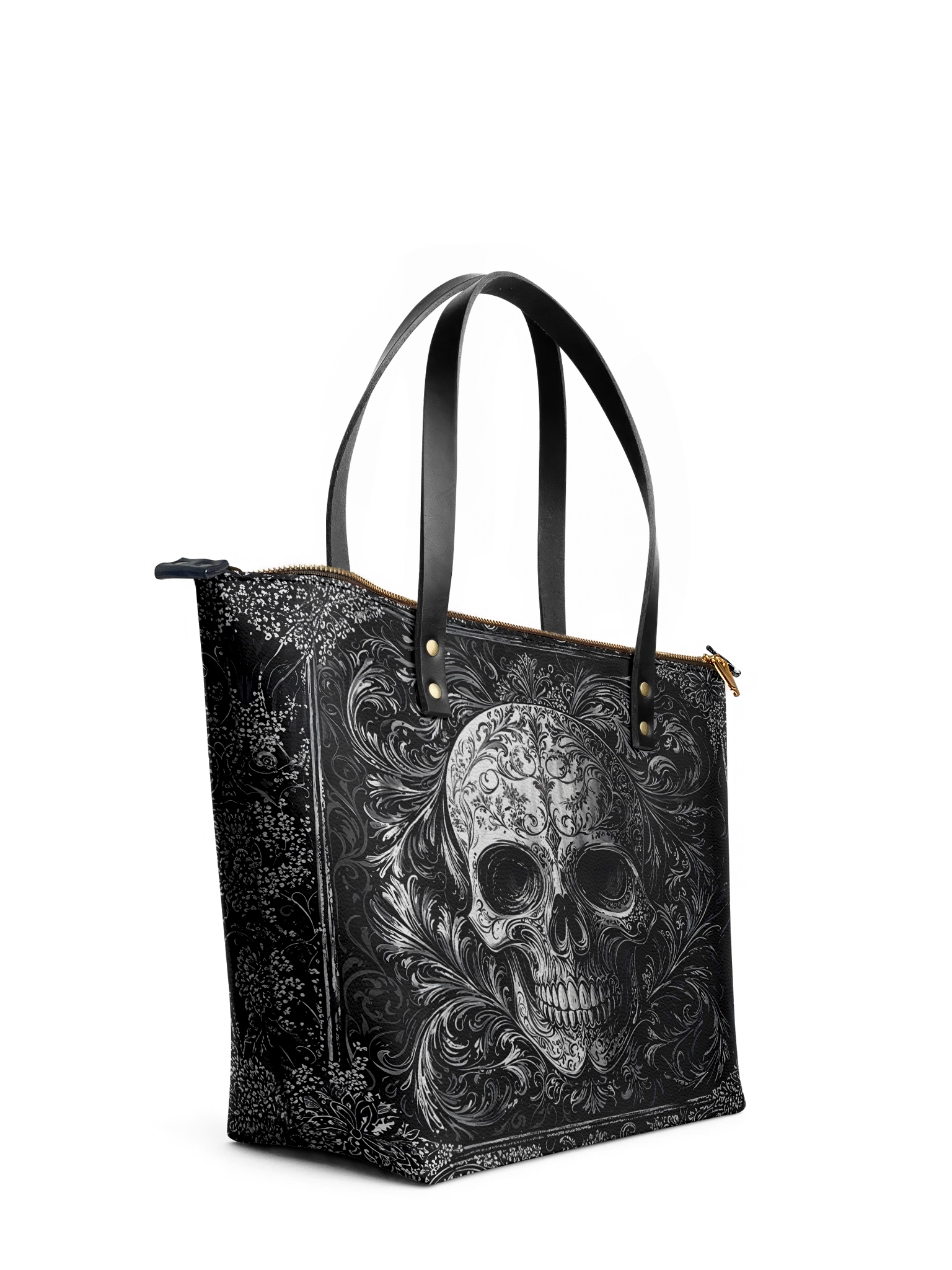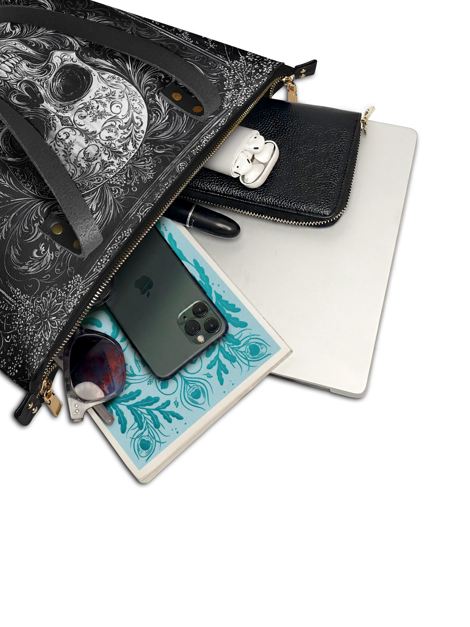 The Obscuria leather tote bag is your new go-to for dark, commanding style. A hauntingly ornate skull emerges from a swirl of gothic filigree—etched in silver over deep black vegan leather. It's bold. It's baroque. And it carries serious attitude. With long shoulder straps and a roomy zippered interior, this tote blends function with fierce fashion. Whether you’re headed to the bookstore, coffee shop, or the shadows of the night—Obscuria makes sure you arrive in statement-making style.