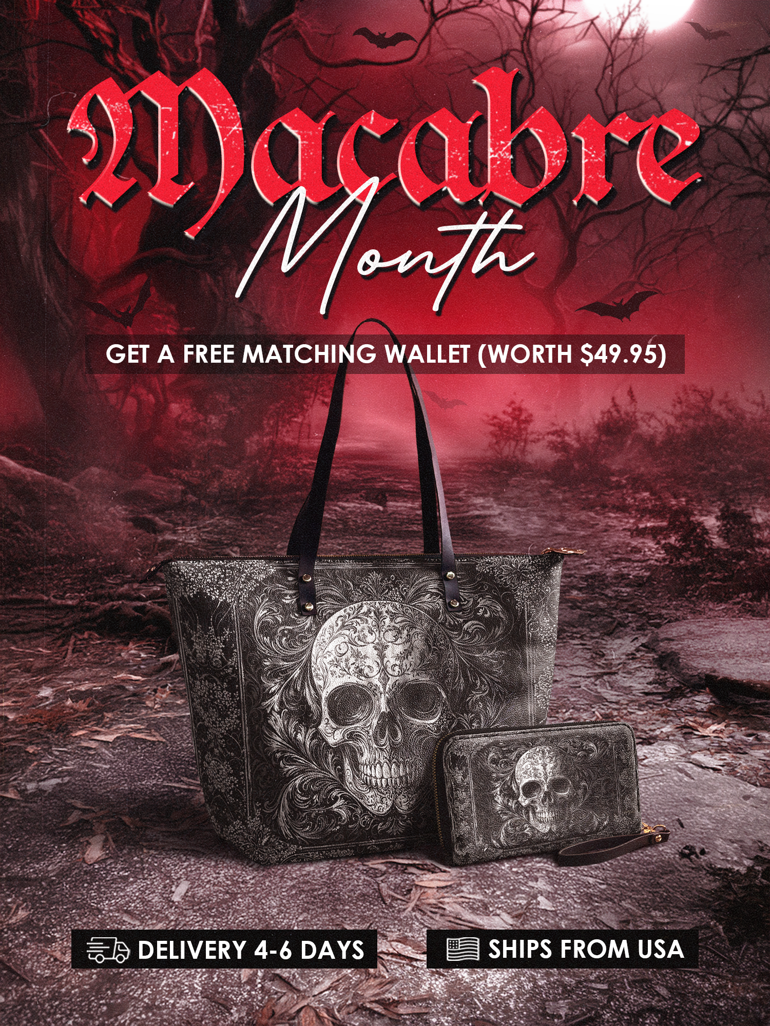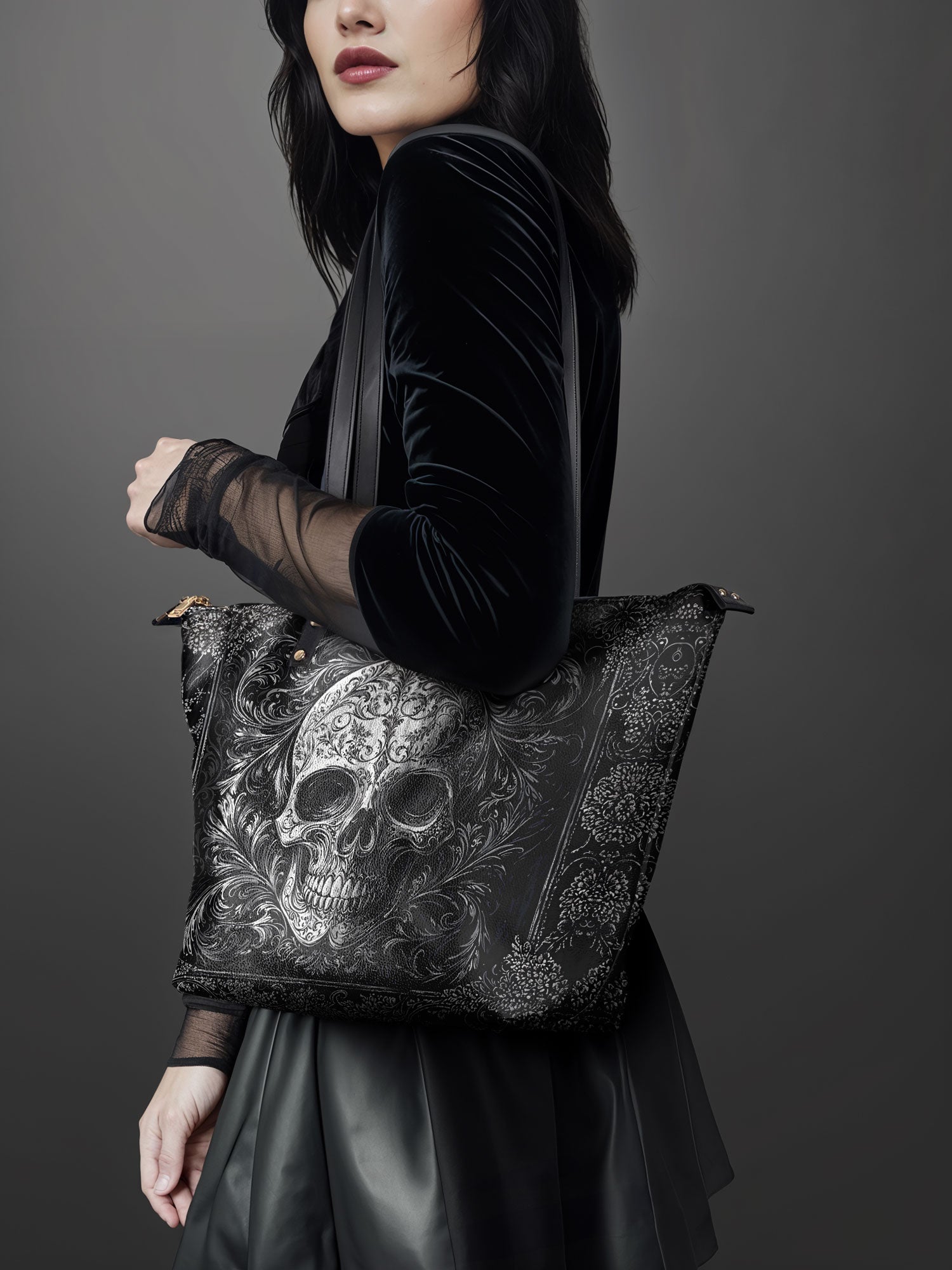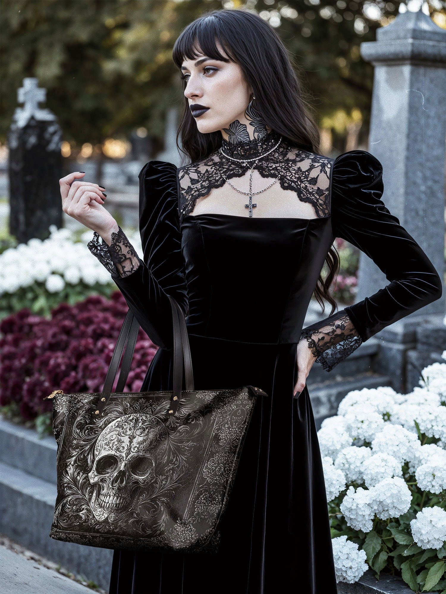 The Obscuria leather tote bag is your new go-to for dark, commanding style. A hauntingly ornate skull emerges from a swirl of gothic filigree—etched in silver over deep black vegan leather. It's bold. It's baroque. And it carries serious attitude. With long shoulder straps and a roomy zippered interior, this tote blends function with fierce fashion. Whether you’re headed to the bookstore, coffee shop, or the shadows of the night—Obscuria makes sure you arrive in statement-making style.