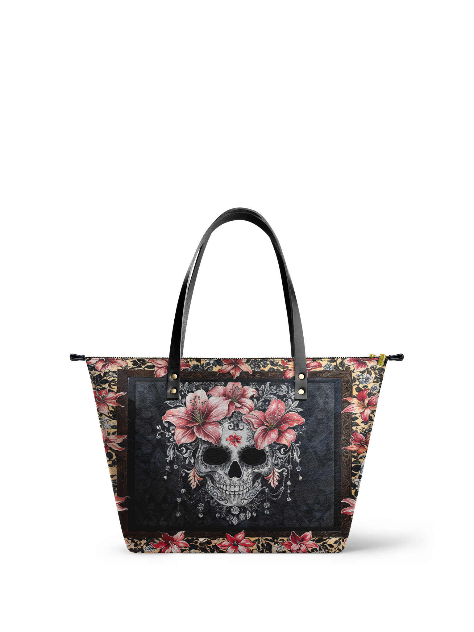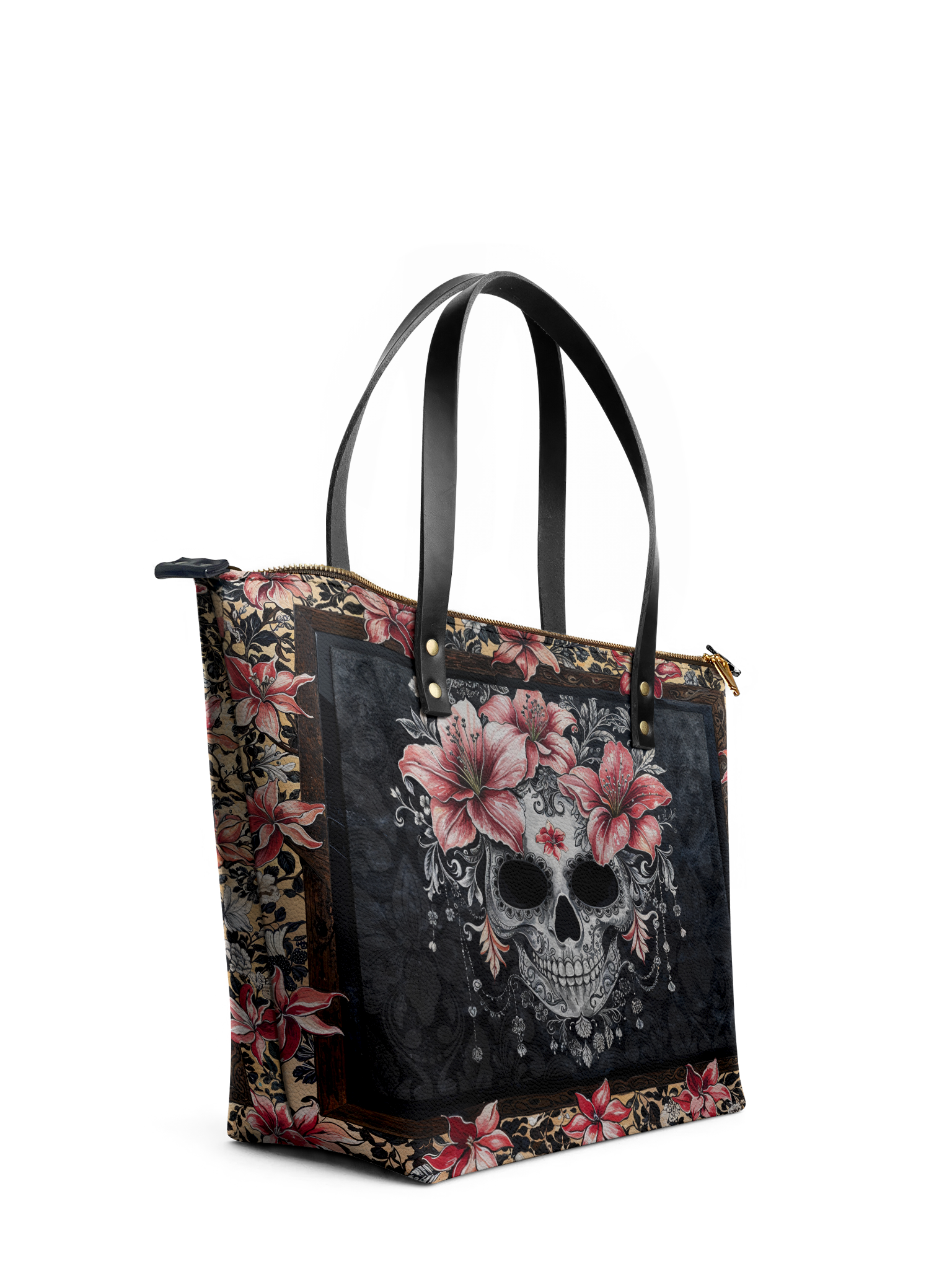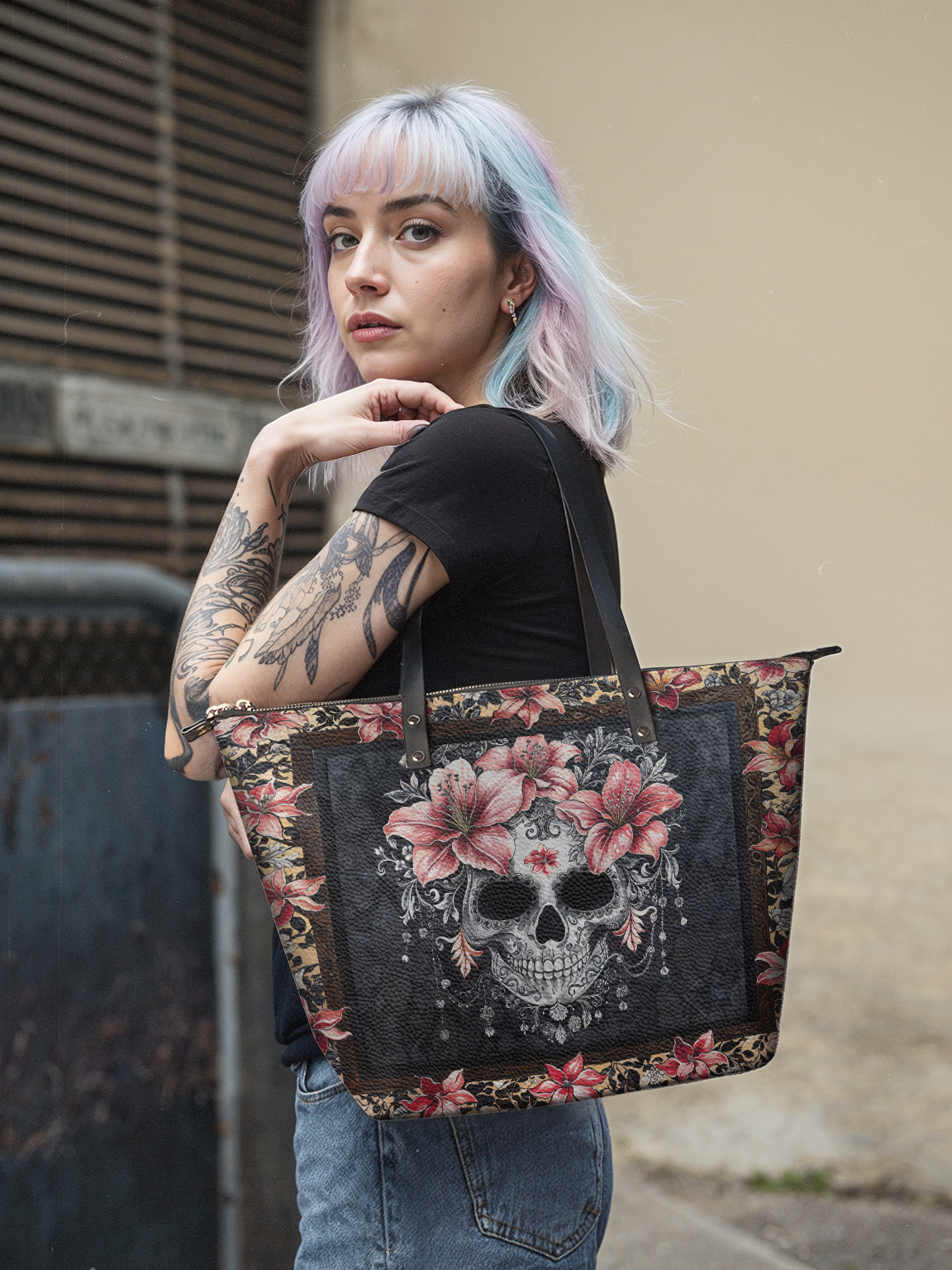 The "Roselace" leather tote is roomy, edgy, and full of vibes. That skull-and-flower design? It turns heads. The leather? Soft and strong. And yes, it zips—so your stuff stays safe.