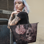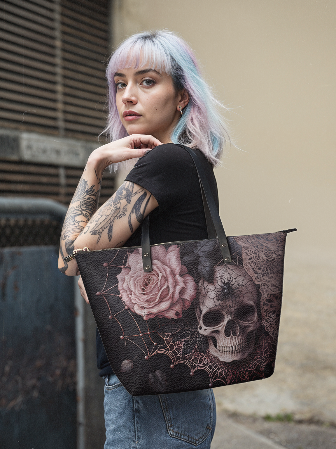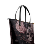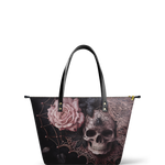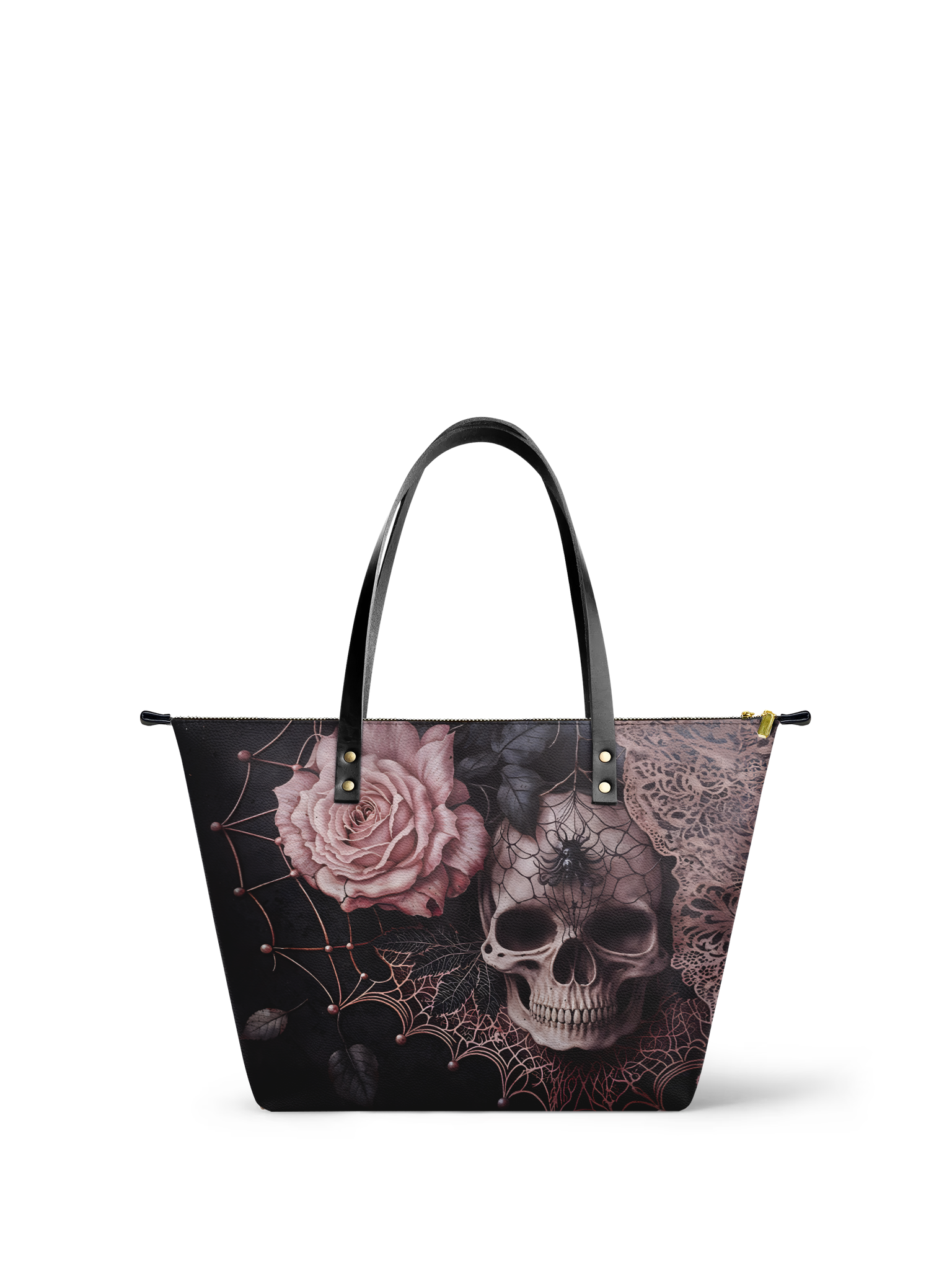 The Venomina leather tote bag is a haunting masterpiece made for the elegantly sinister. Featuring a delicate yet deadly design—an ivory skull crowned with a spider, nestled among dusky roses and webs—it’s the kind of bag that whispers gothic poetry with every glance. Crafted from premium vegan leather with strong shoulder straps and a spacious zip-top interior, this tote isn’t just about looks—it’s built to carry your secrets, spells, and everyday essentials. For the femme fatale who blooms in the shadows.